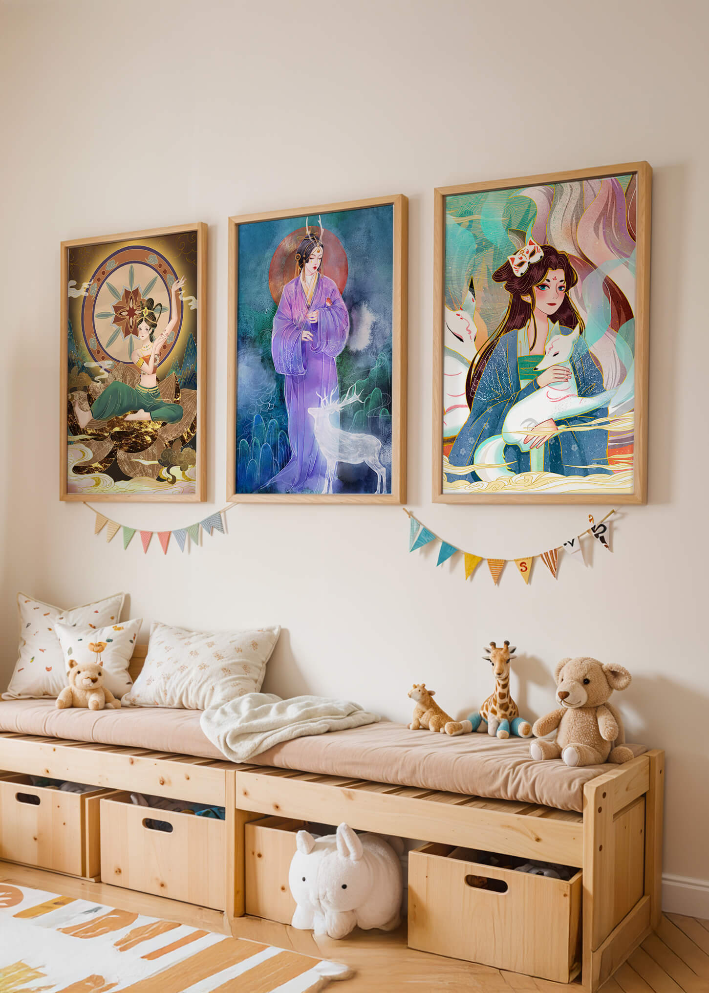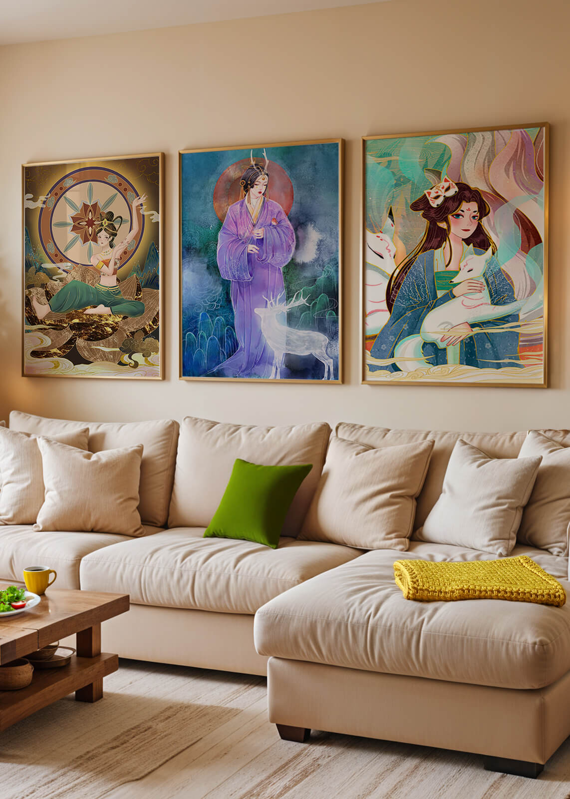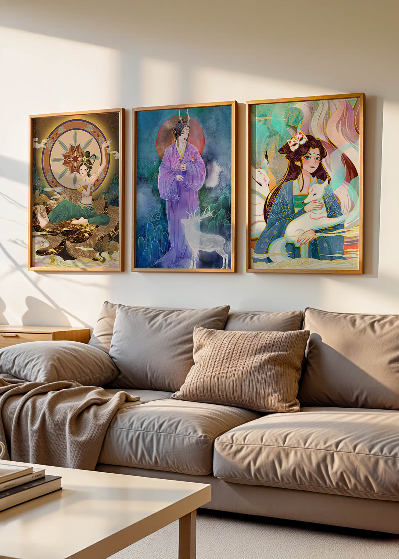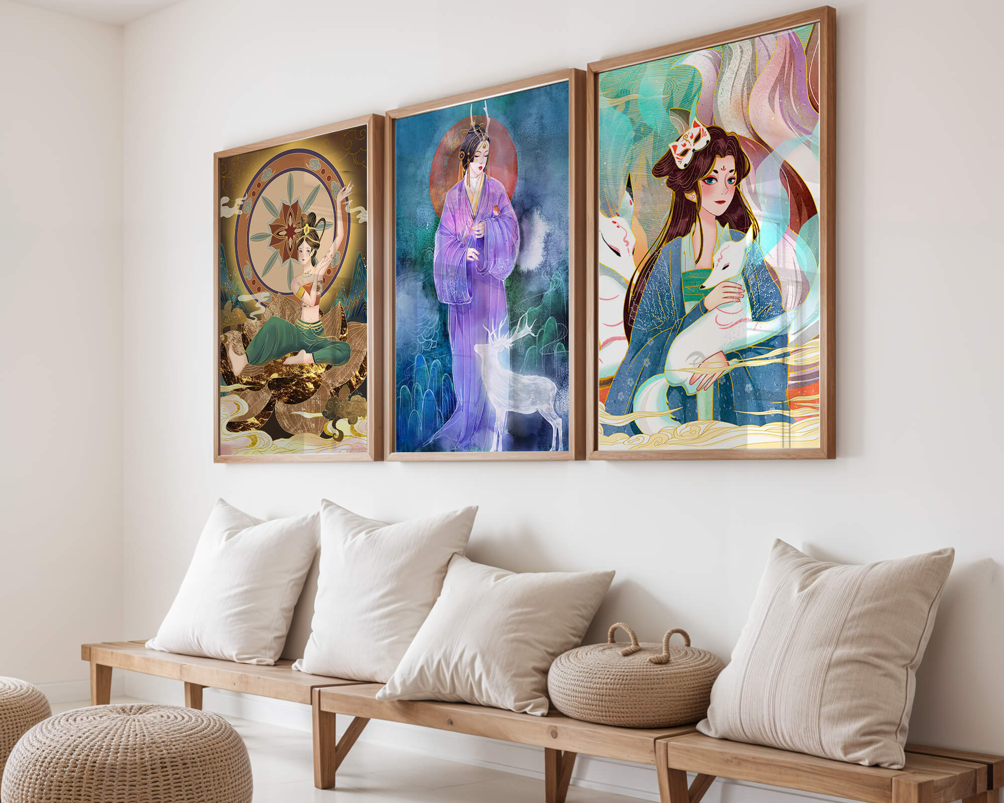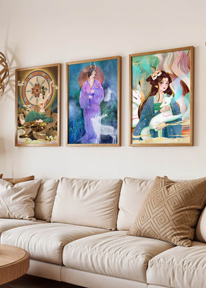 Este conjunto de impresiones artísticas presenta figuras místicas y elementos orientales enmarcados sin marco. Las tres obras muestran ilustraciones vibrantes y detalladas que capturan la esencia de la cultura oriental.
