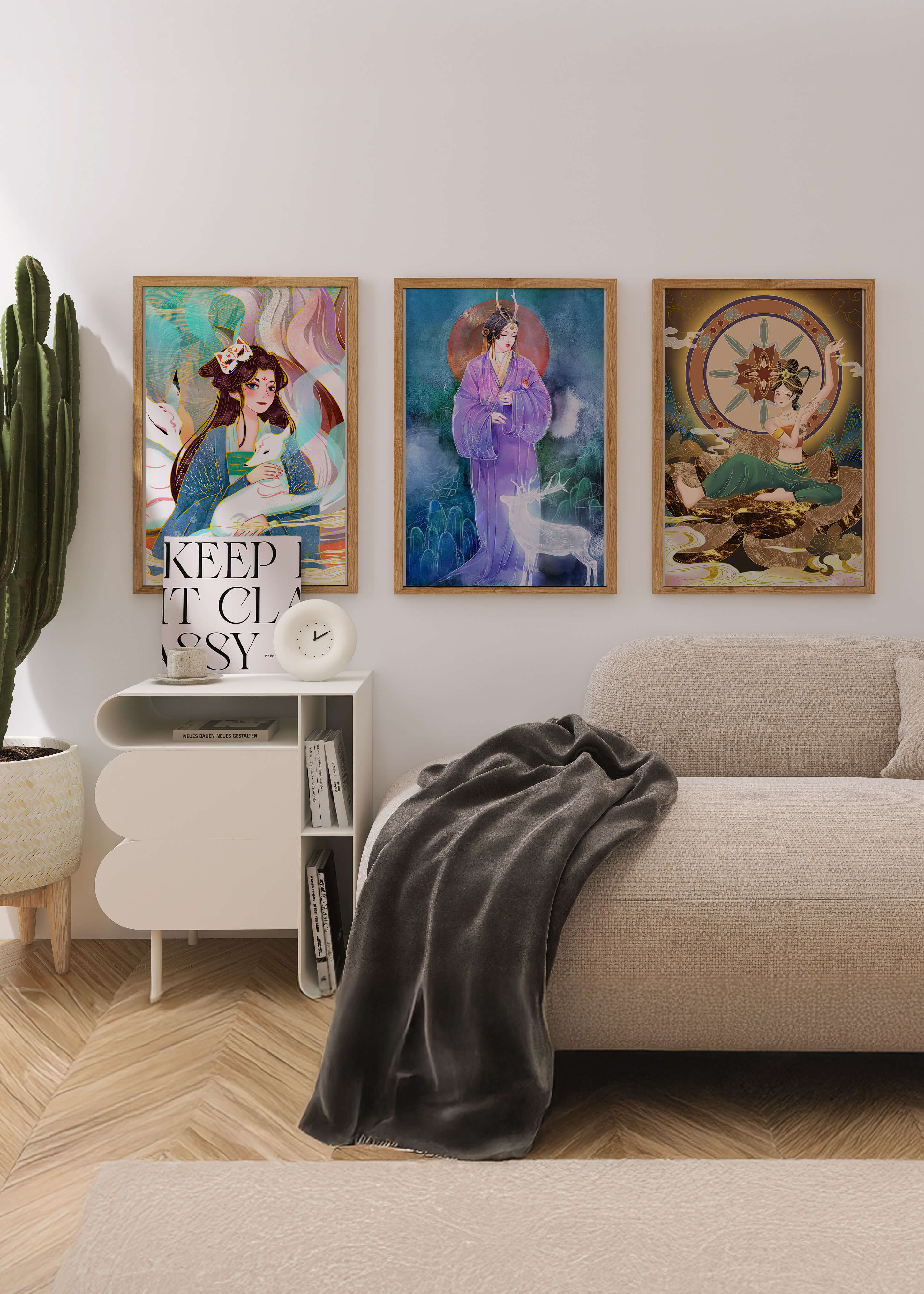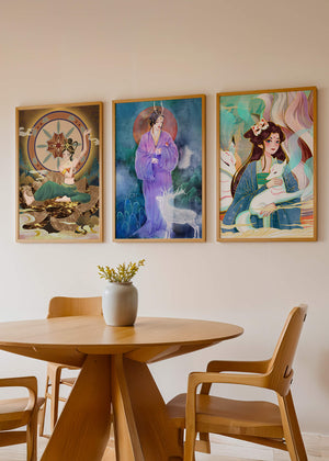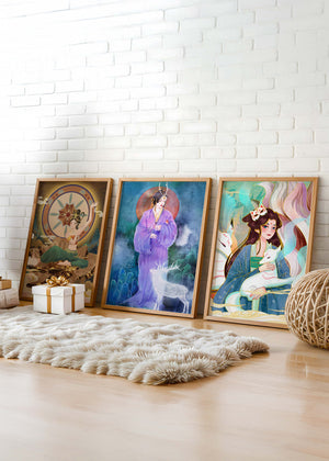 En esta imagen, tres impresiones artísticas se exhiben sobre un suelo de madera clara. Las obras destacan por su hermosa paleta de colores y sus detalladas ilustraciones, cada una mostrando diferentes figuras femeninas rodeadas de elementos mitológicos. La ausencia de marcos permite que el arte sea el enfoque principal, invitando al espectador a apreciar los detalles intrincados y el simbolismo cultural en cada pieza. Cada ilustración parece contar su propia historia, llena de misterio y encanto. Los colores y formas utilizados en estas impresiones reflejan una rica herencia artística, ofreciendo una ventana hacia un mundo de fantasía y belleza. Estas piezas serían una adición impresionante a cualquier espacio que busque incorporar elementos de arte cultural y belleza contemporánea.| Tipo |