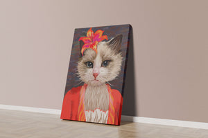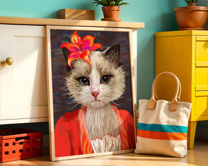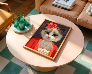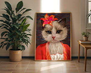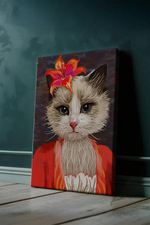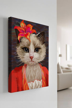 En esta obra de arte, el enfoque principal está en los expresivos ojos del gato, que parecen transmitir una historia de curiosidad y juguetonería. La flor situada sobre la cabeza del gato sirve como un elemento llamativo, mejorando la estética general con sus ricos y vibrantes colores. Los tonos cálidos de la flor y el contraste con el atuendo rojo le dan a la imagen un aire festivo pero elegante. La sutil textura del fondo proporciona profundidad, asegurando que la figura central permanezca como el tema destacado. Esta imagen es ideal para cualquiera que busque añadir un toque de humor y refinamiento a su espacio, lo que la convierte en una elección encantadora tanto para amantes de los animales como para entusiastas del arte.| Tipo |