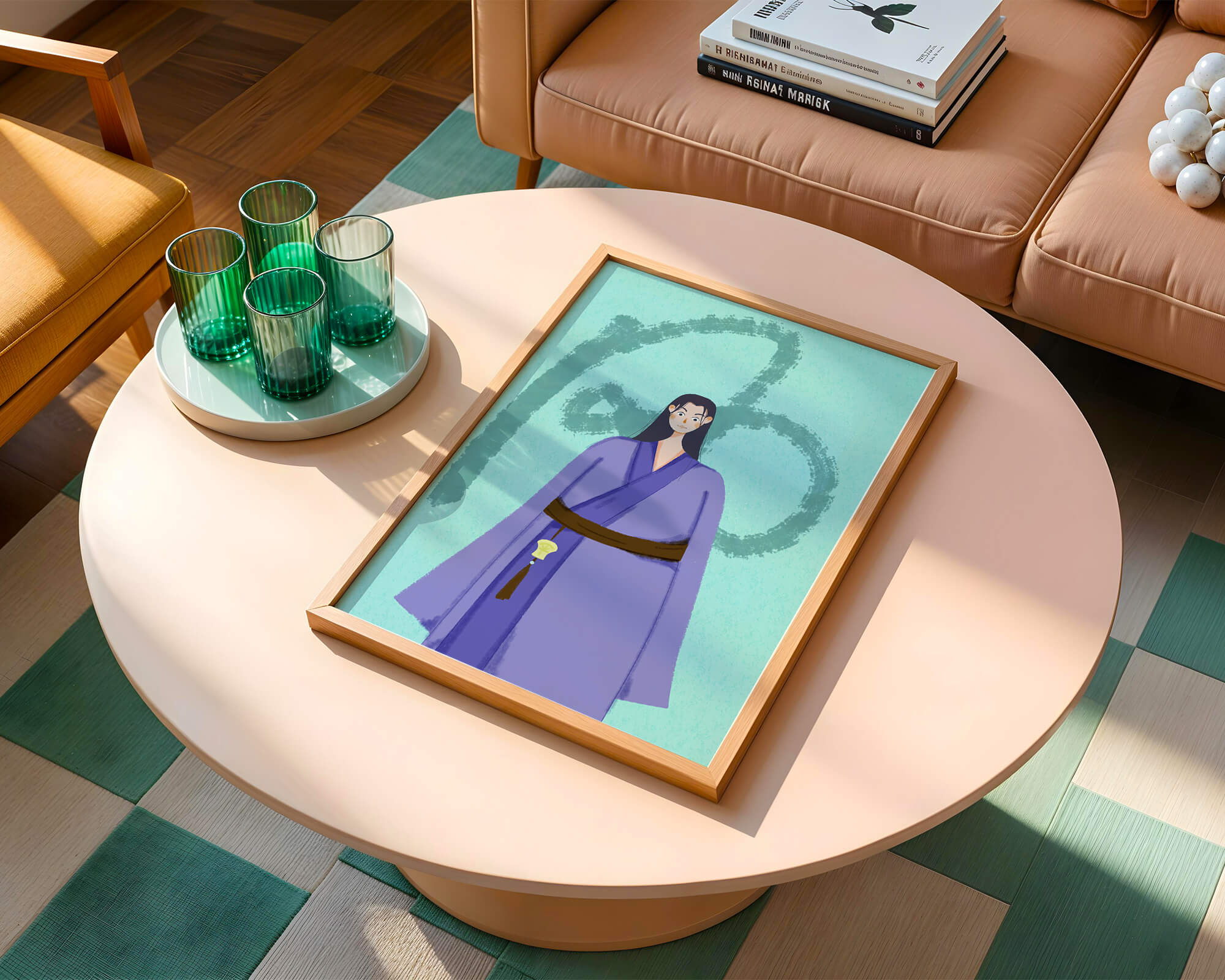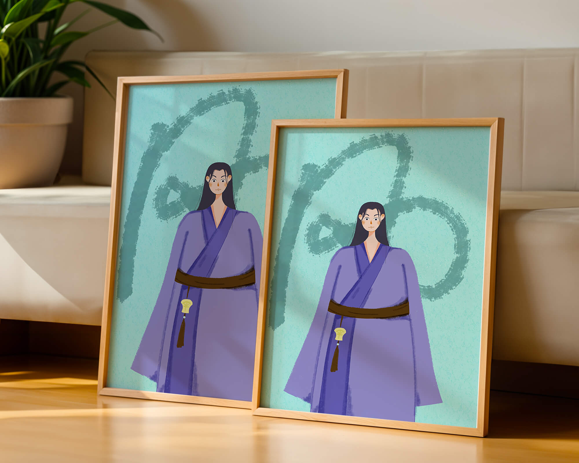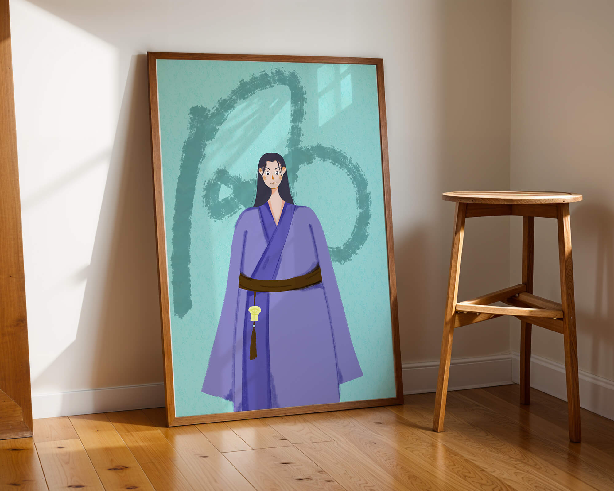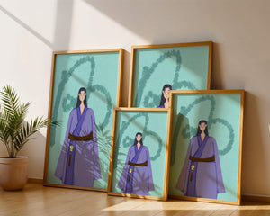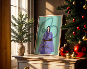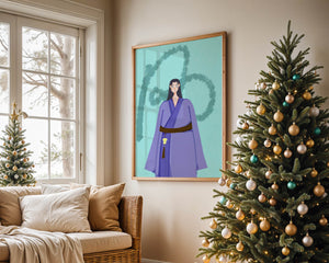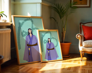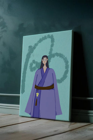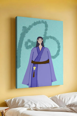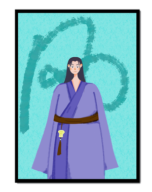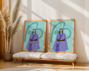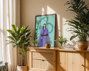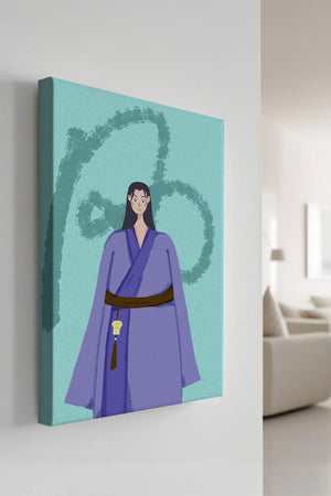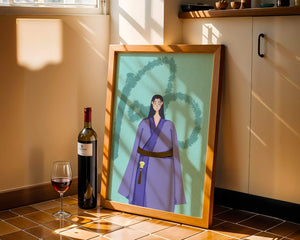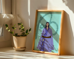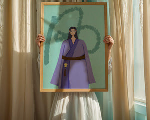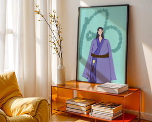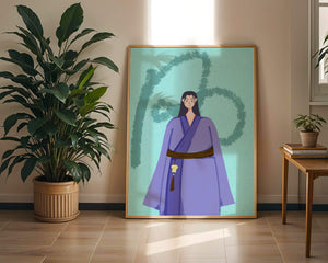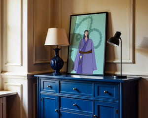 La figura central está adornada con una túnica azul, evocadora de estilos clásicos. El elaborado traje se ve realzado por un cinturón contrastante. La elección de colores del artista y la postura serena del personaje contribuyen a la elegancia general de la obra. En el fondo, un sutil patrón texturizado añade profundidad y dimensión a la imagen, ofreciendo un giro moderno a temas tradicionales. La combinación de ropa tradicional y elementos artísticos contemporáneos da como resultado una experiencia visual única que capta la atención del espectador.| Tipo |