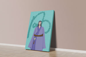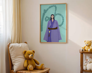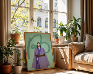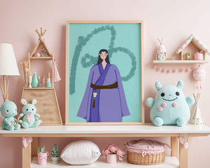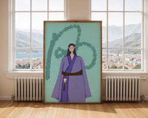 Esta imagen cautivadora presenta un personaje vestido con atuendo tradicional sobre un fondo texturizado. El uso de colores vibrantes y diseño artístico la convierte en una pieza visualmente impactante.