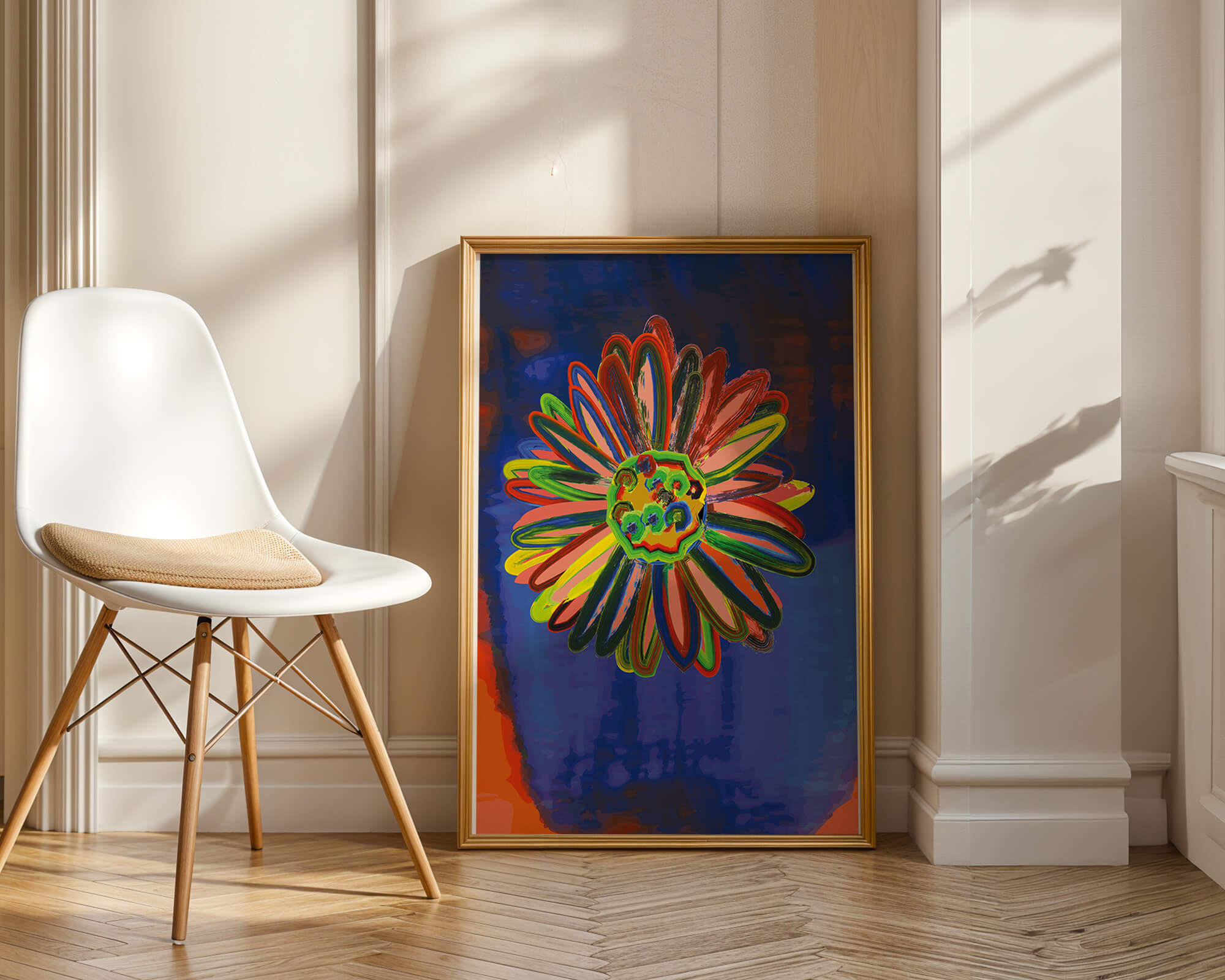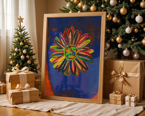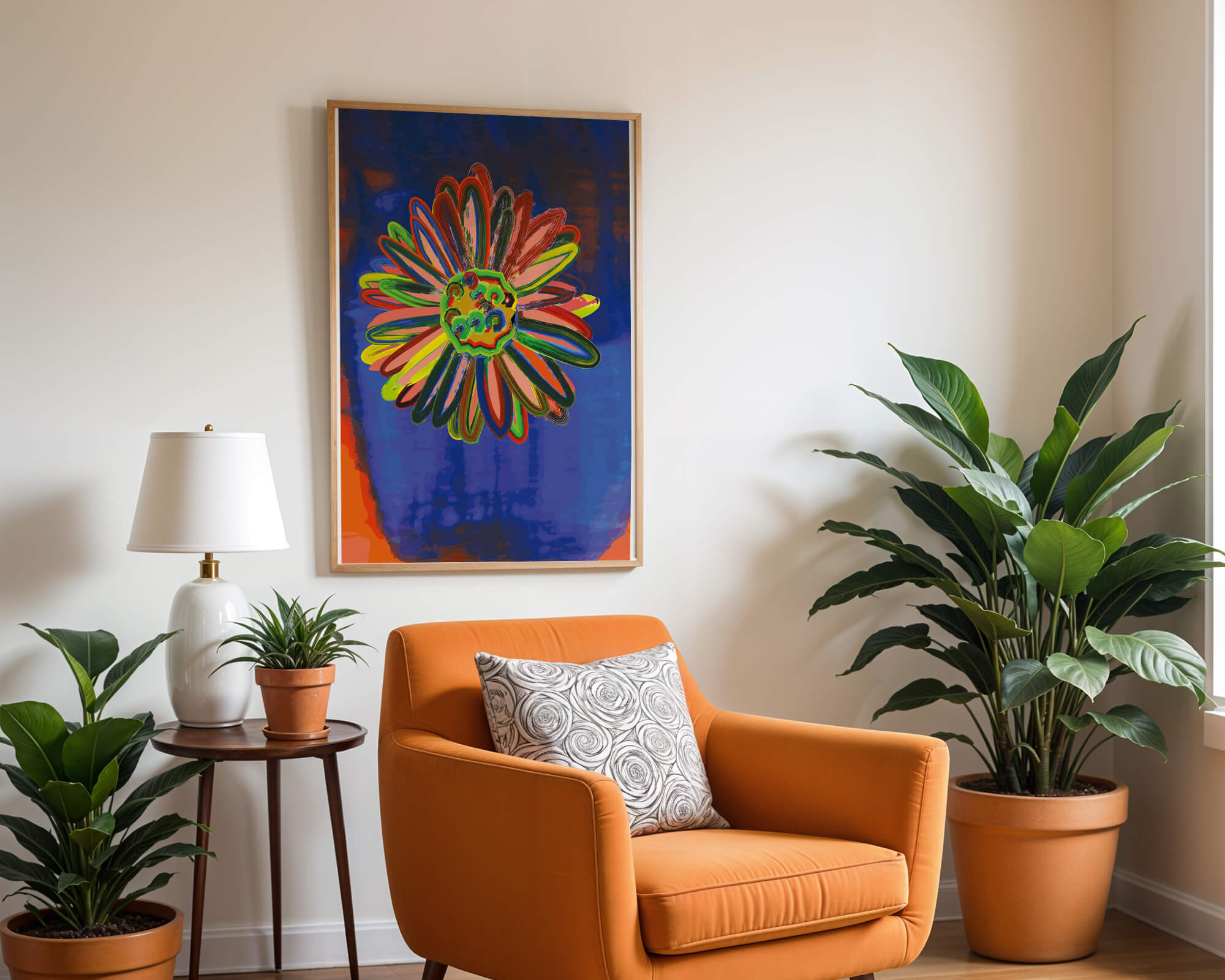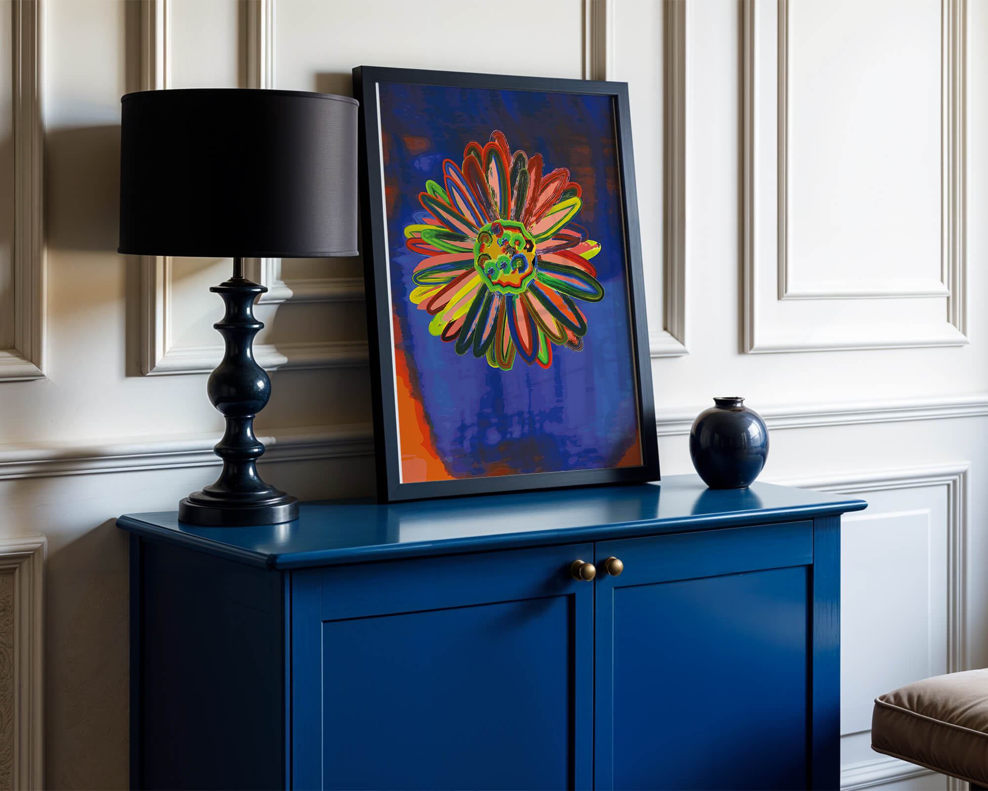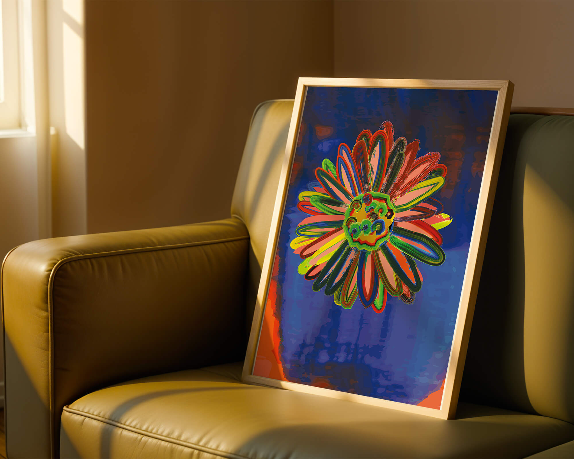 La flor abstracta representada en esta obra irradia energía, con sus pétalos pintados en una rica variedad de tonos cálidos y fríos. La combinación de rojos, azules, verdes y amarillos crea una cautivadora danza visual que atrae la atención del espectador. Sobre un fondo azul profundo, los coloridos pétalos de la flor irradian hacia afuera, evocando un sentido de movimiento y vida. Esta pieza es perfecta para aquellos que buscan añadir un toque de creatividad y vitalidad a su sala de estar u otra área que necesite un punto focal. Su estética moderna se alinea bien con diseños de interiores contemporáneos, convirtiéndola no solo en una obra de arte, sino en una declaración.| Tipo |