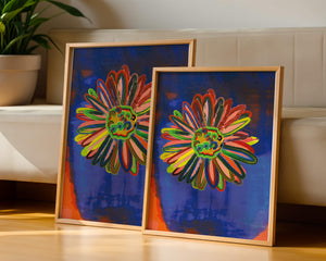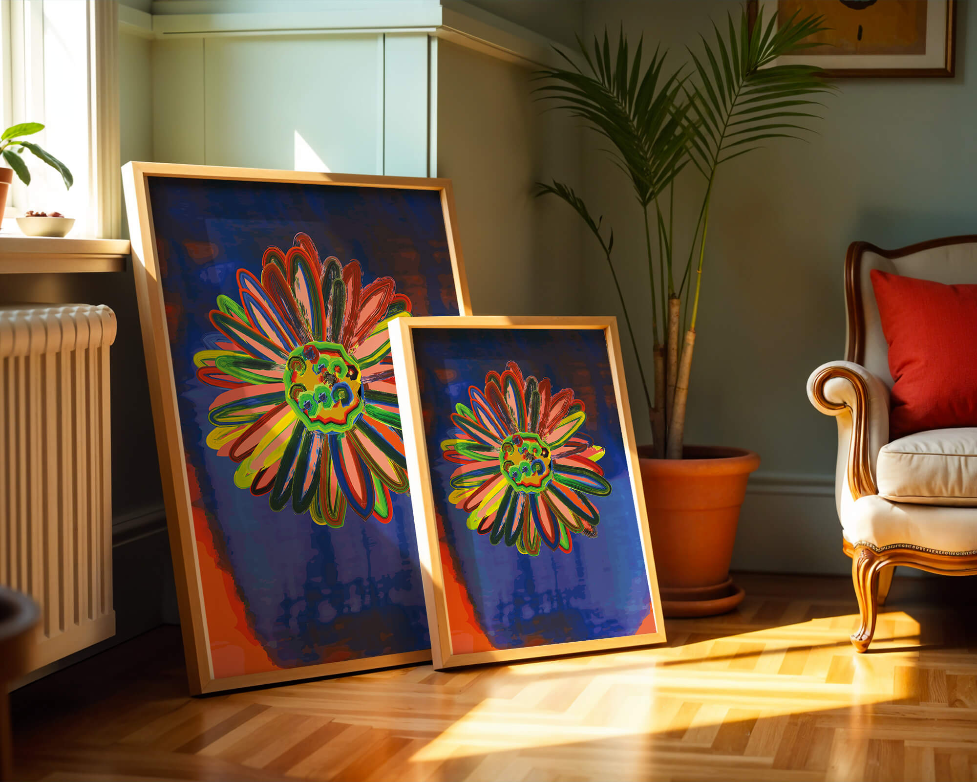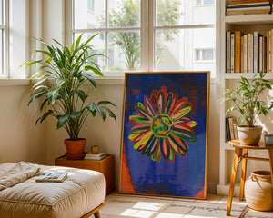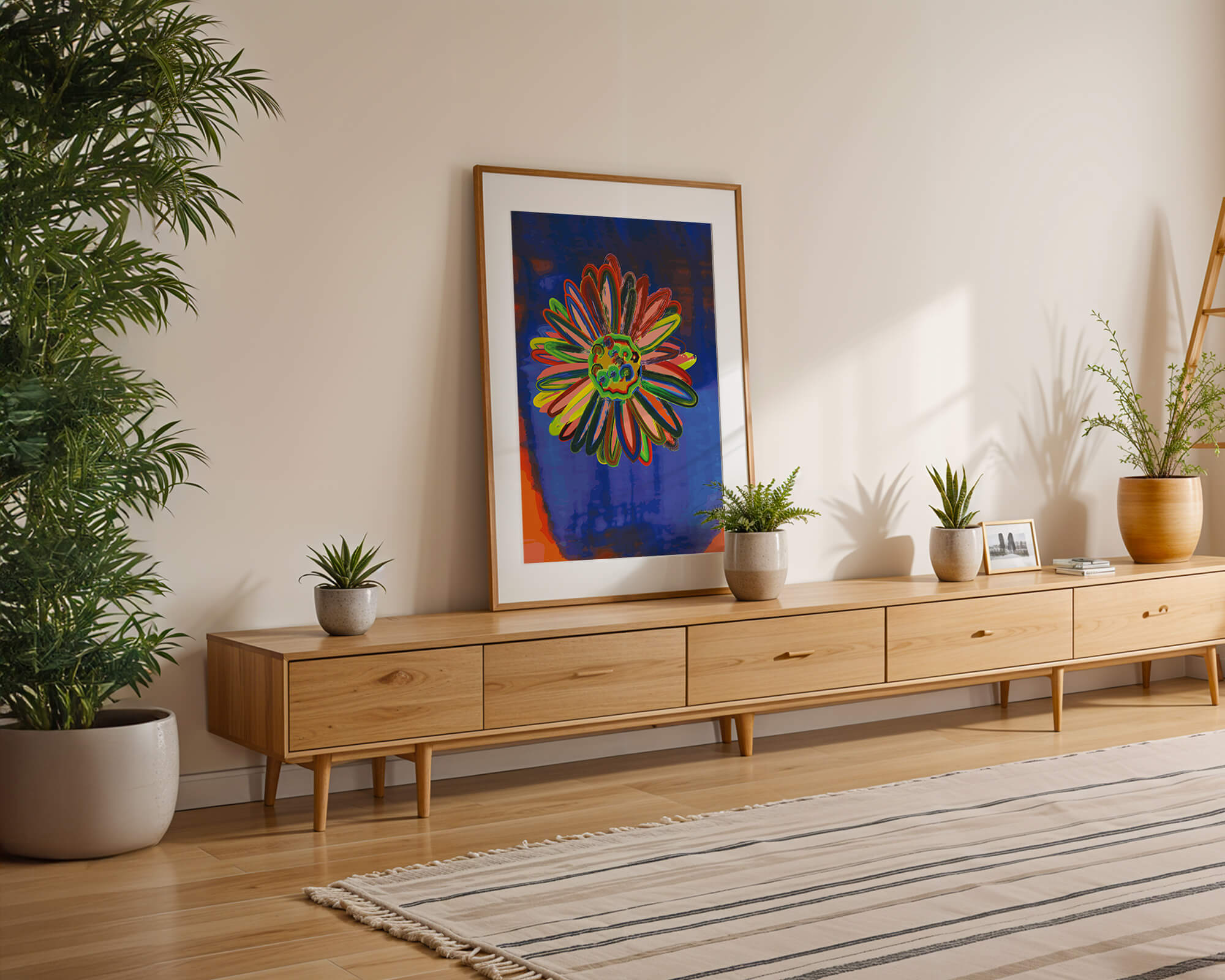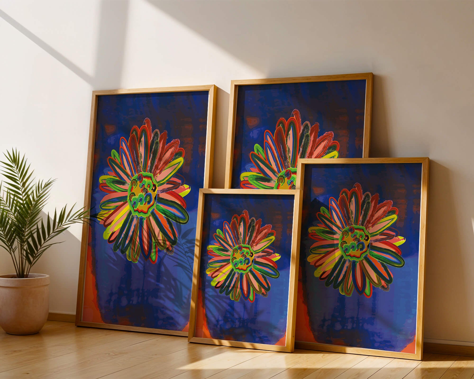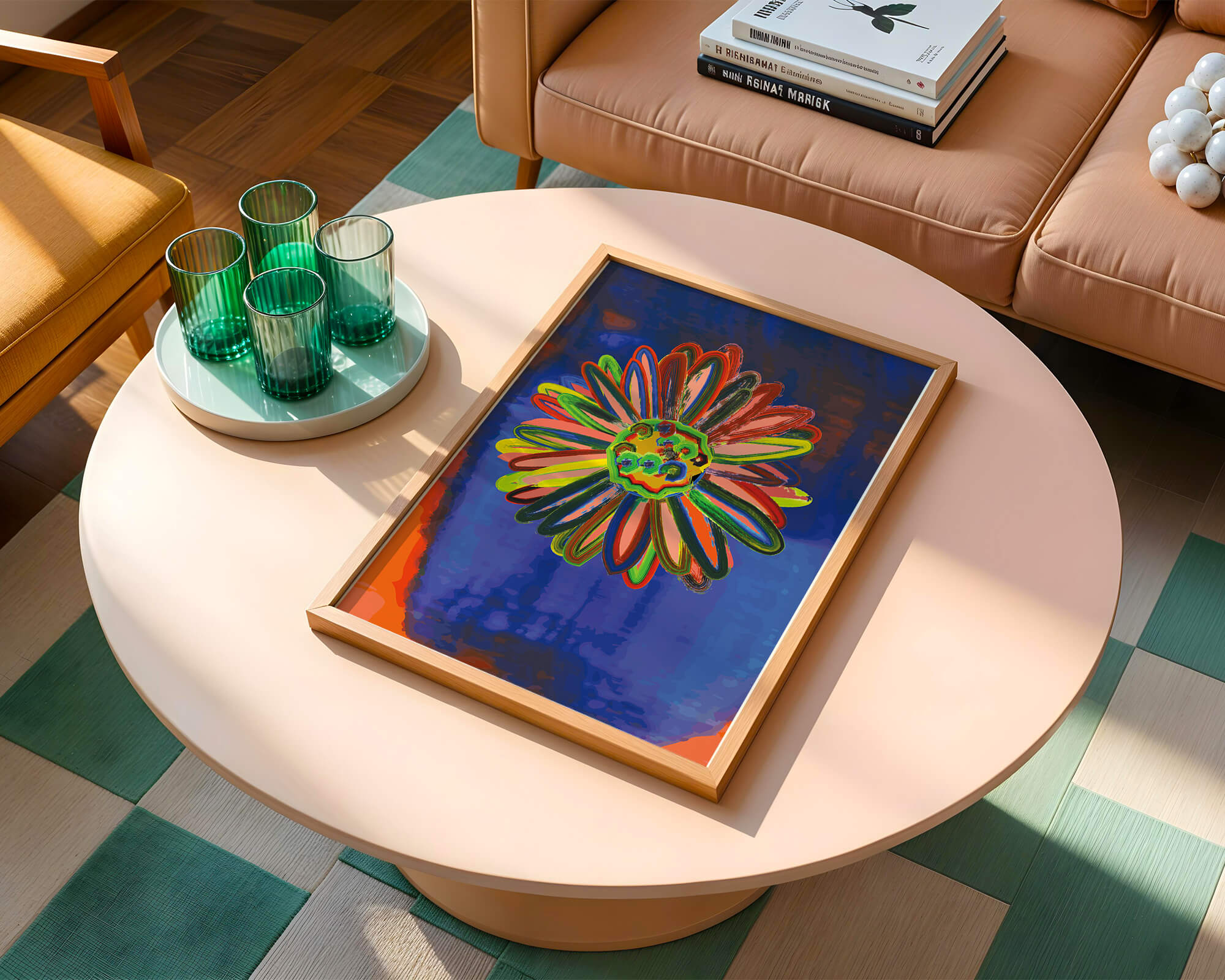 La flor abstracta representada en esta obra irradia energía, con sus pétalos pintados en una rica variedad de tonos cálidos y fríos. La combinación de rojos, azules, verdes y amarillos crea una cautivadora danza visual que atrae la atención del espectador. Sobre un fondo azul profundo, los coloridos pétalos de la flor irradian hacia afuera, evocando un sentido de movimiento y vida. Esta pieza es perfecta para aquellos que buscan añadir un toque de creatividad y vitalidad a su sala de estar u otra área que necesite un punto focal. Su estética moderna se alinea bien con diseños de interiores contemporáneos, convirtiéndola no solo en una obra de arte, sino en una declaración.| Tipo |