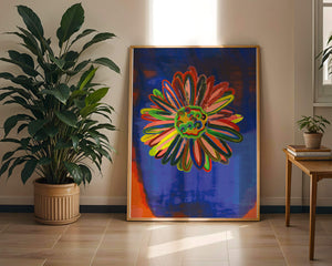 Esta vibrante obra de arte presenta una flor estilizada realizada en una paleta de colores vivaz. La pieza se caracteriza por sus audaces pinceladas y su composición dinámica, lo que la convierte en una adición impactante para cualquier espacio.