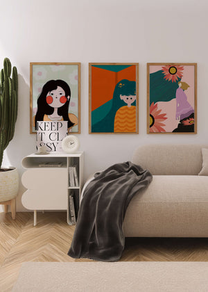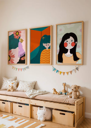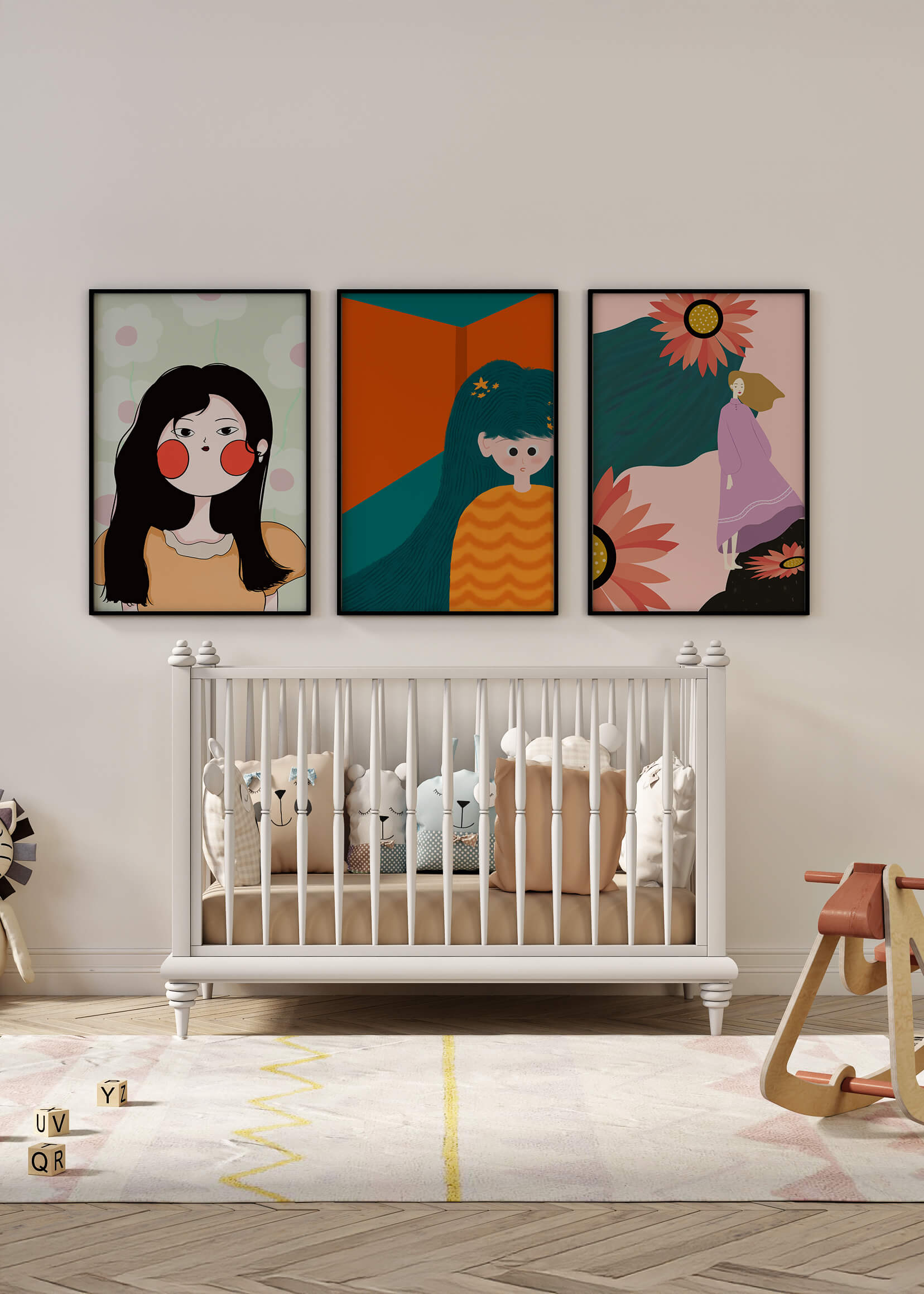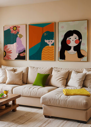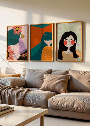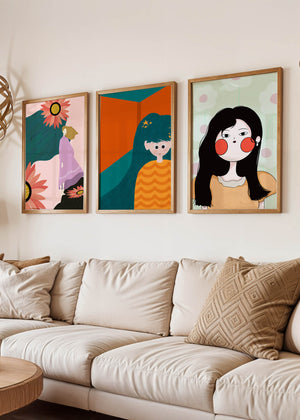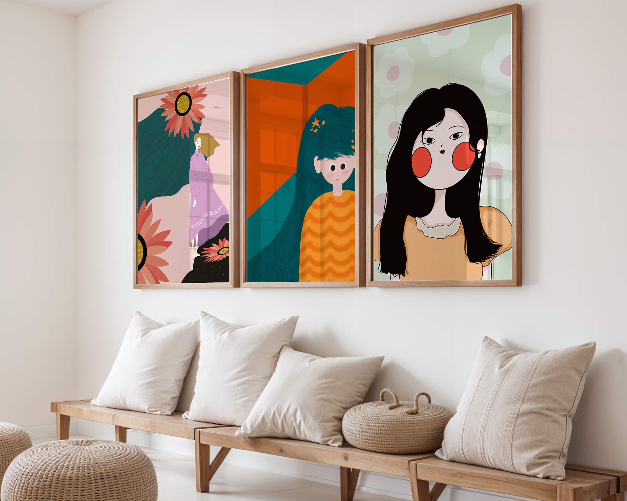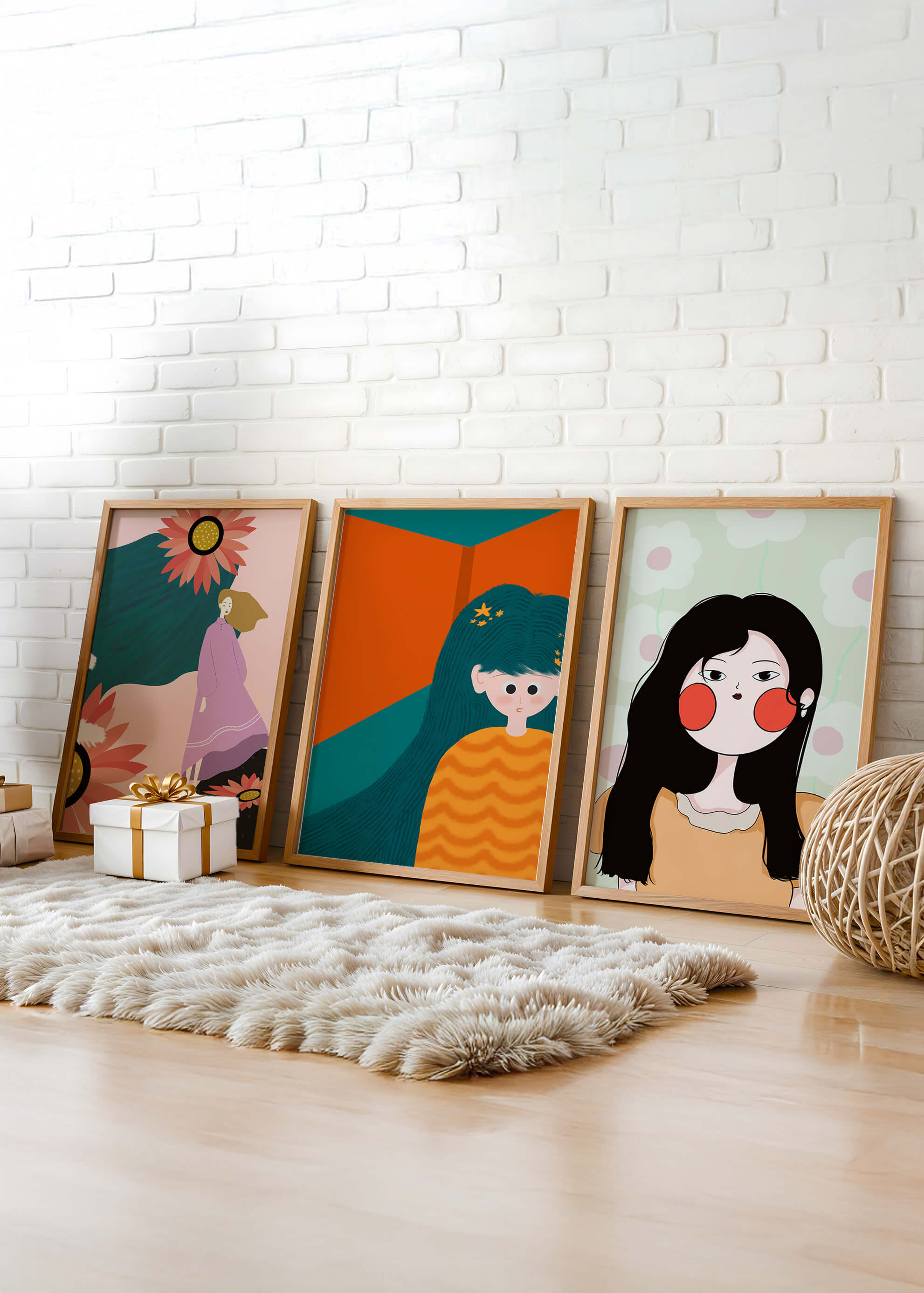 Este conjunto de ilustraciones presenta tres imágenes modernas y coloridas colocadas sin marcos sobre un suelo de madera claro. Cada imagen destaca por su estilo artístico vibrante y retratos únicos, llenos de detalles y color.