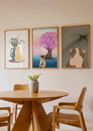 El primer impreso muestra un gato amarillo sentado junto a un jarrón con flores, evocando un sentimiento de tranquilidad y domesticidad. El segundo impreso captura un momento onírico, donde un gato observa un árbol en flor de color rosa, simbolizando la belleza de la naturaleza y la curiosidad felina. El tercer impreso ofrece otra perspectiva de un gato, esta vez desde atrás, mirando hacia arriba posiblemente hacia algo interesante fuera del marco. El conjunto es ideal para quienes buscan decorar su hogar con piezas que combinan amor por los gatos y aprecio por el entorno natural, utilizando colores pastel y detalles suaves que aportan un toque de serenidad y encanto a cualquier espacio.| Tipo |