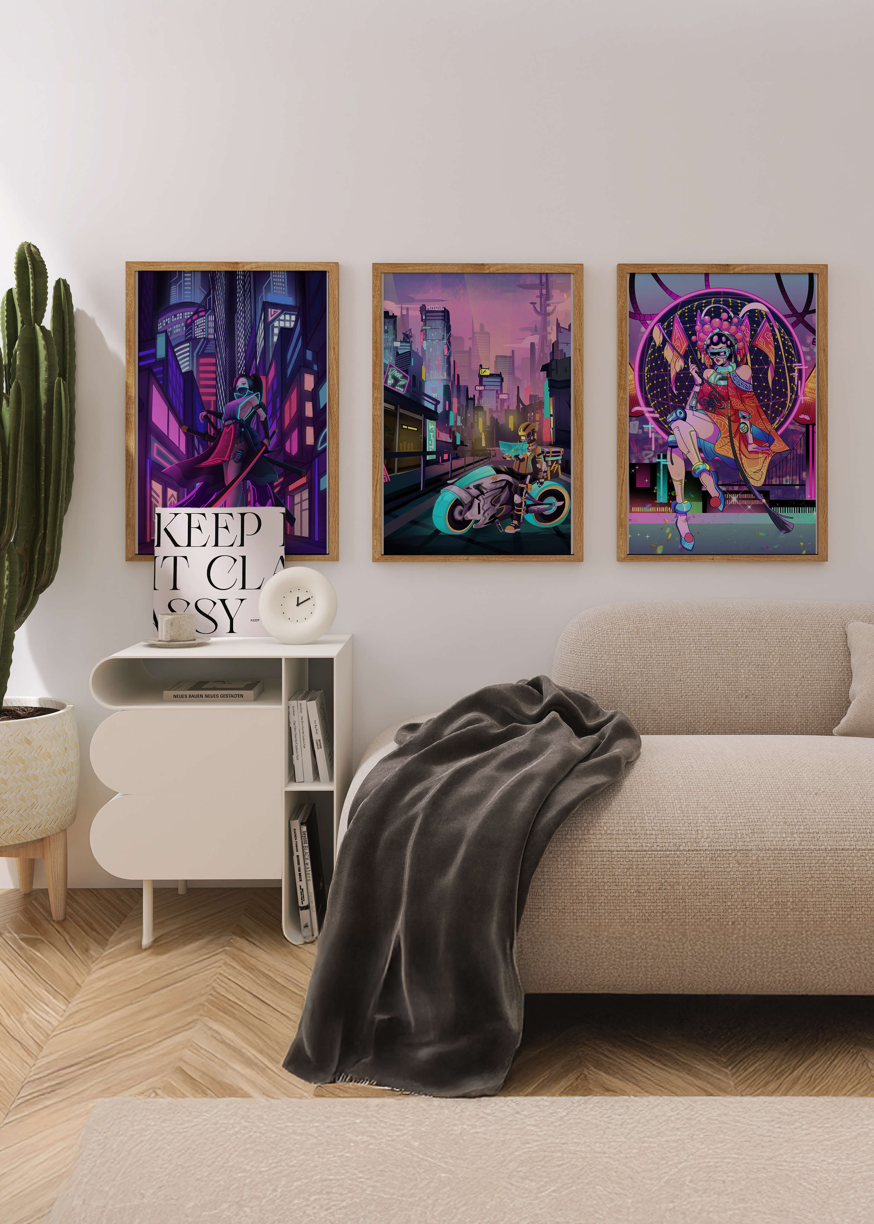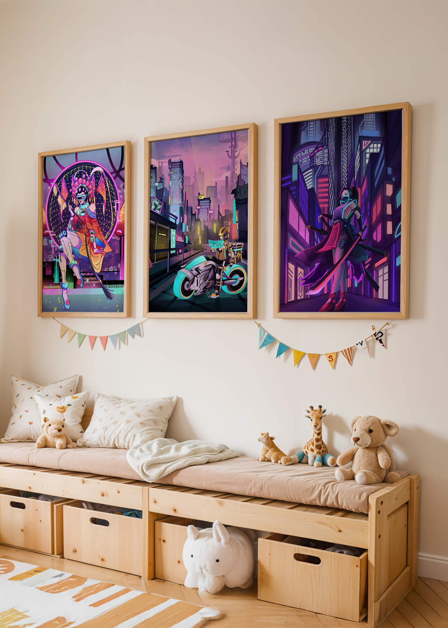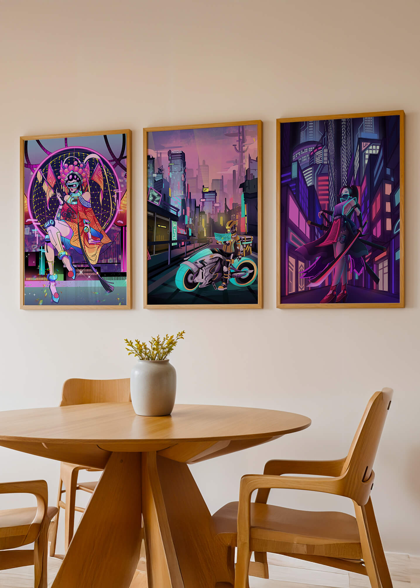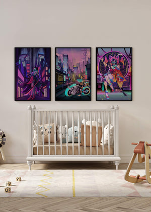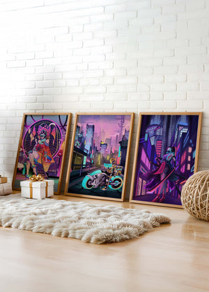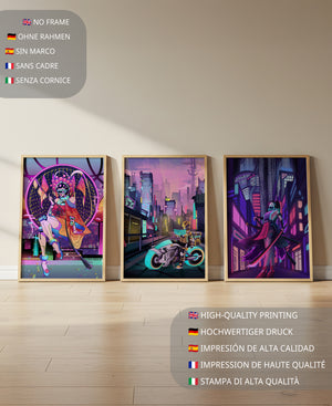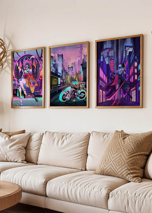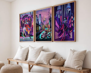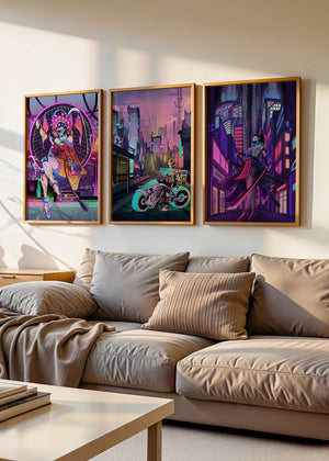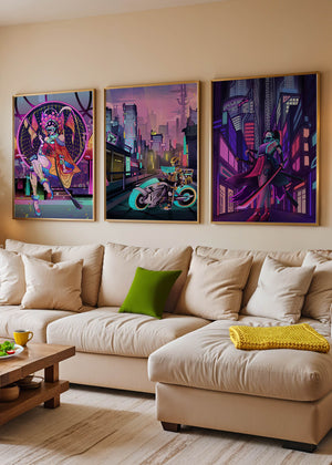 Este conjunto de lienzos presenta un arte digital vibrante con una temática futurista y ciberpunk. La imagen central destaca por sus colores neón y un estilo urbano único.