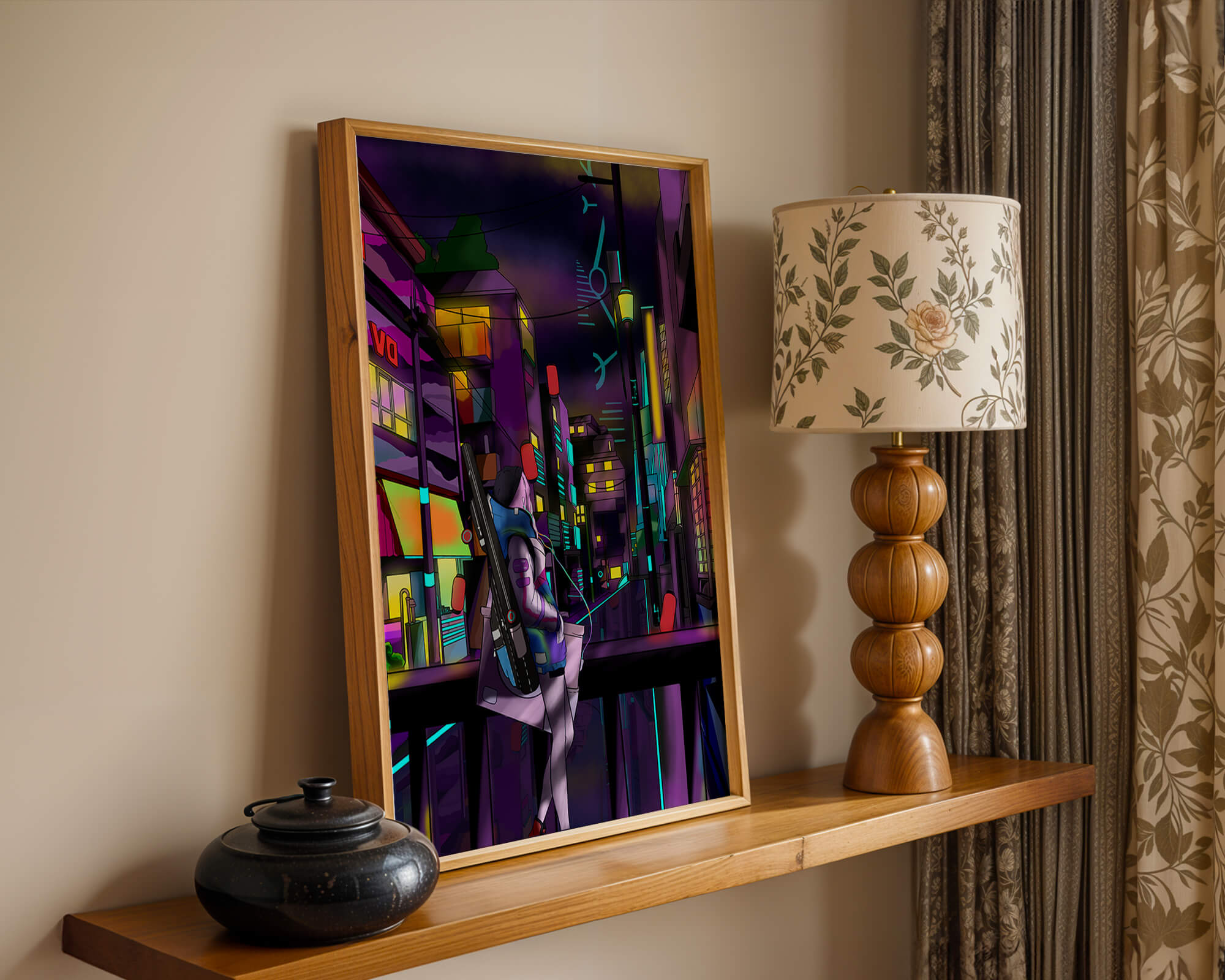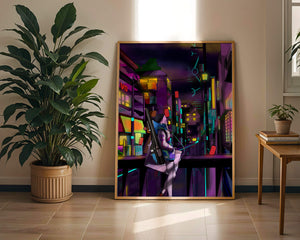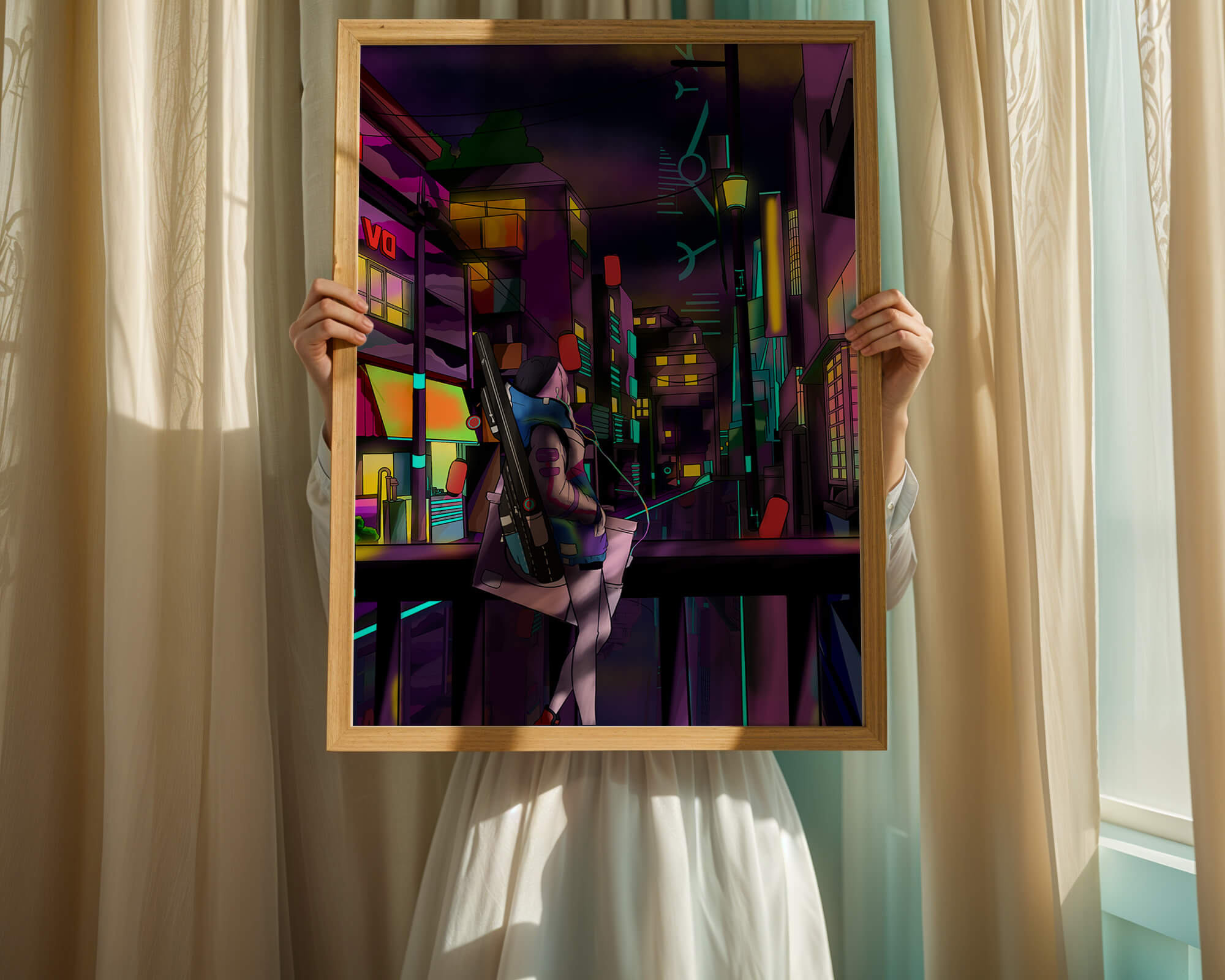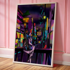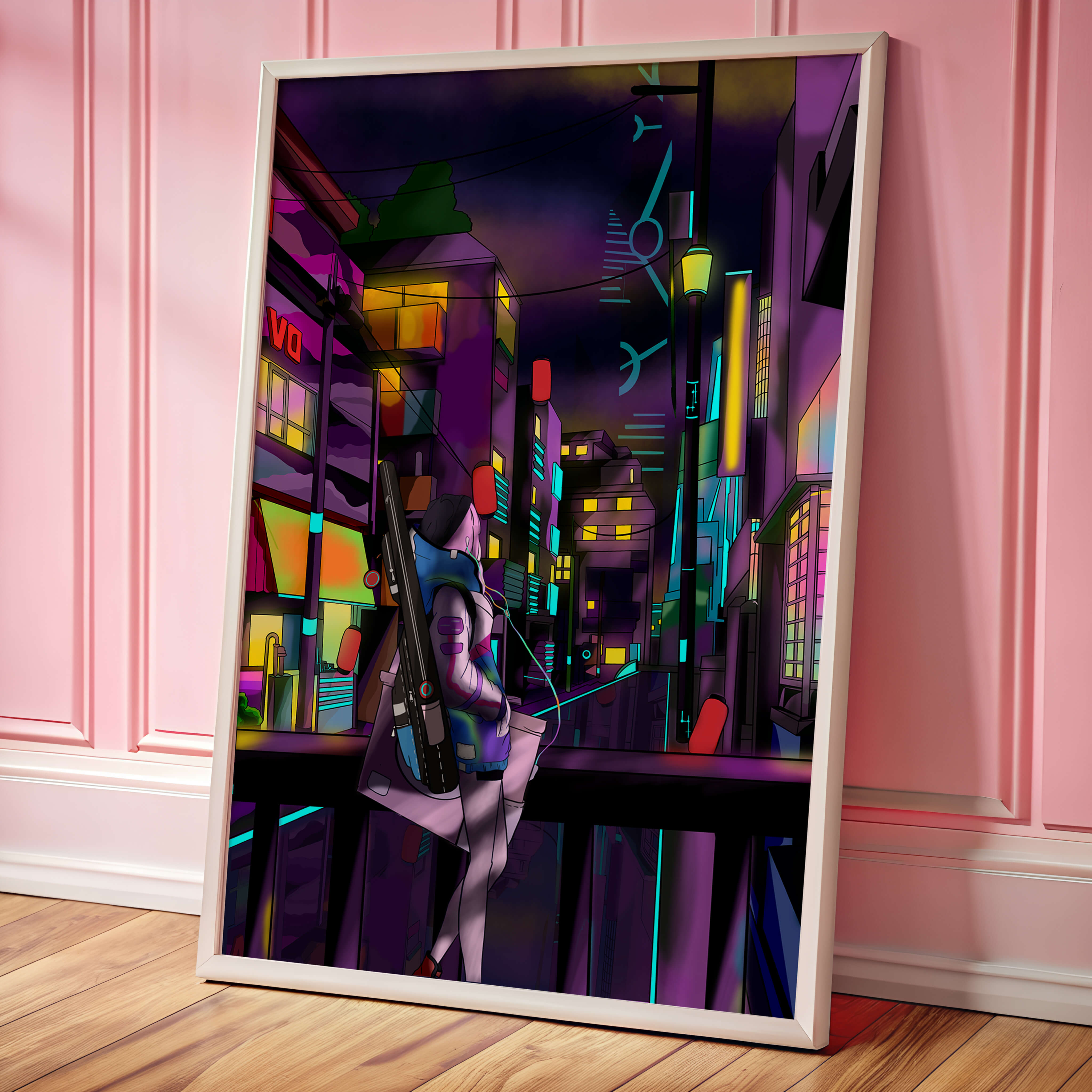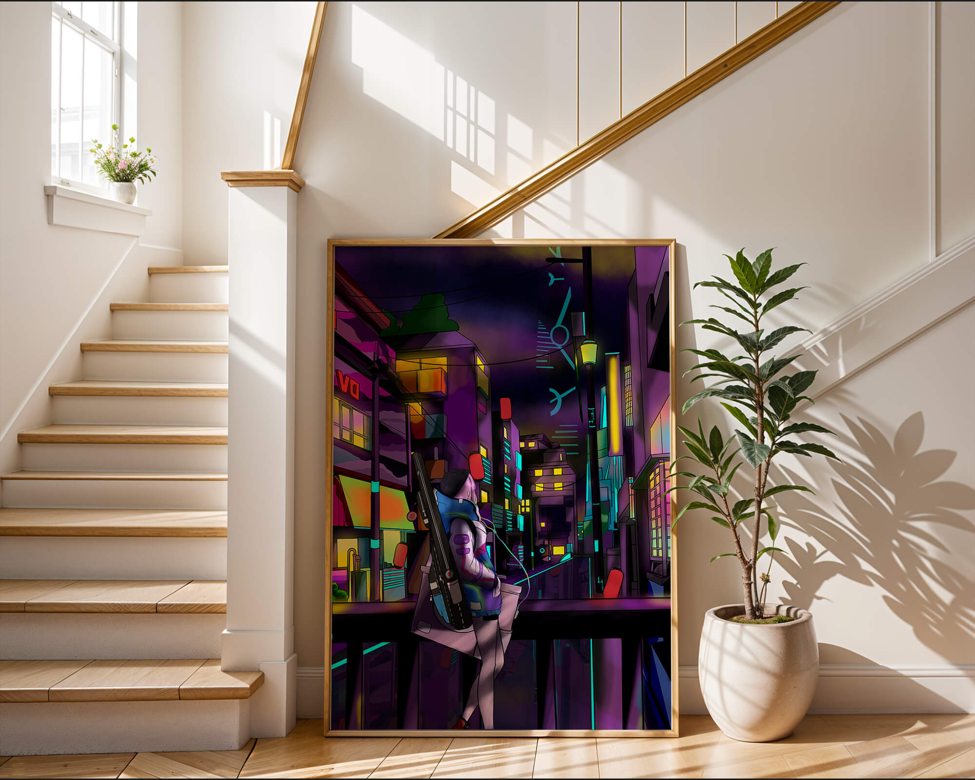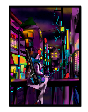 La escena captura la esencia de una bulliciosa metrópolis nocturna. Los rascacielos adornados con luces de neón brillantes crean un horizonte fascinante contra el oscuro cielo. Las calles de abajo son estrechas y están llenas del suave zumbido de la electricidad, iluminando los rincones ocultos de la ciudad. El personaje en primer plano, vestido con ropa moderna, está apoyado contra la barandilla. Su presencia añade un sentido narrativo, insinuando un viaje o búsqueda en medio de este mundo tecnológico. El contraste entre las luces vivas y las profundas sombras evoca un sentimiento de misterio y exploración dentro de este entorno urbano.| Tipo |