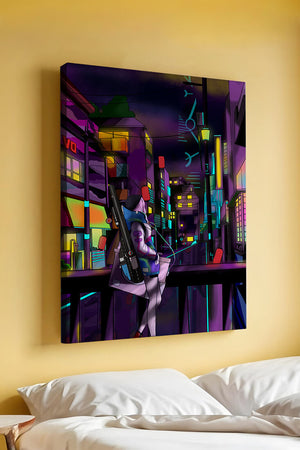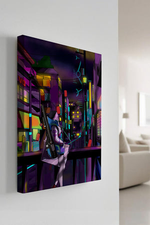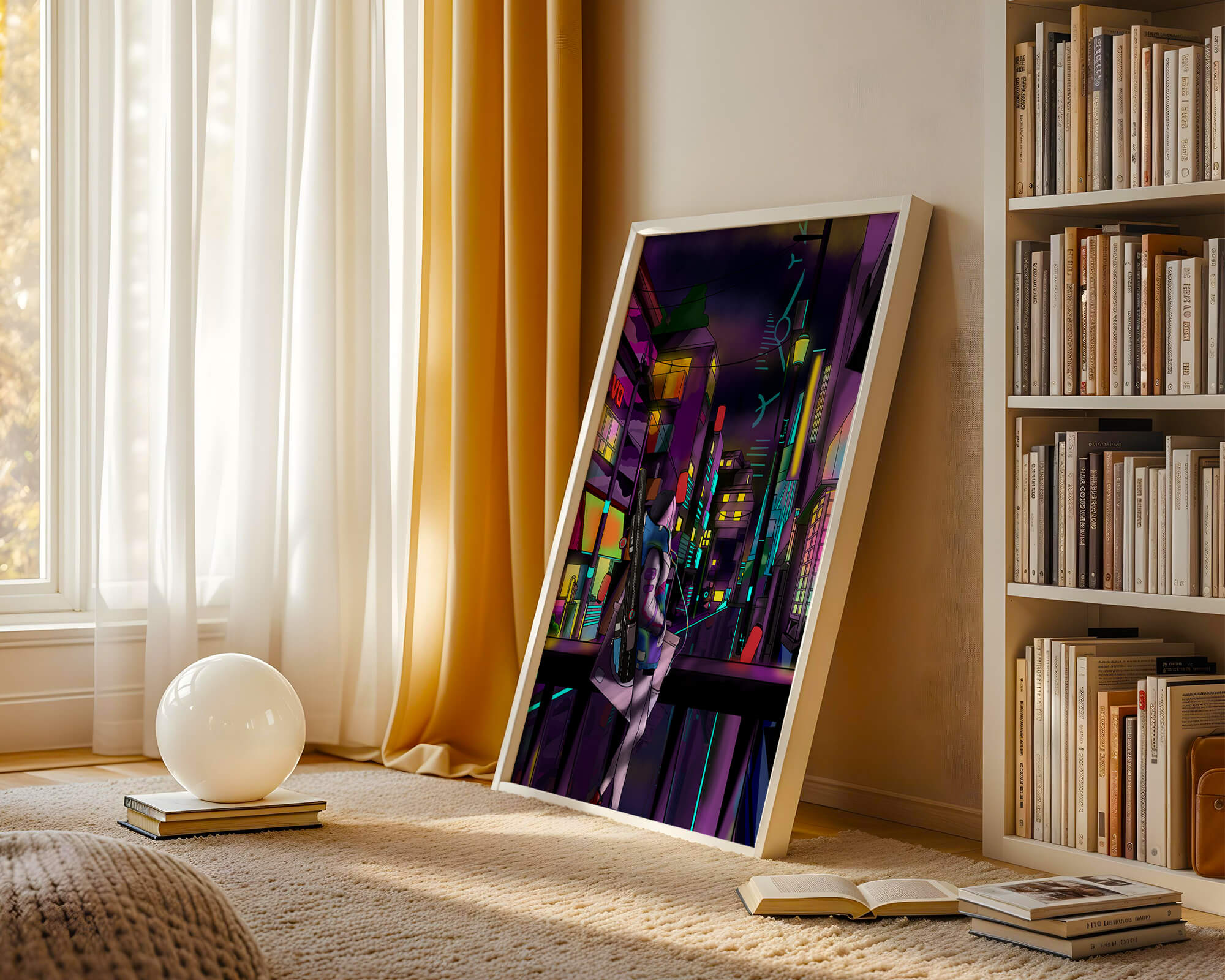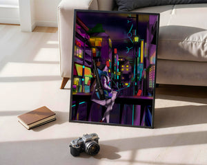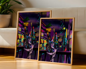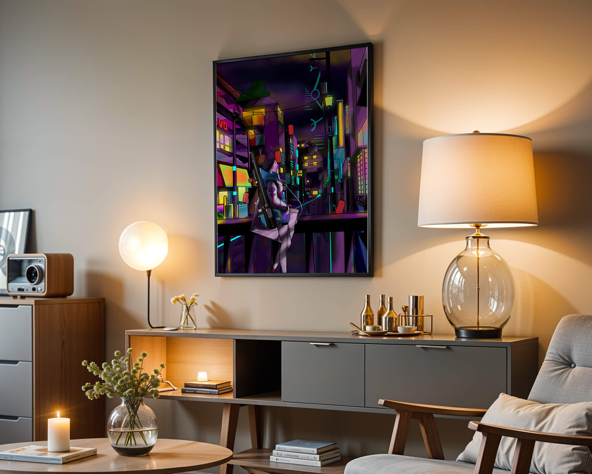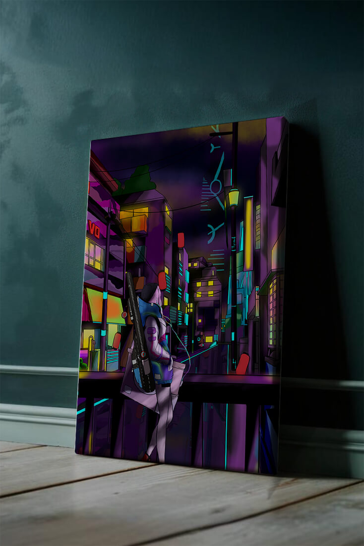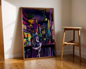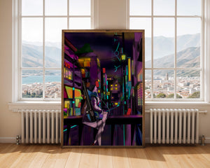 La escena captura la esencia de una bulliciosa metrópolis nocturna. Los rascacielos adornados con luces de neón brillantes crean un horizonte fascinante contra el oscuro cielo. Las calles de abajo son estrechas y están llenas del suave zumbido de la electricidad, iluminando los rincones ocultos de la ciudad. El personaje en primer plano, vestido con ropa moderna, está apoyado contra la barandilla. Su presencia añade un sentido narrativo, insinuando un viaje o búsqueda en medio de este mundo tecnológico. El contraste entre las luces vivas y las profundas sombras evoca un sentimiento de misterio y exploración dentro de este entorno urbano.| Tipo |