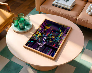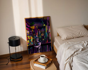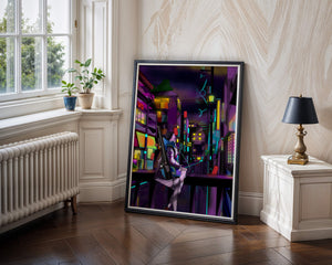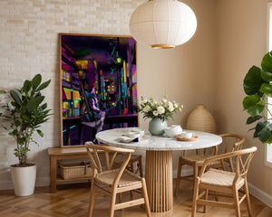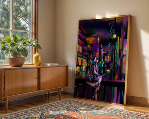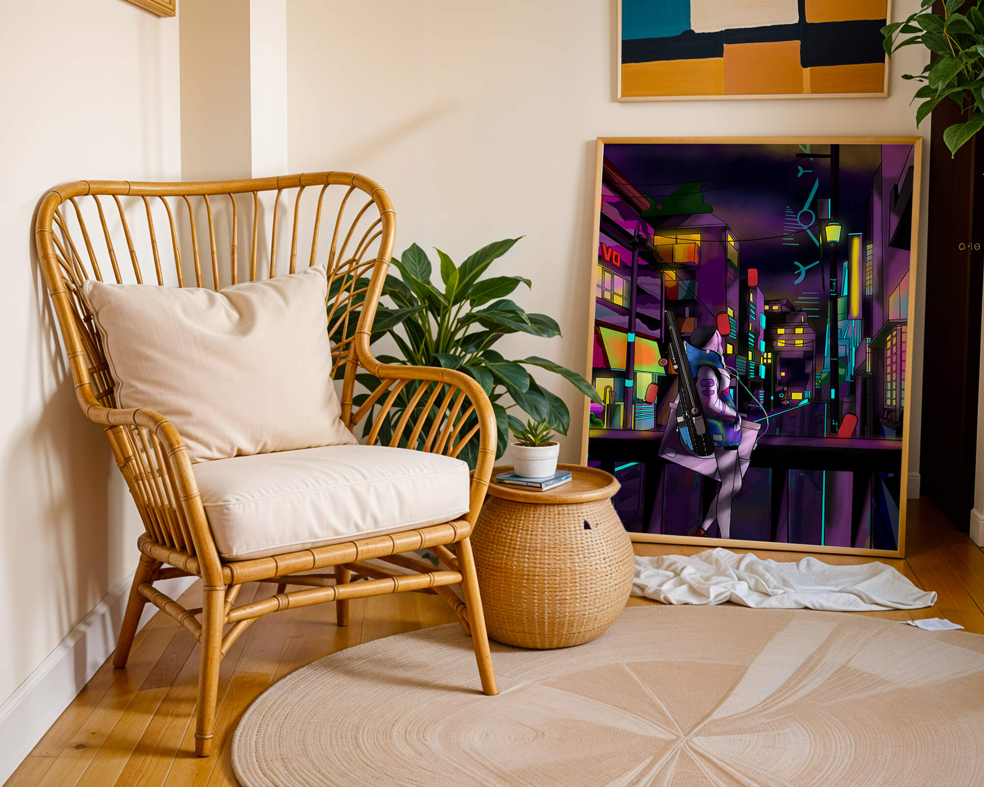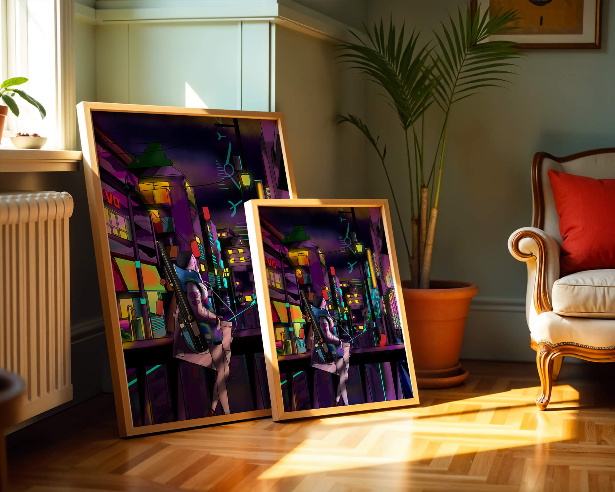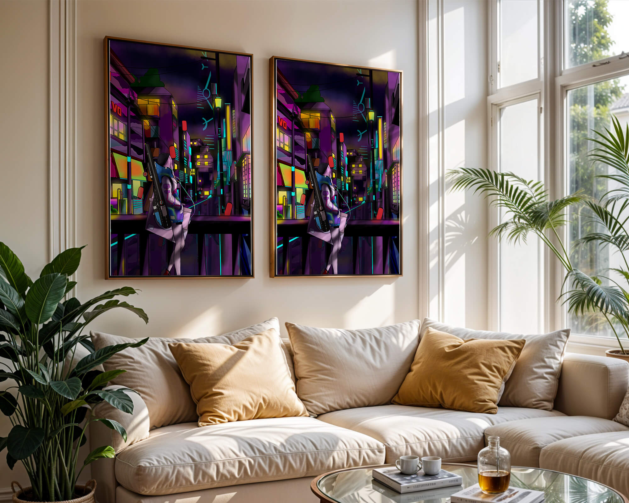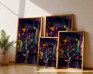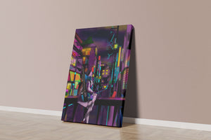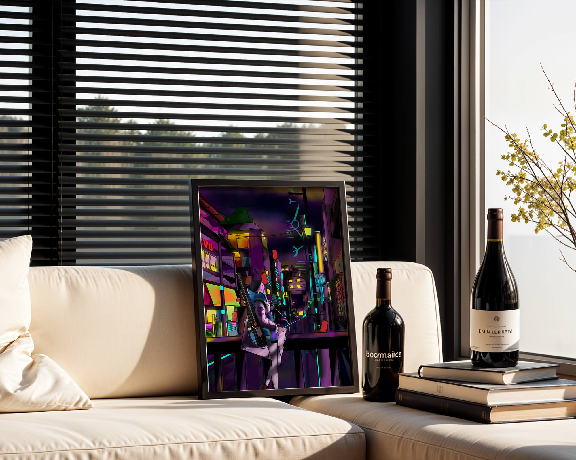 La escena captura la esencia de una bulliciosa metrópolis nocturna. Los rascacielos adornados con luces de neón brillantes crean un horizonte fascinante contra el oscuro cielo. Las calles de abajo son estrechas y están llenas del suave zumbido de la electricidad, iluminando los rincones ocultos de la ciudad. El personaje en primer plano, vestido con ropa moderna, está apoyado contra la barandilla. Su presencia añade un sentido narrativo, insinuando un viaje o búsqueda en medio de este mundo tecnológico. El contraste entre las luces vivas y las profundas sombras evoca un sentimiento de misterio y exploración dentro de este entorno urbano.| Tipo |