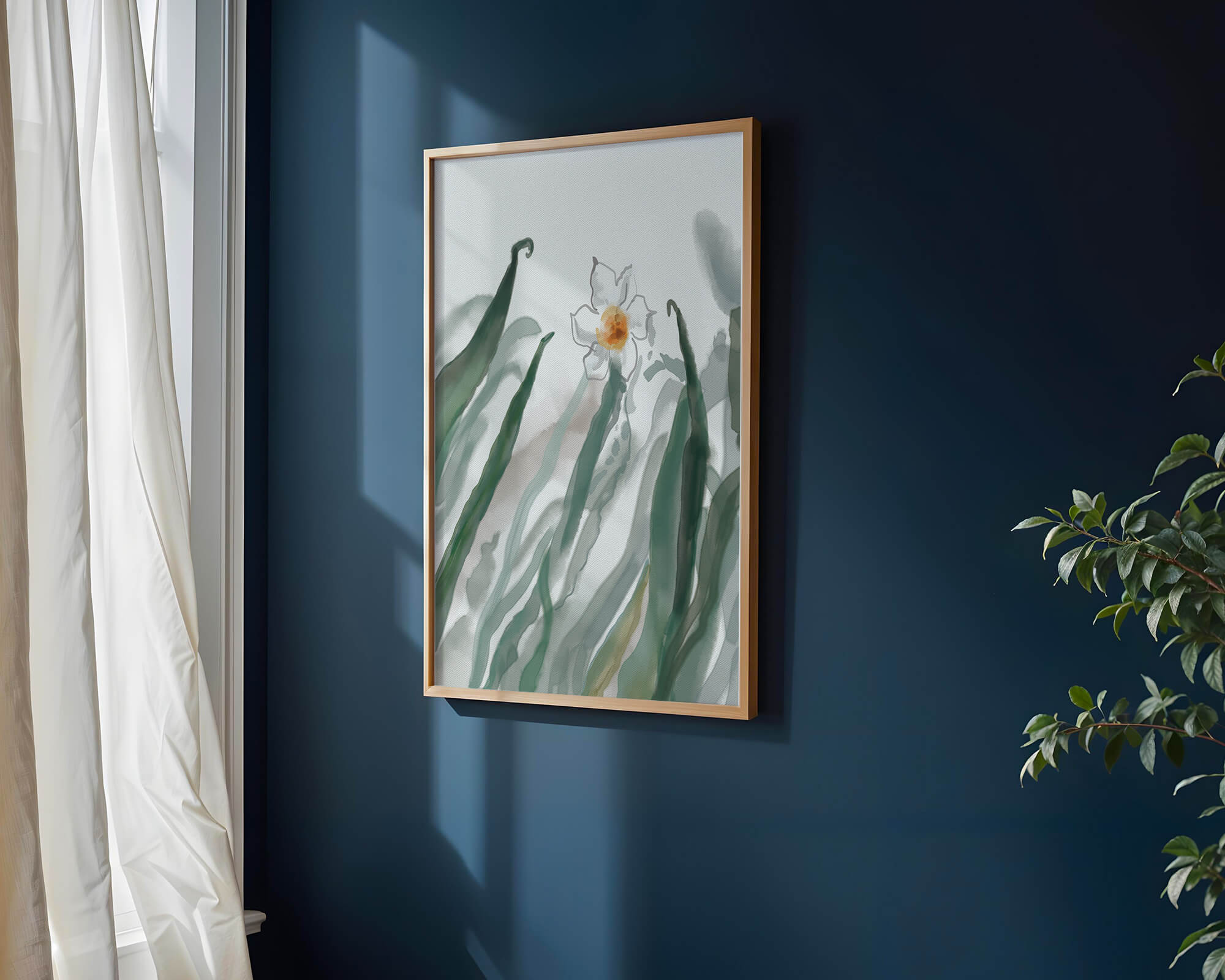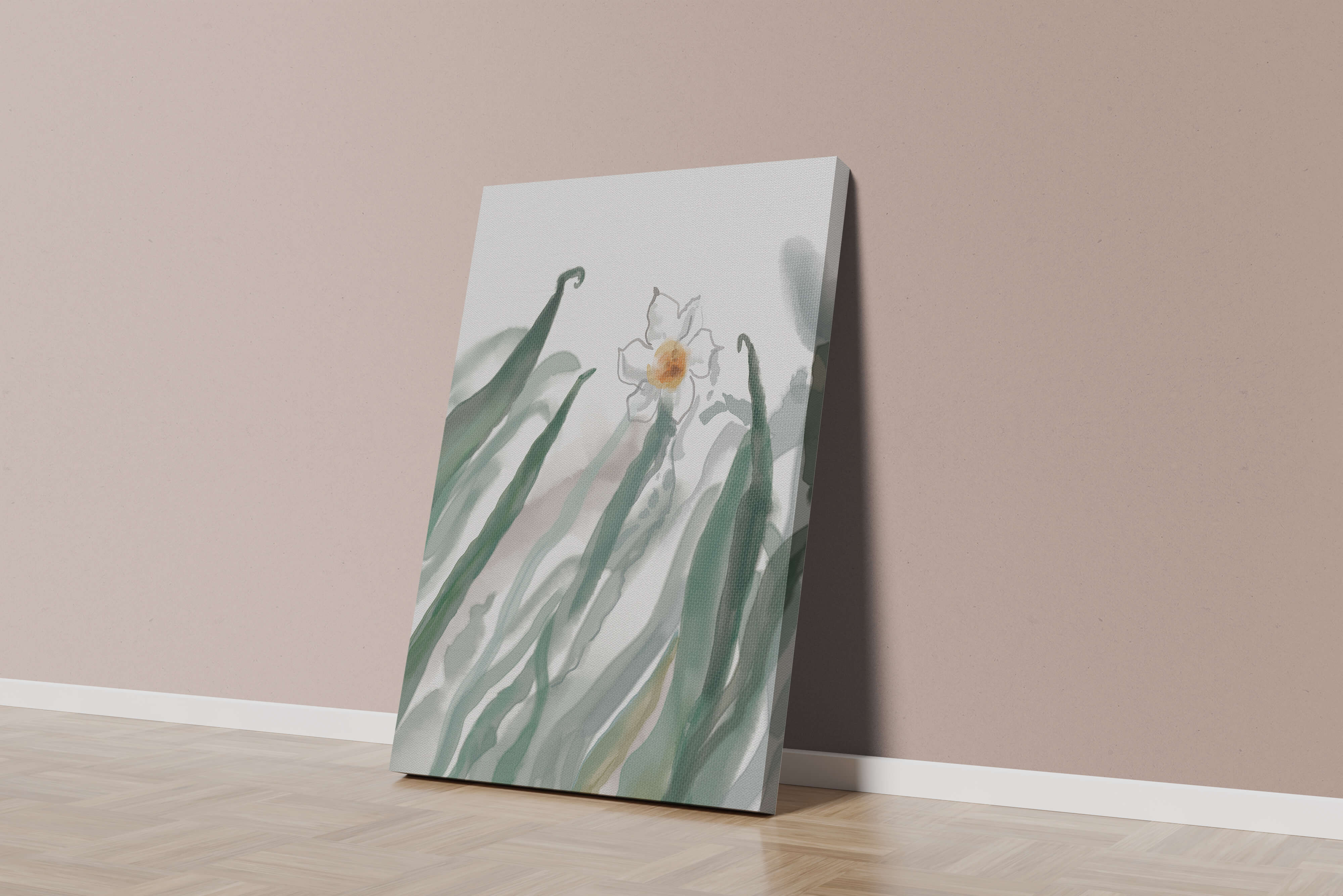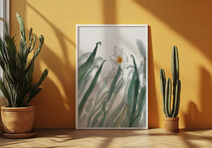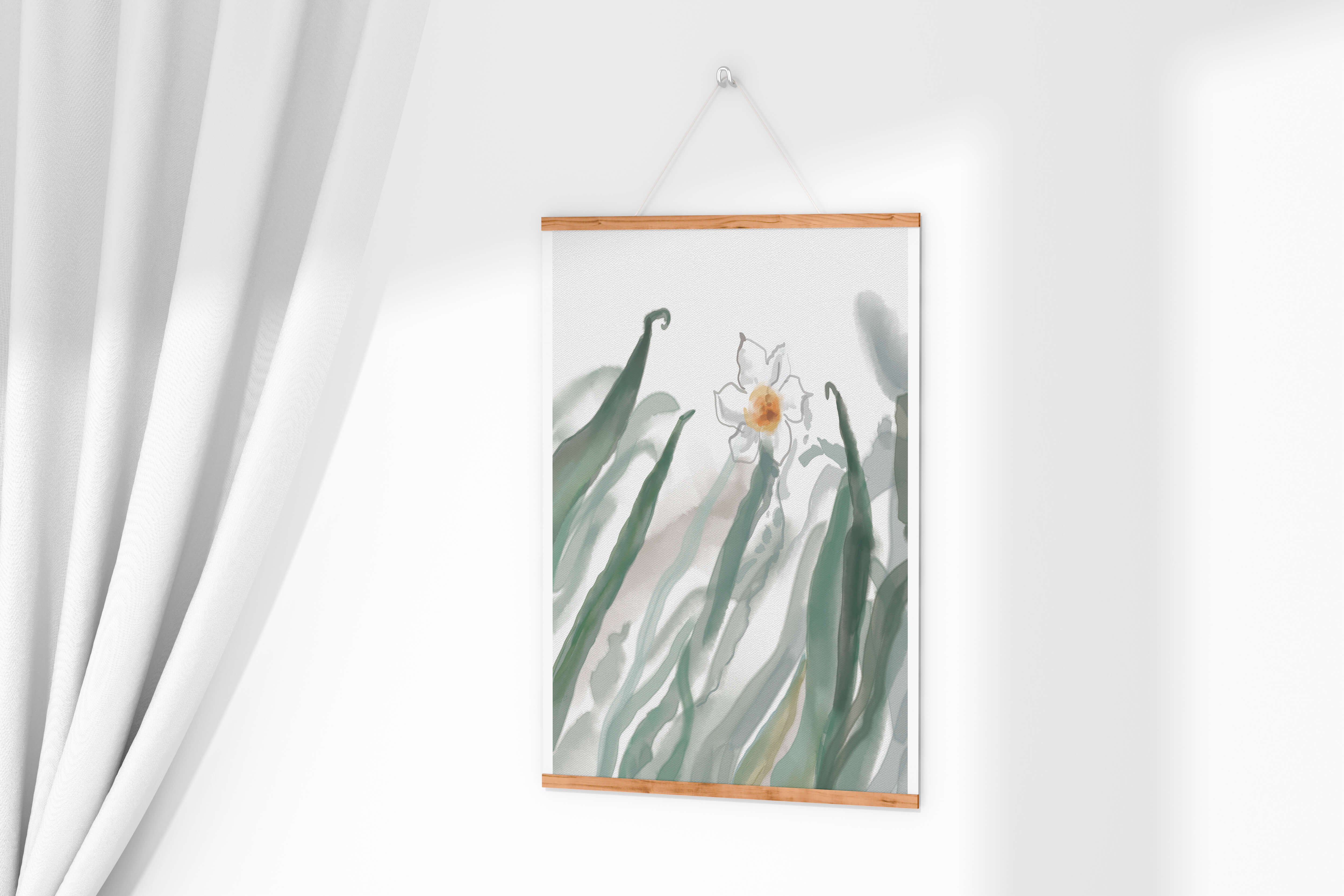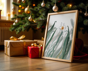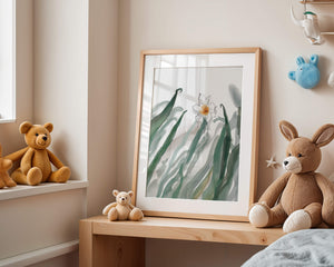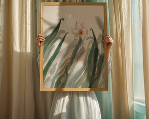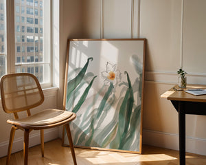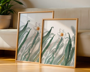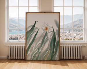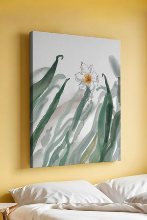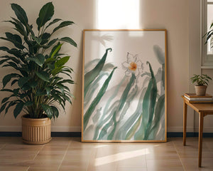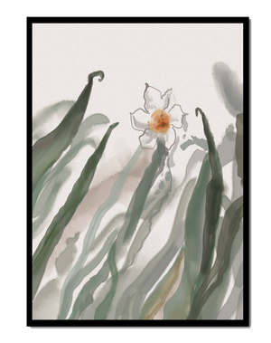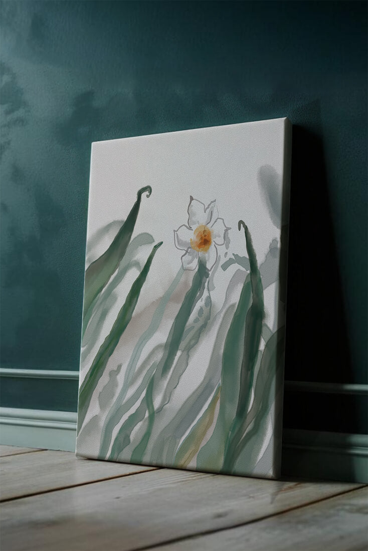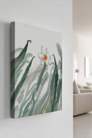 Esta obra de arte captura la suave belleza de un solo narciso blanco anidado entre vibrantes hojas verdes. El uso de técnicas de acuarela aporta una sensación suave y orgánica a la composición, destacando la elegancia del mundo natural.