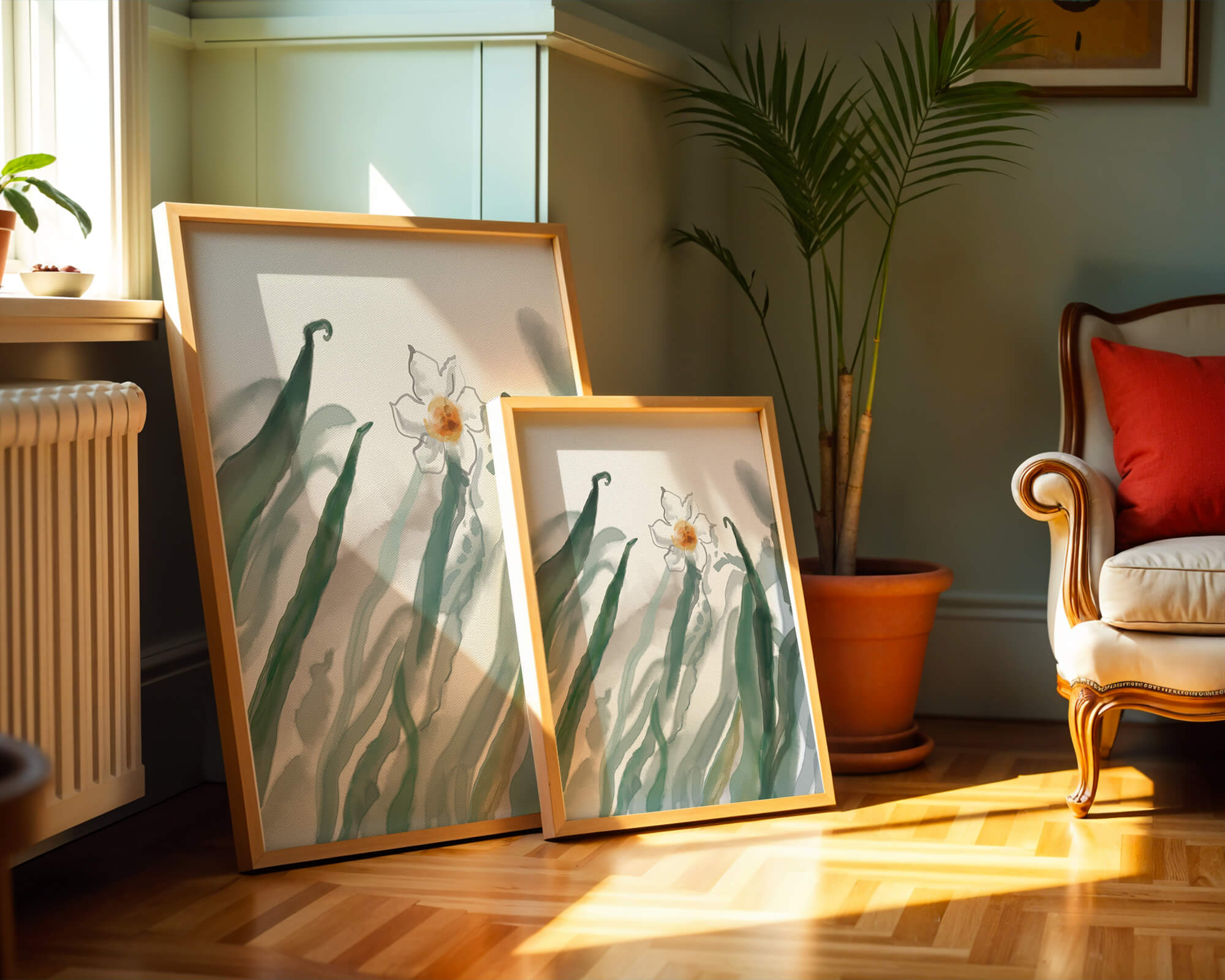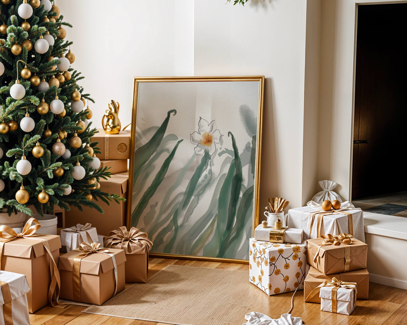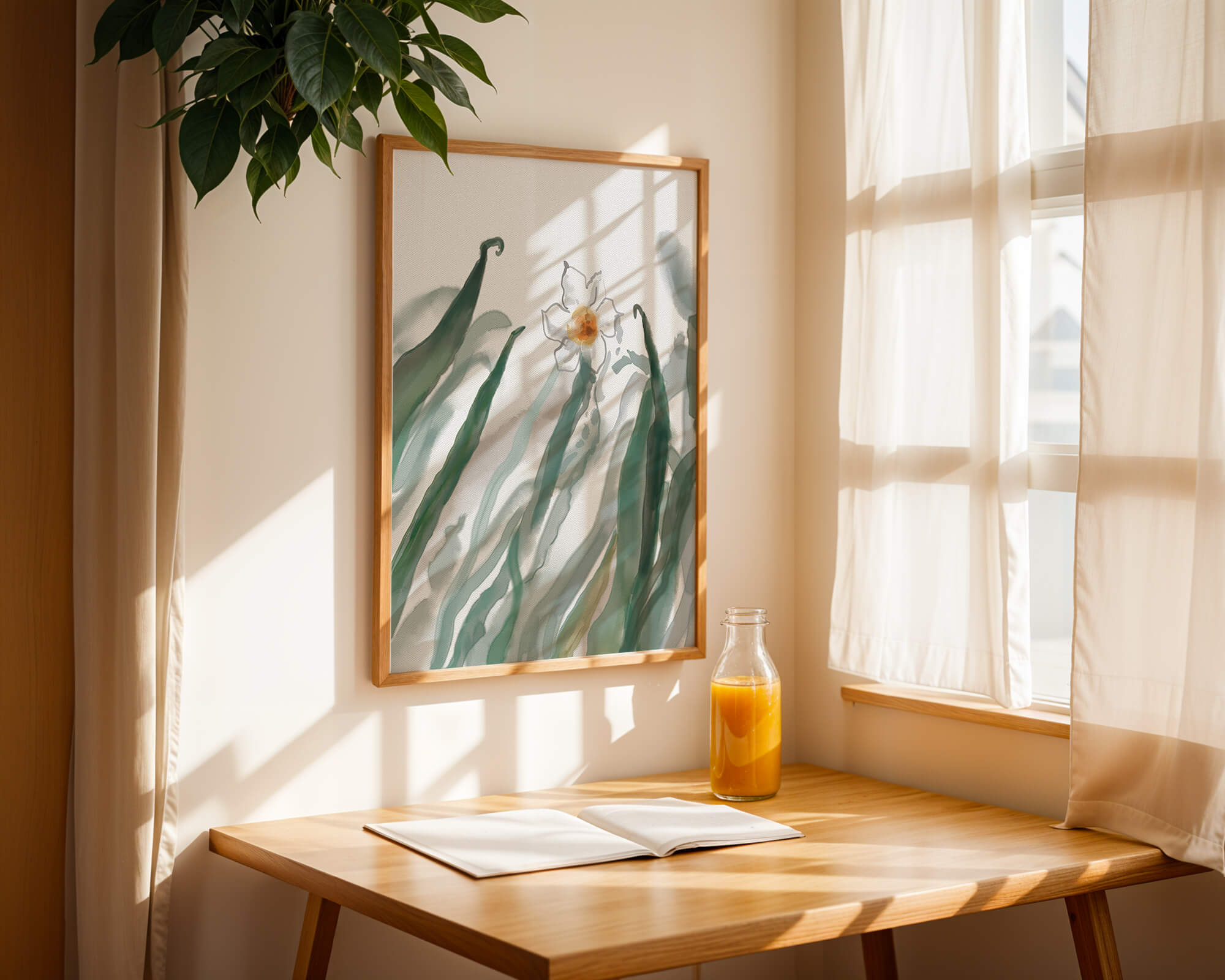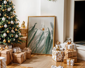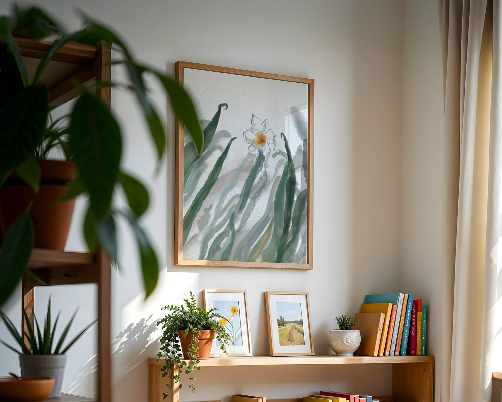 Esta obra de arte captura la suave belleza de un solo narciso blanco anidado entre vibrantes hojas verdes. El uso de técnicas de acuarela aporta una sensación suave y orgánica a la composición, destacando la elegancia del mundo natural.