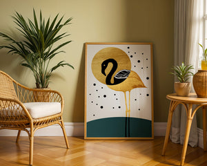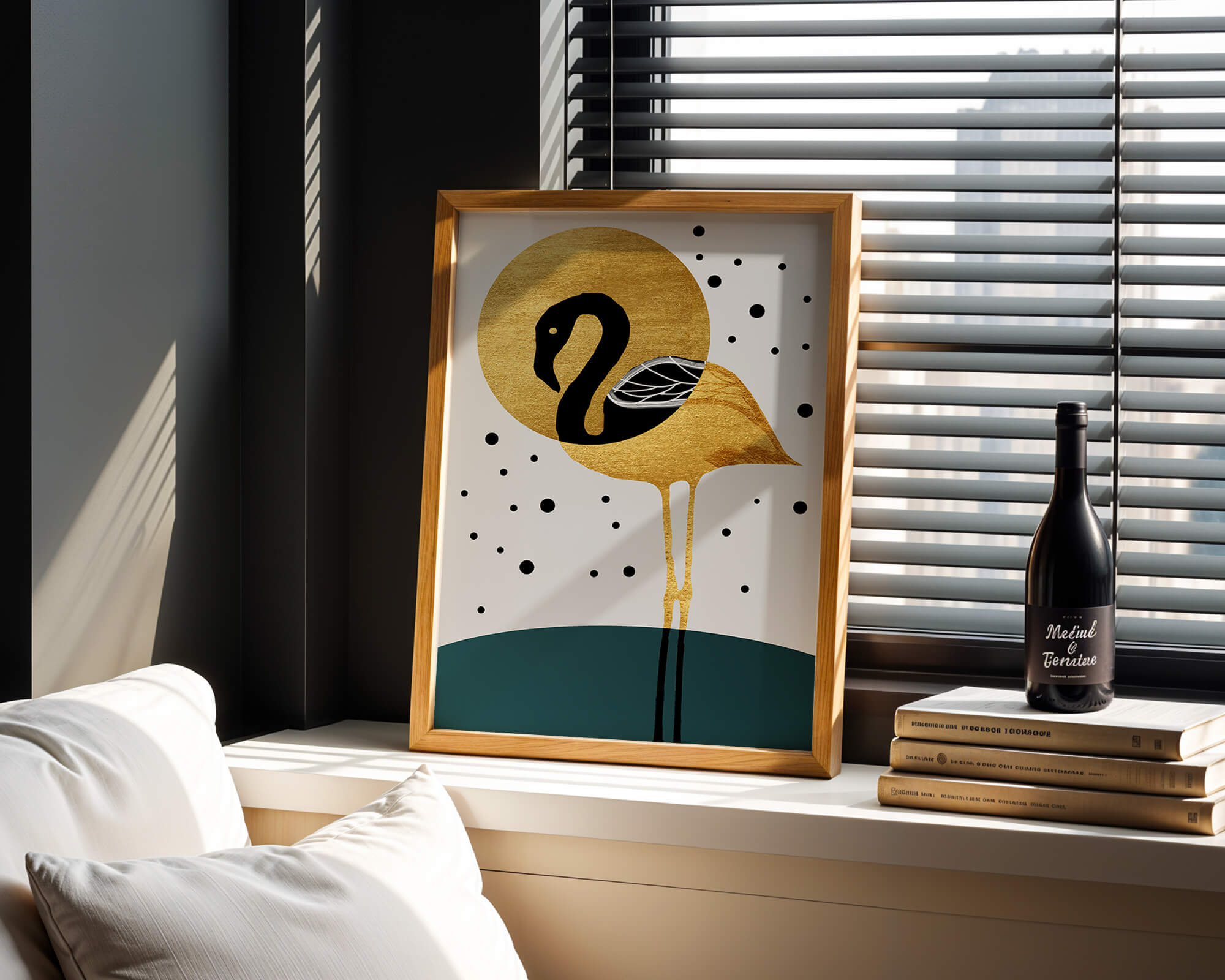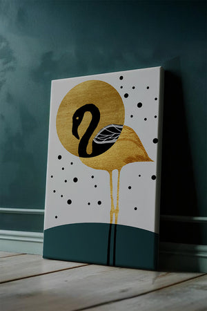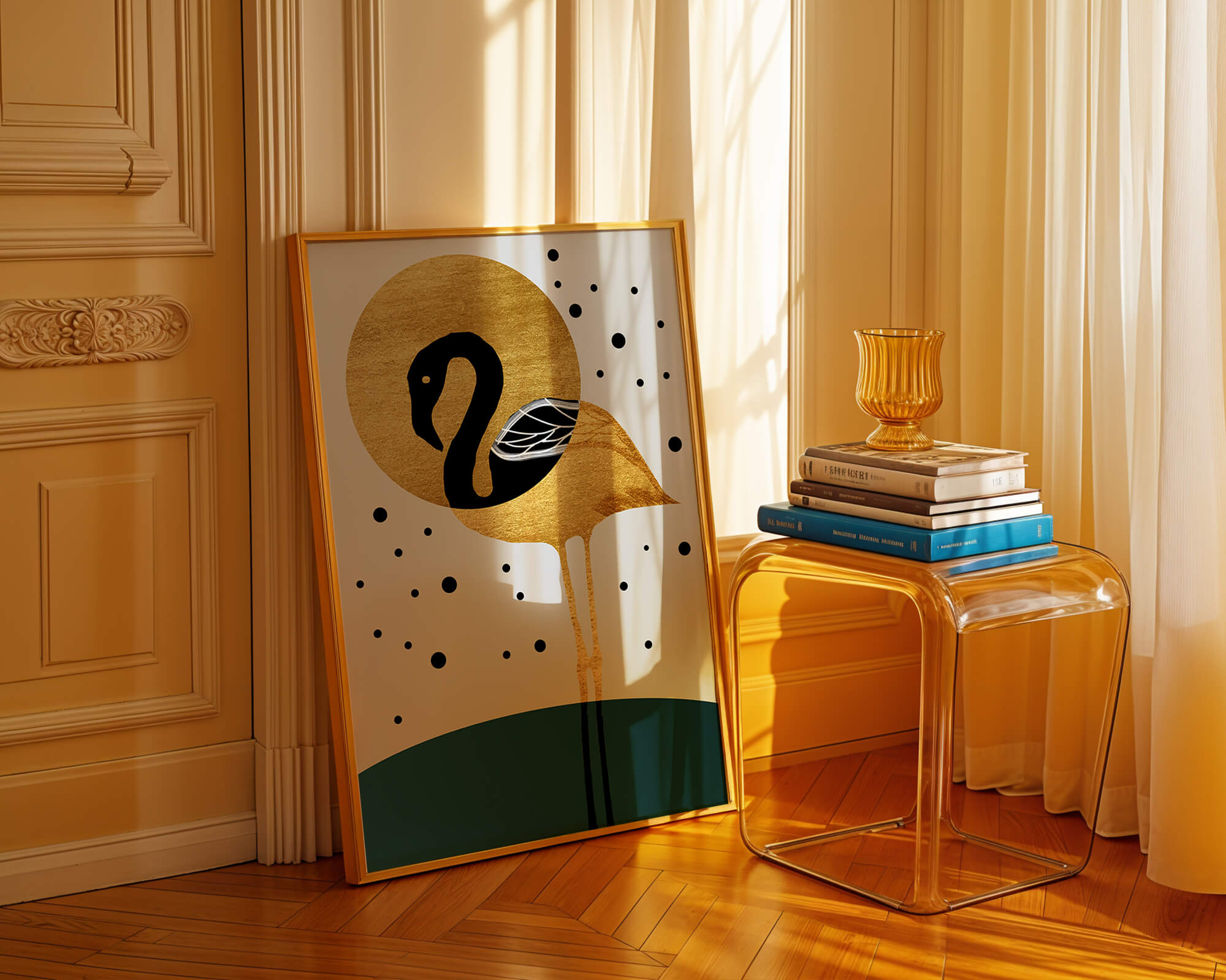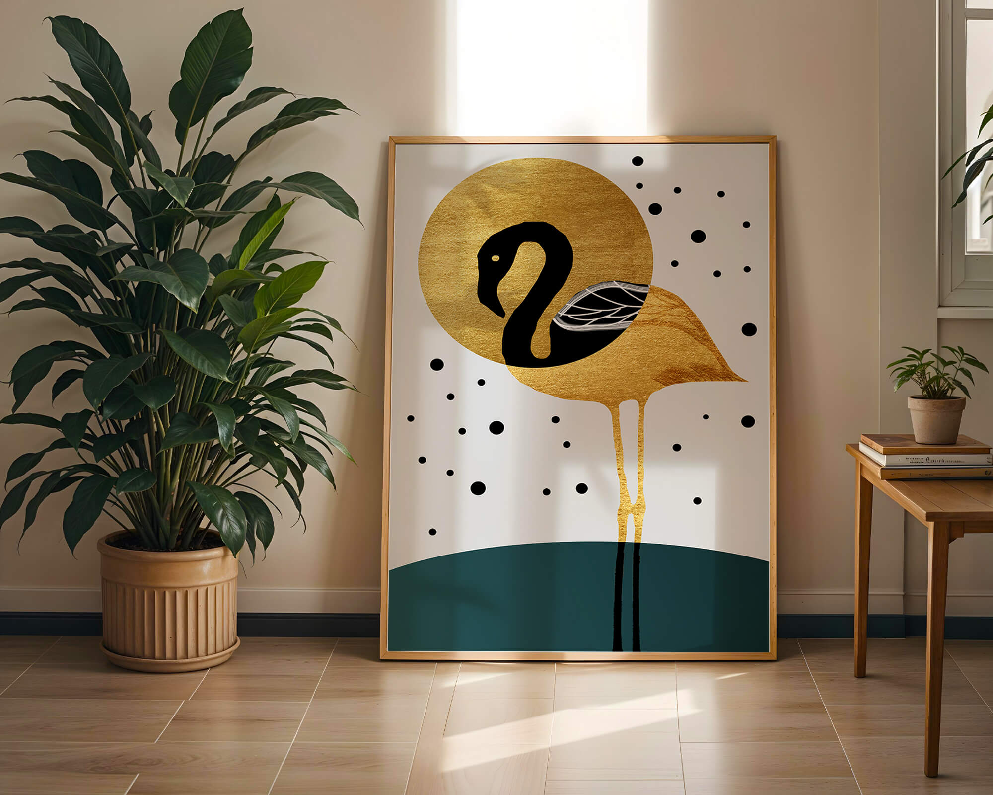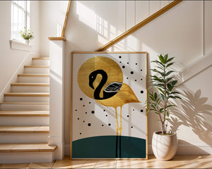 Esta ilustración cautivadora muestra una impresionante mezcla de elementos dorados y negros, destacando un flamenco contra un fondo moderno y abstracto. La combinación de colores y elementos de diseño crea una pieza visualmente impactante que es perfecta para cualquier entorno decorativo elegante.