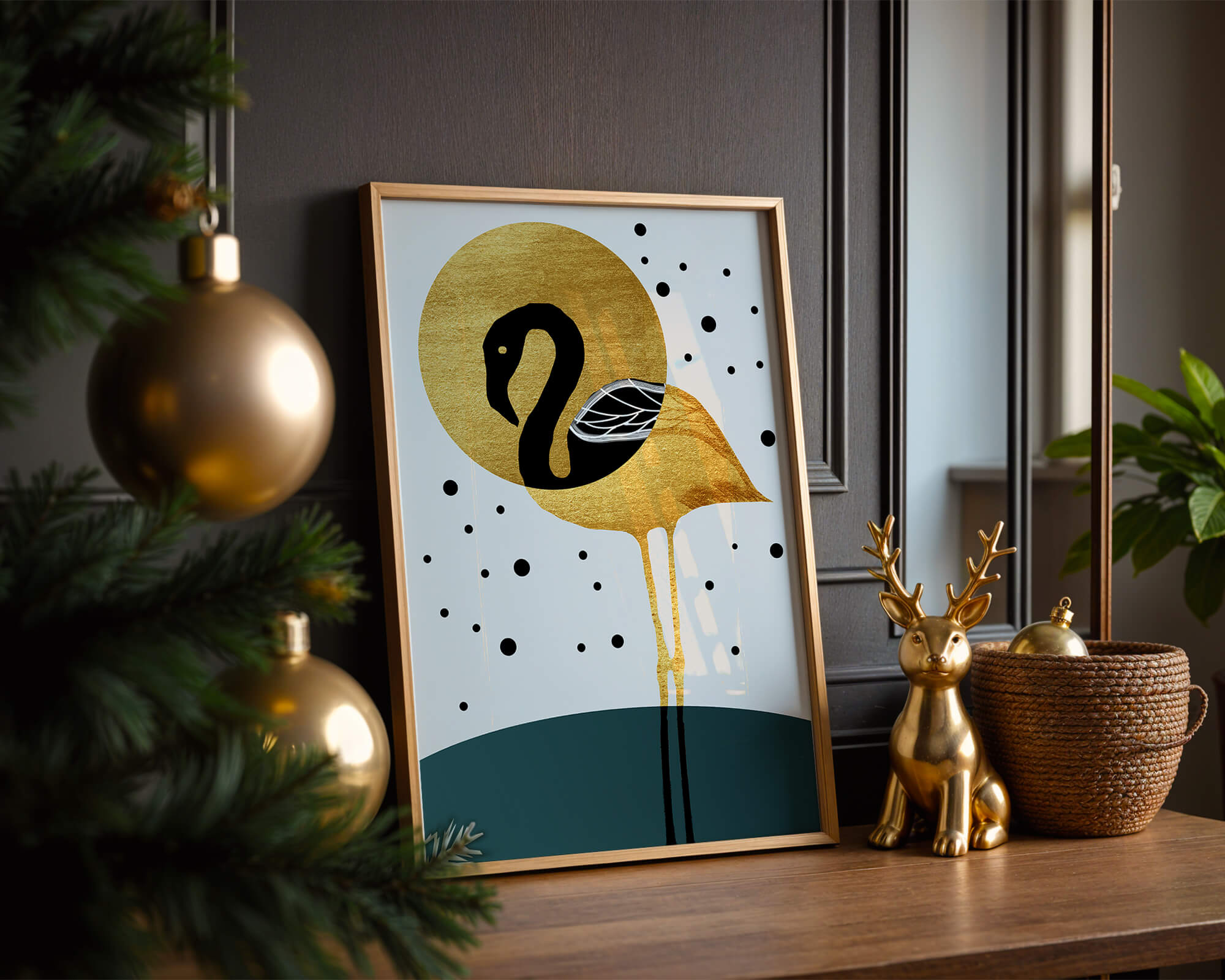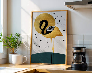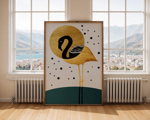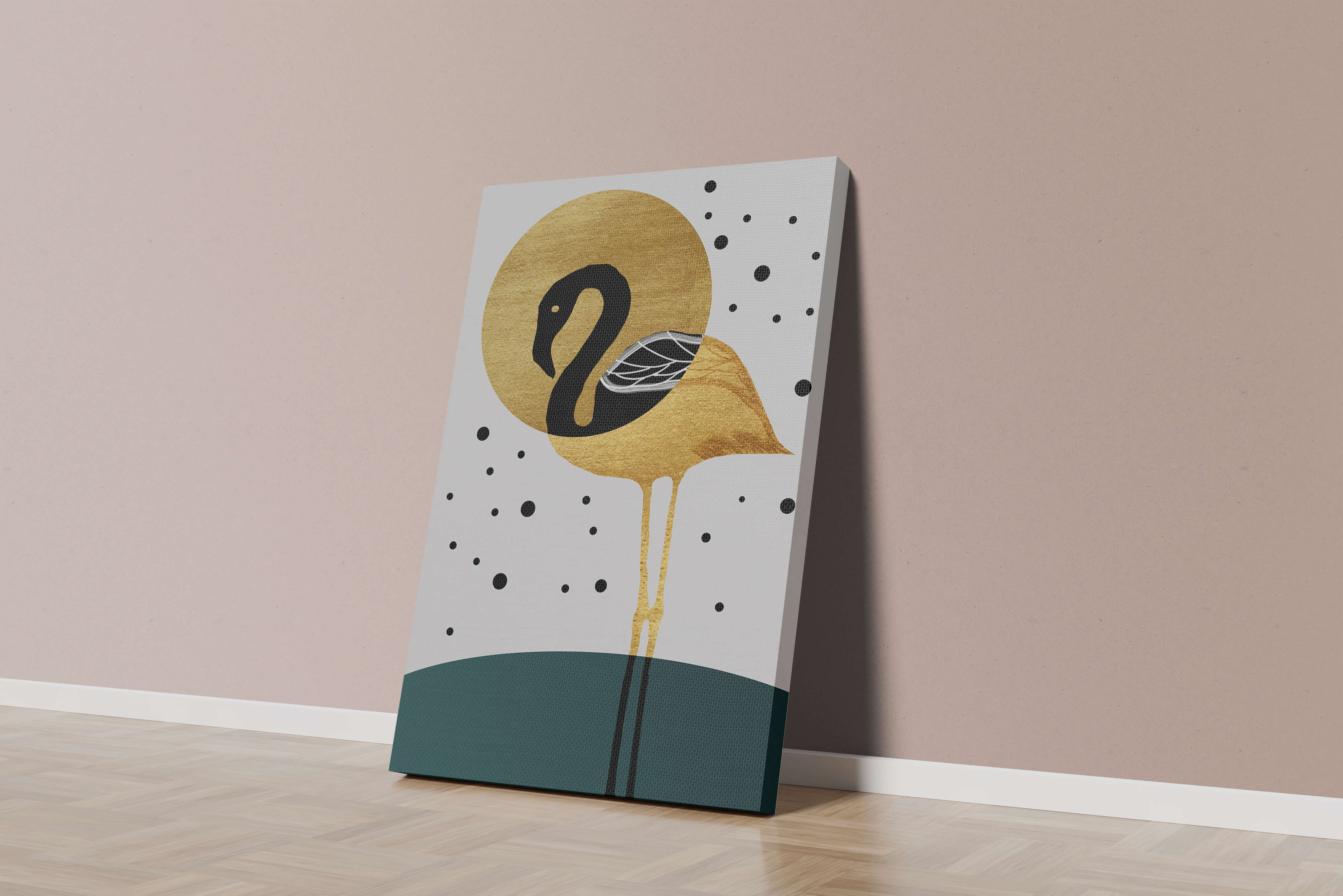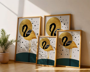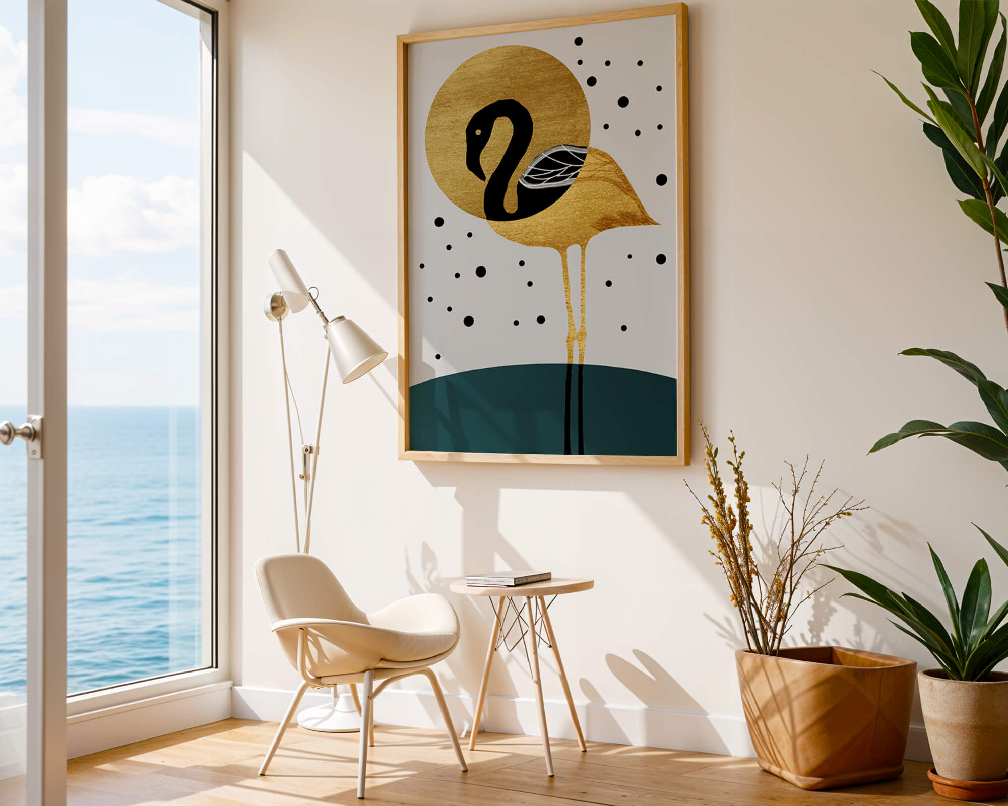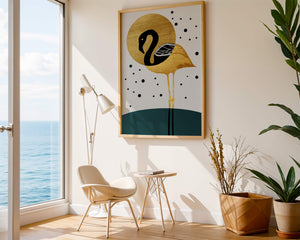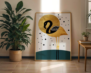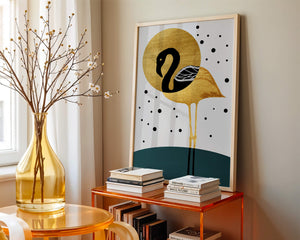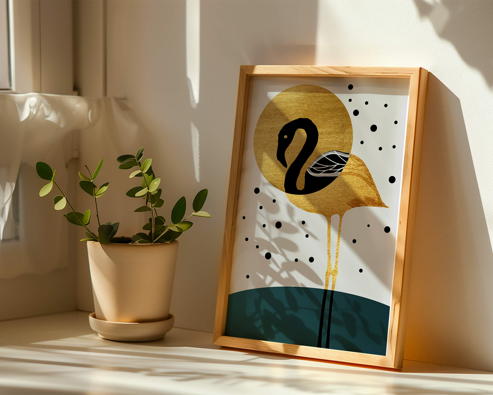 Esta ilustración cautivadora muestra una impresionante mezcla de elementos dorados y negros, destacando un flamenco contra un fondo moderno y abstracto. La combinación de colores y elementos de diseño crea una pieza visualmente impactante que es perfecta para cualquier entorno decorativo elegante.