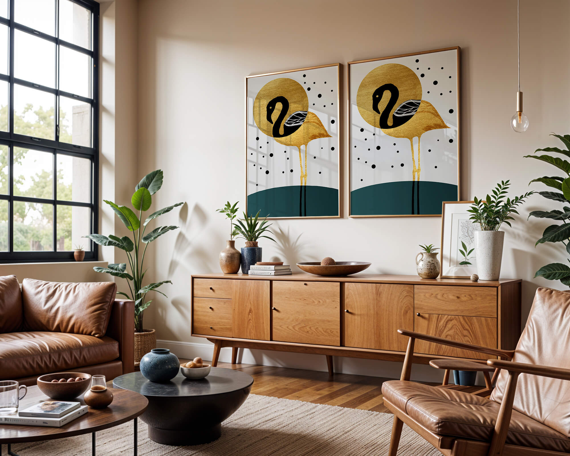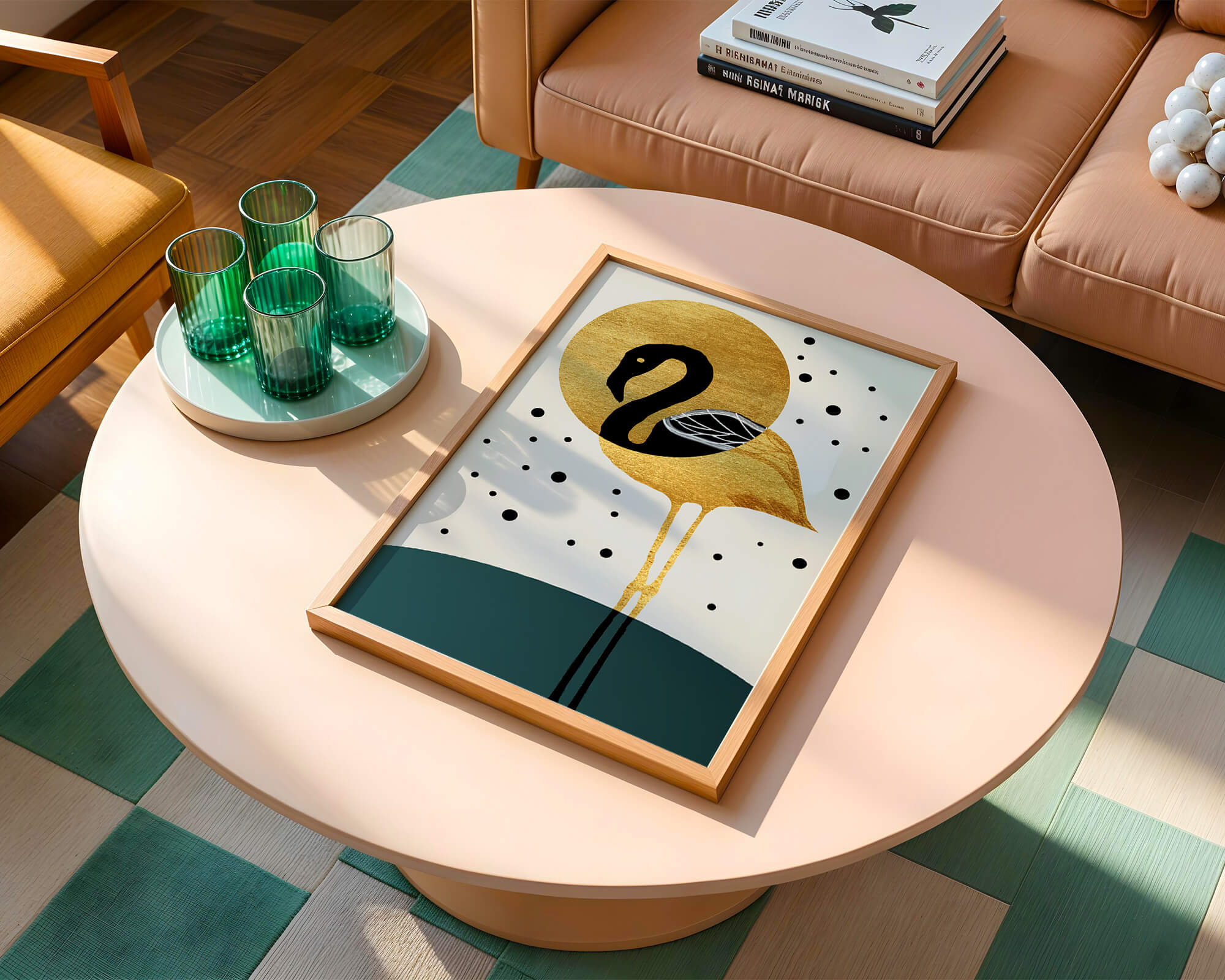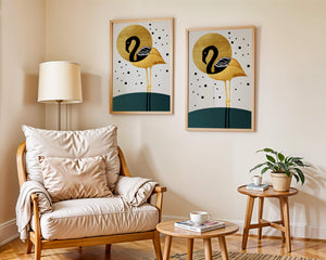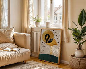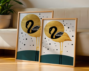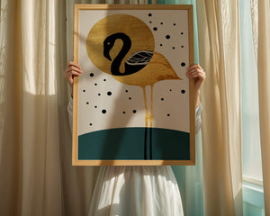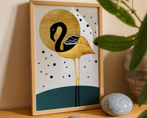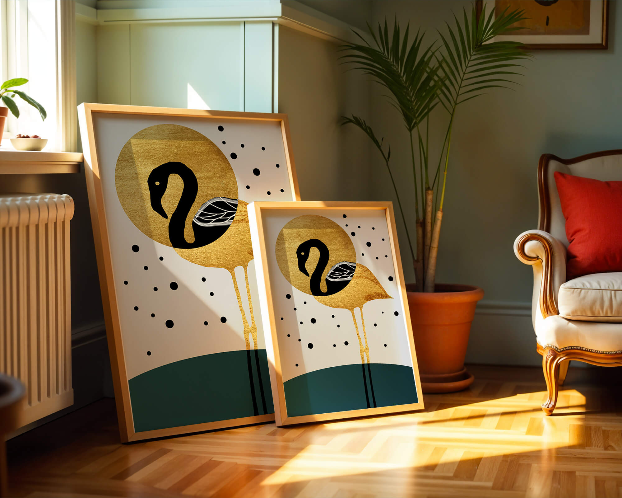 Esta ilustración cautivadora muestra una impresionante mezcla de elementos dorados y negros, destacando un flamenco contra un fondo moderno y abstracto. La combinación de colores y elementos de diseño crea una pieza visualmente impactante que es perfecta para cualquier entorno decorativo elegante.