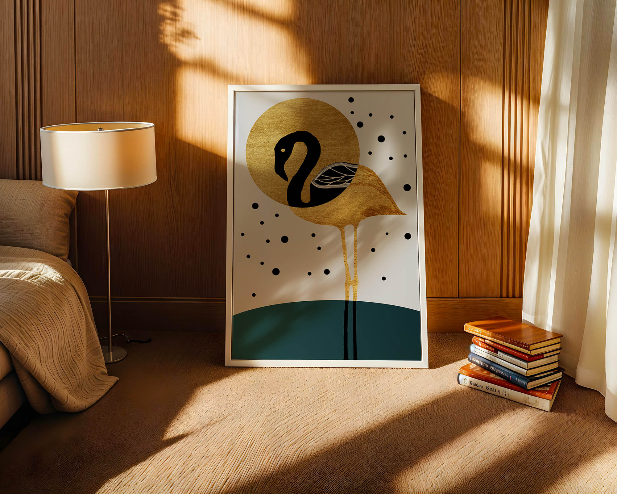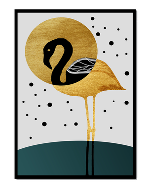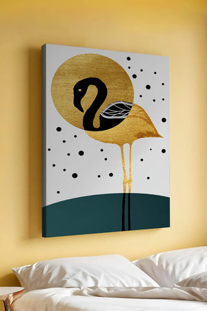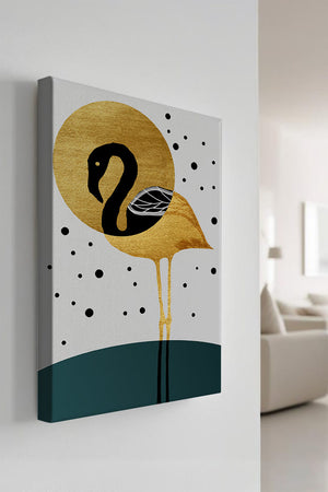 La imagen presenta un flamenco en tonos dorados y negros, bellamente contrastado contra un fondo suave. La adición de elementos de puntos negros añade un toque abstracto, mejorando la complejidad visual y la sofisticación de la pieza. Su diseño simple pero artístico lo convierte en una opción destacada para espacios modernos y contemporáneos. El uso del dorado en la ilustración evoca una sensación de lujo y grandeza, lo que lo convierte en una adición ideal para salas de estar, dormitorios o incluso espacios de oficina refinados. Esta obra de arte no solo sirve como elemento decorativo, sino también como tema de conversación, capturando la atención con su estilo artístico único.| Tipo |