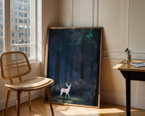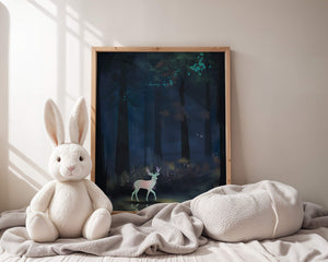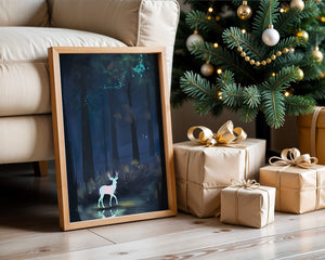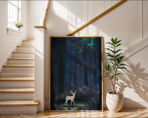 En una escena sacada directamente de un cuento de hadas, un ciervo resplandeciente se encuentra graciosamente en un bosque místico bajo la cobertura de la noche. El entorno sereno está iluminado por luces azules etéreas que bailan entre los árboles, proyectando un brillo onírico sobre el paisaje.
