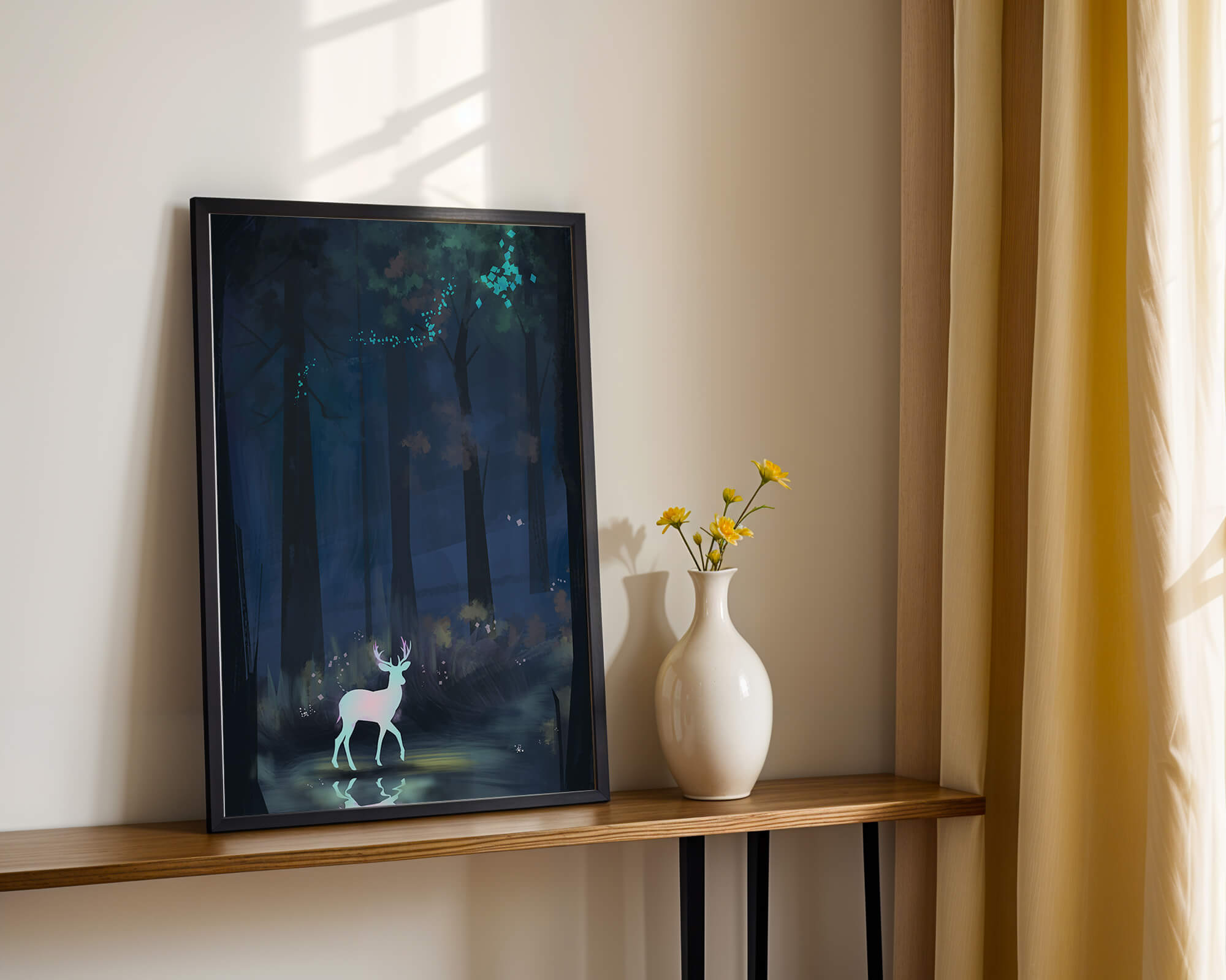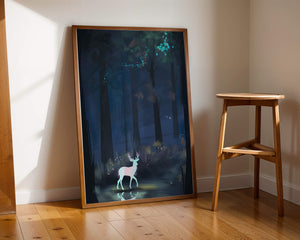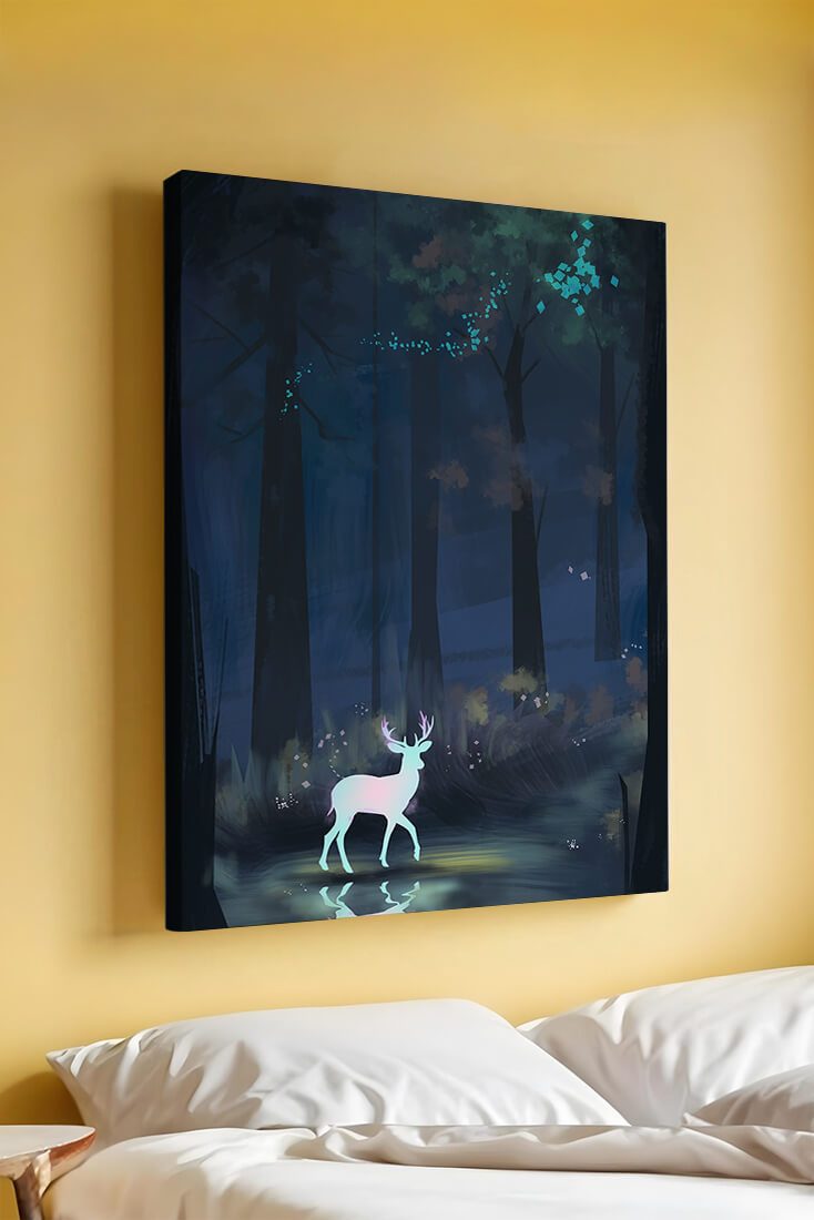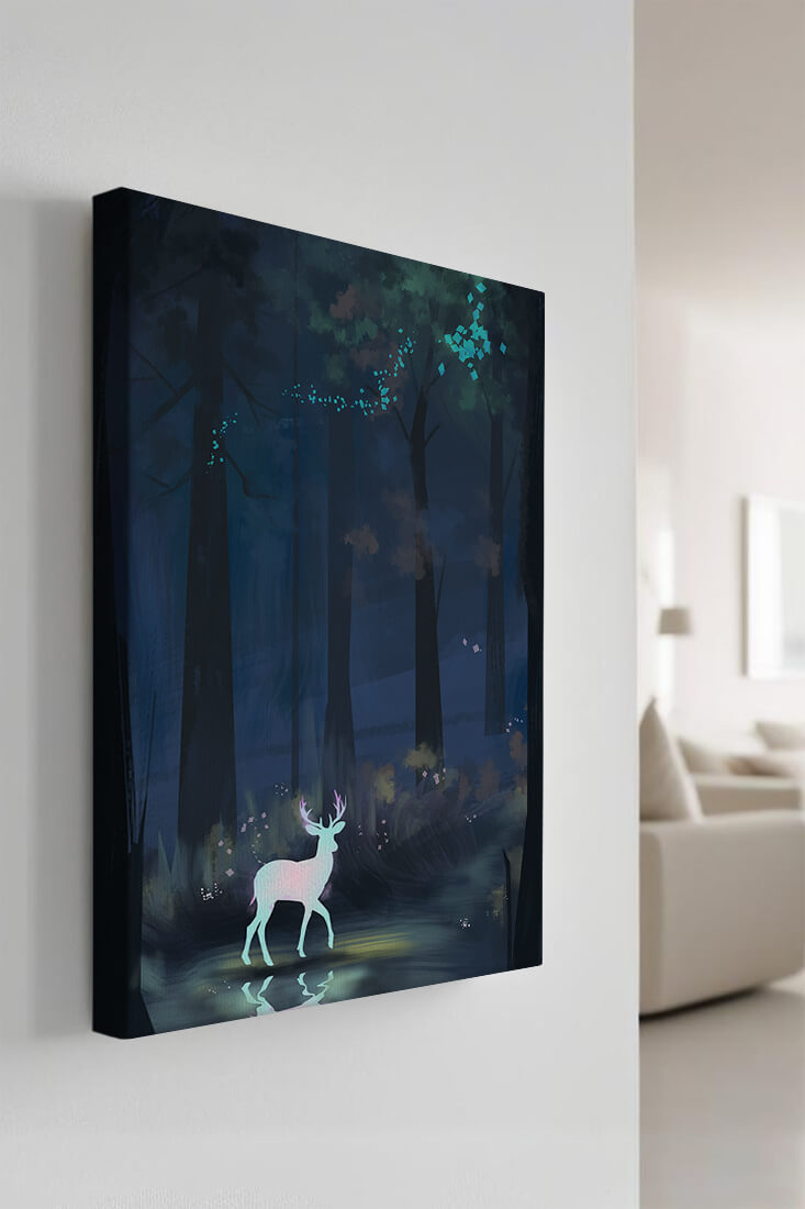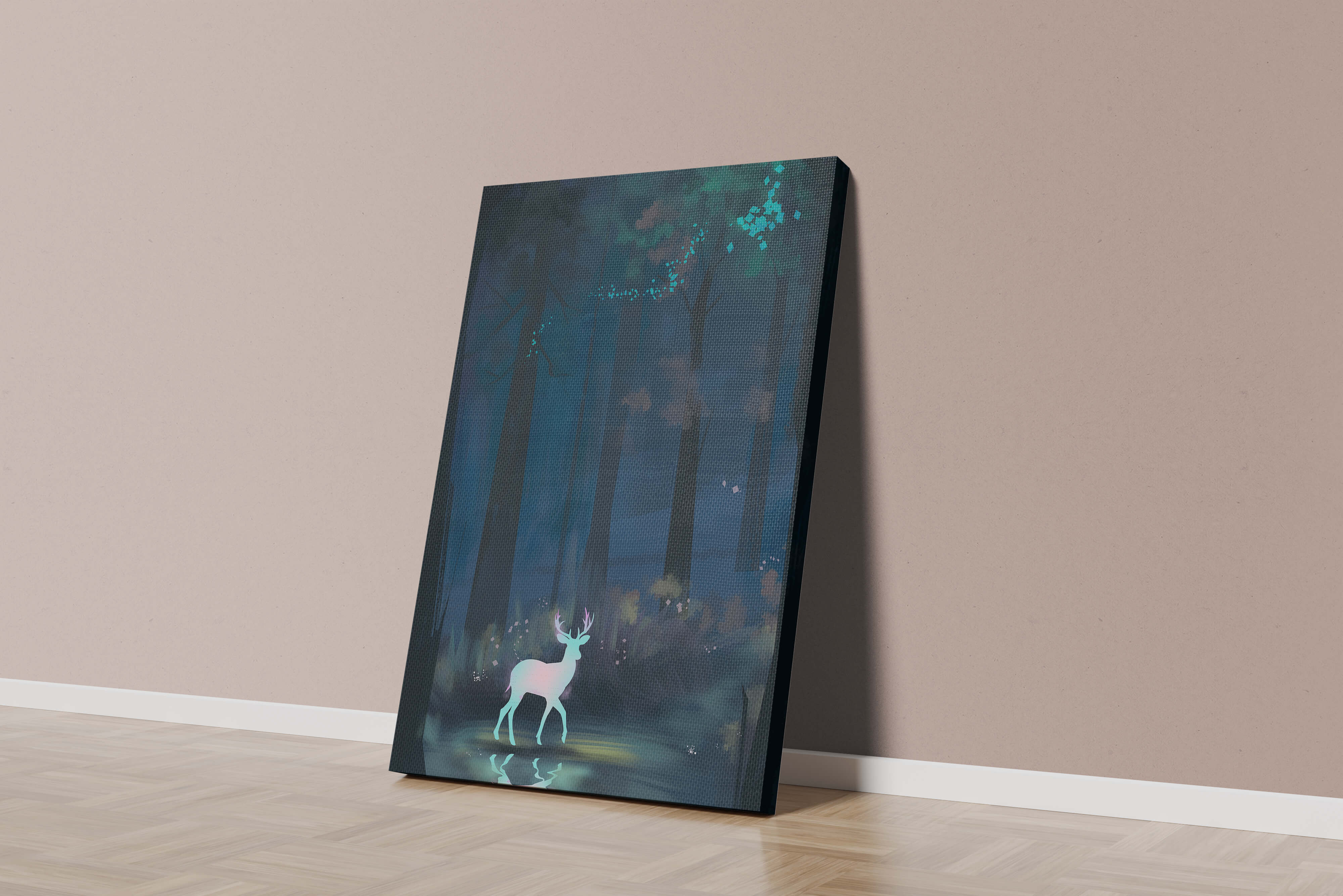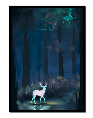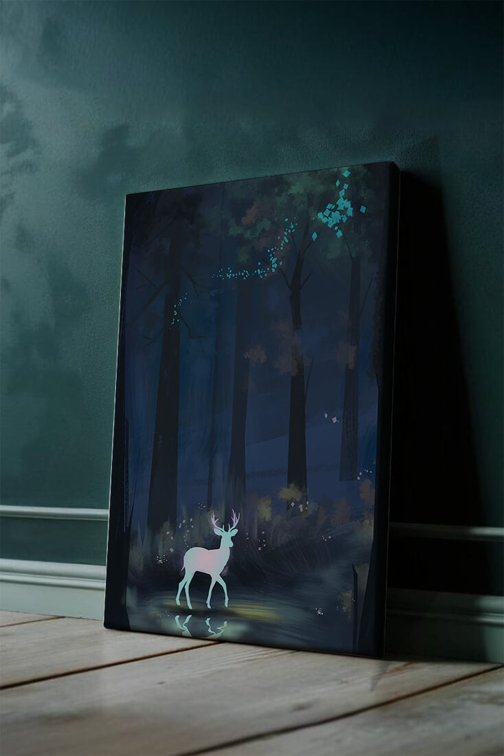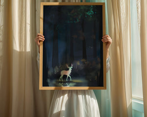 El bosque está representado en tonos profundos de azul y verde, creando una sensación de tranquilidad y misterio. Árboles altos y oscuros se extienden hacia arriba, sus hojas filtran la luz de la luna que baña la escena con un brillo suave. Entre ellos, un majestuoso ciervo con astas radiantes camina silenciosamente, su presencia luminosa se refleja en la brillante piscina debajo. Esta cautivadora escena captura la imaginación, ofreciendo un vistazo a un mundo donde la naturaleza se mezcla sin problemas con la fantasía. Invita a los espectadores a adentrarse en este reino mágico, donde cada sombra guarda un secreto, y cada destello de luz promete una aventura. La artesanía y el detalle evocan una sensación de paz y asombro, convirtiéndolo en una obra perfecta.| Tipo |