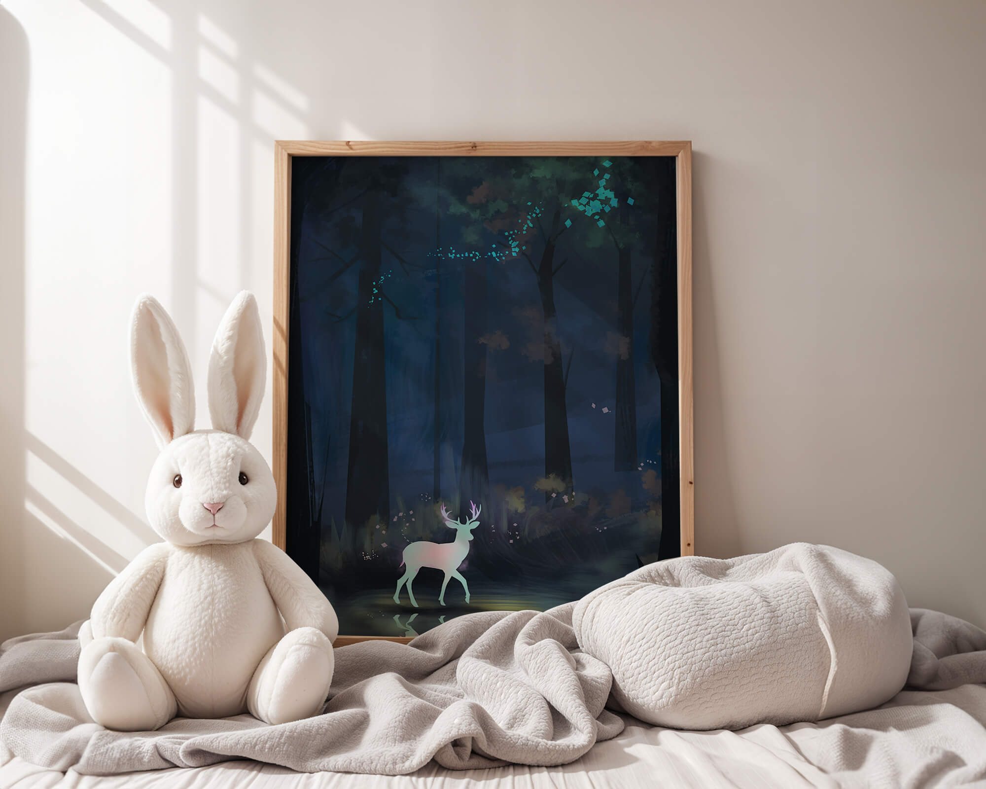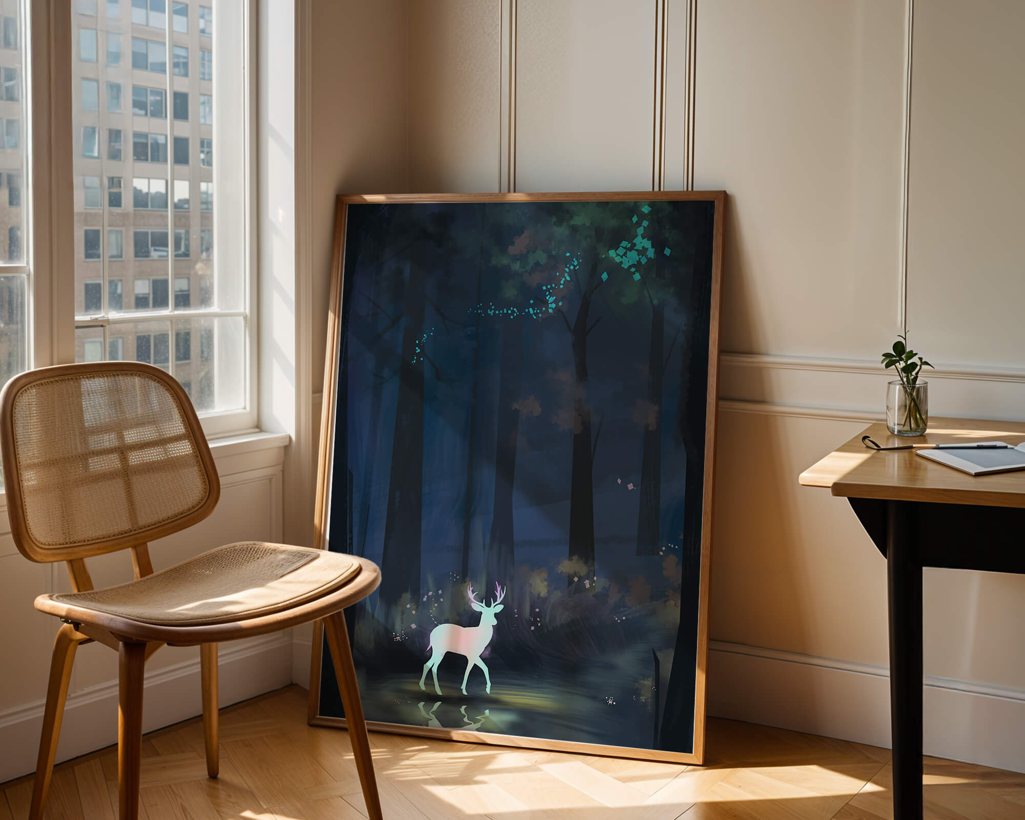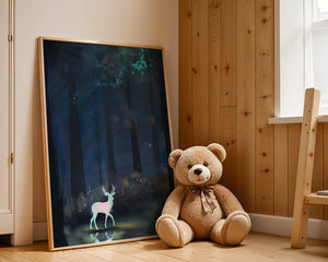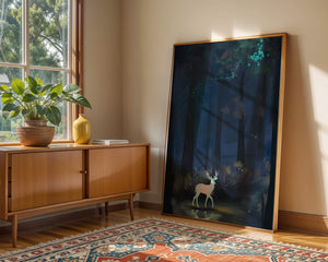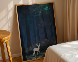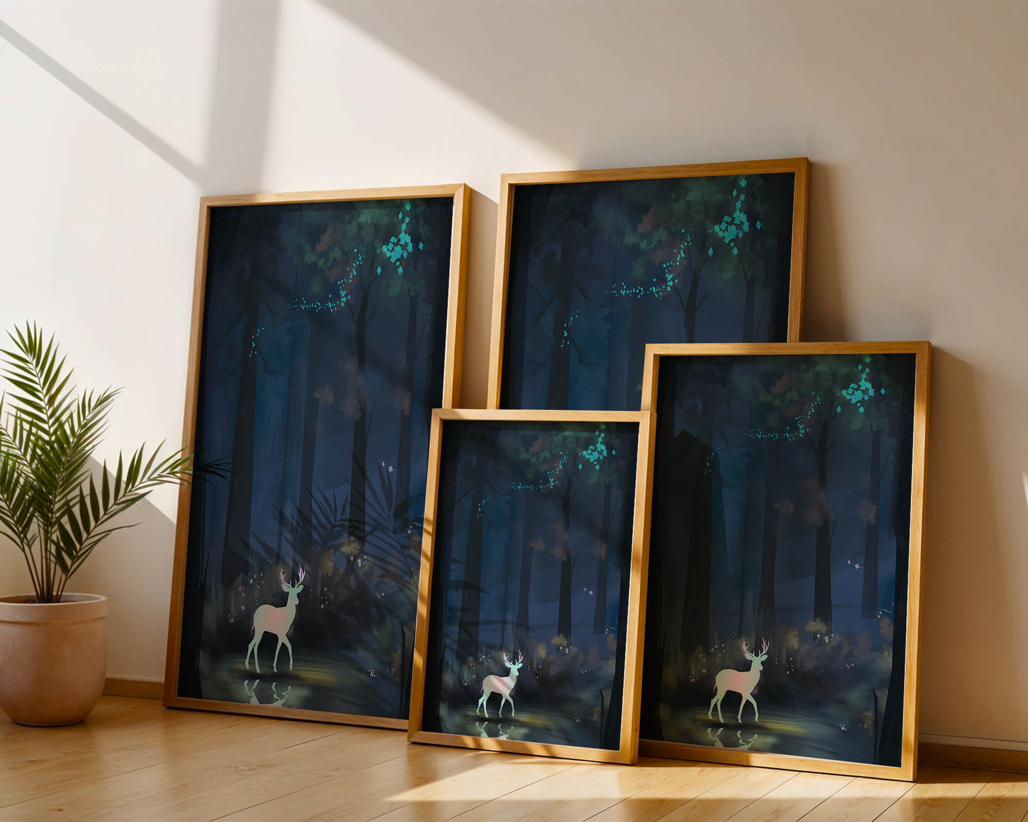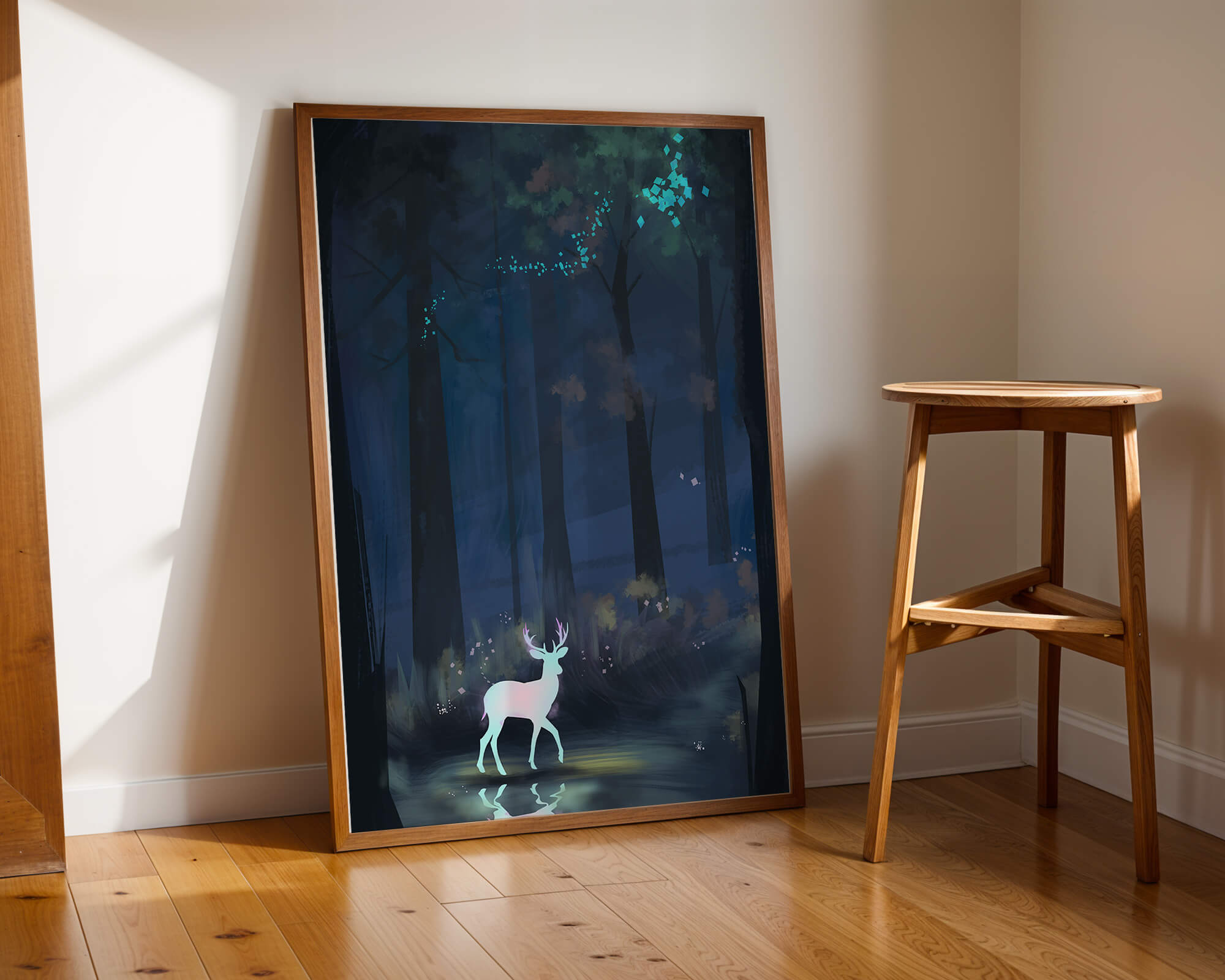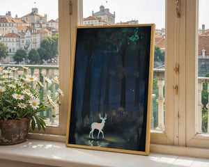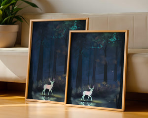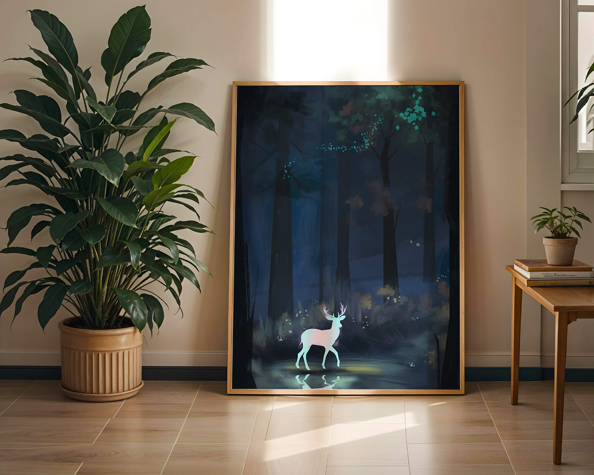 El bosque está representado en tonos profundos de azul y verde, creando una sensación de tranquilidad y misterio. Árboles altos y oscuros se extienden hacia arriba, sus hojas filtran la luz de la luna que baña la escena con un brillo suave. Entre ellos, un majestuoso ciervo con astas radiantes camina silenciosamente, su presencia luminosa se refleja en la brillante piscina debajo. Esta cautivadora escena captura la imaginación, ofreciendo un vistazo a un mundo donde la naturaleza se mezcla sin problemas con la fantasía. Invita a los espectadores a adentrarse en este reino mágico, donde cada sombra guarda un secreto, y cada destello de luz promete una aventura. La artesanía y el detalle evocan una sensación de paz y asombro, convirtiéndolo en una obra perfecta.| Tipo |