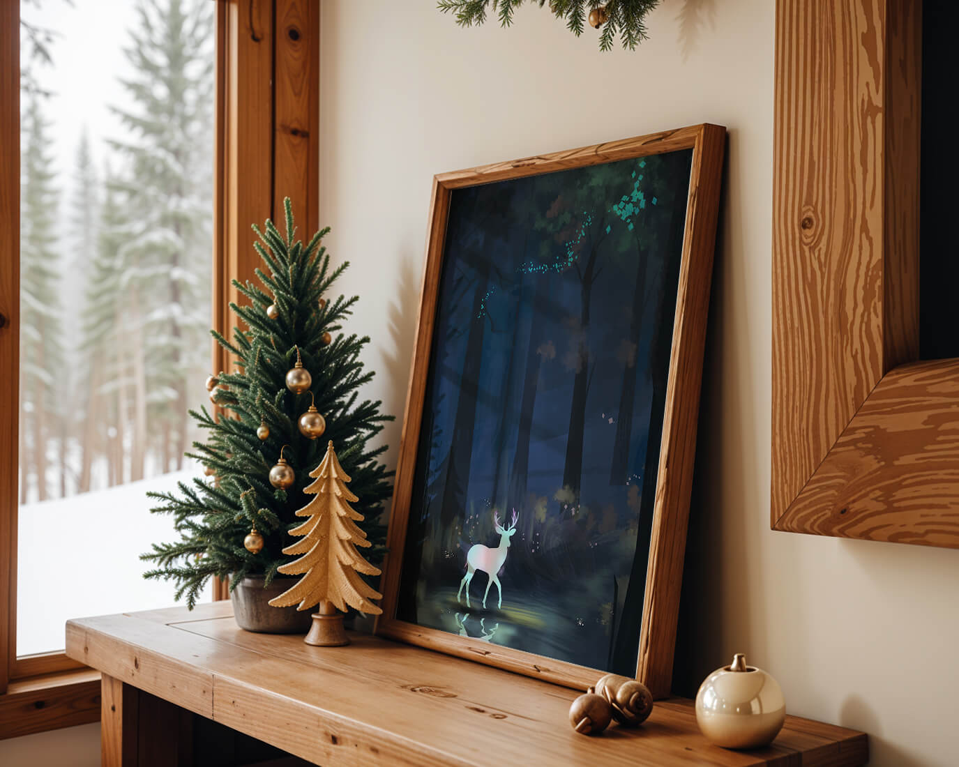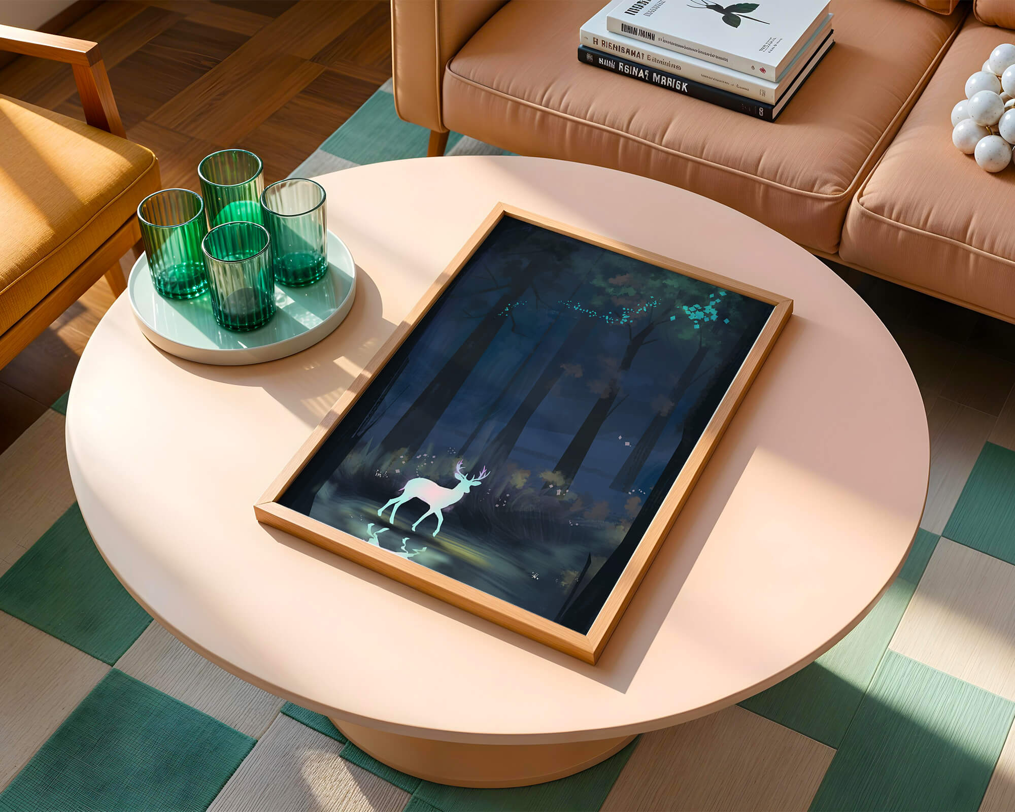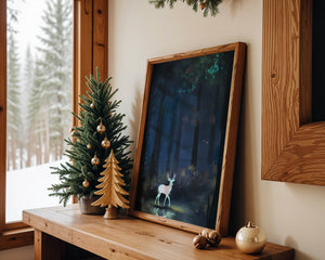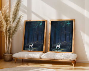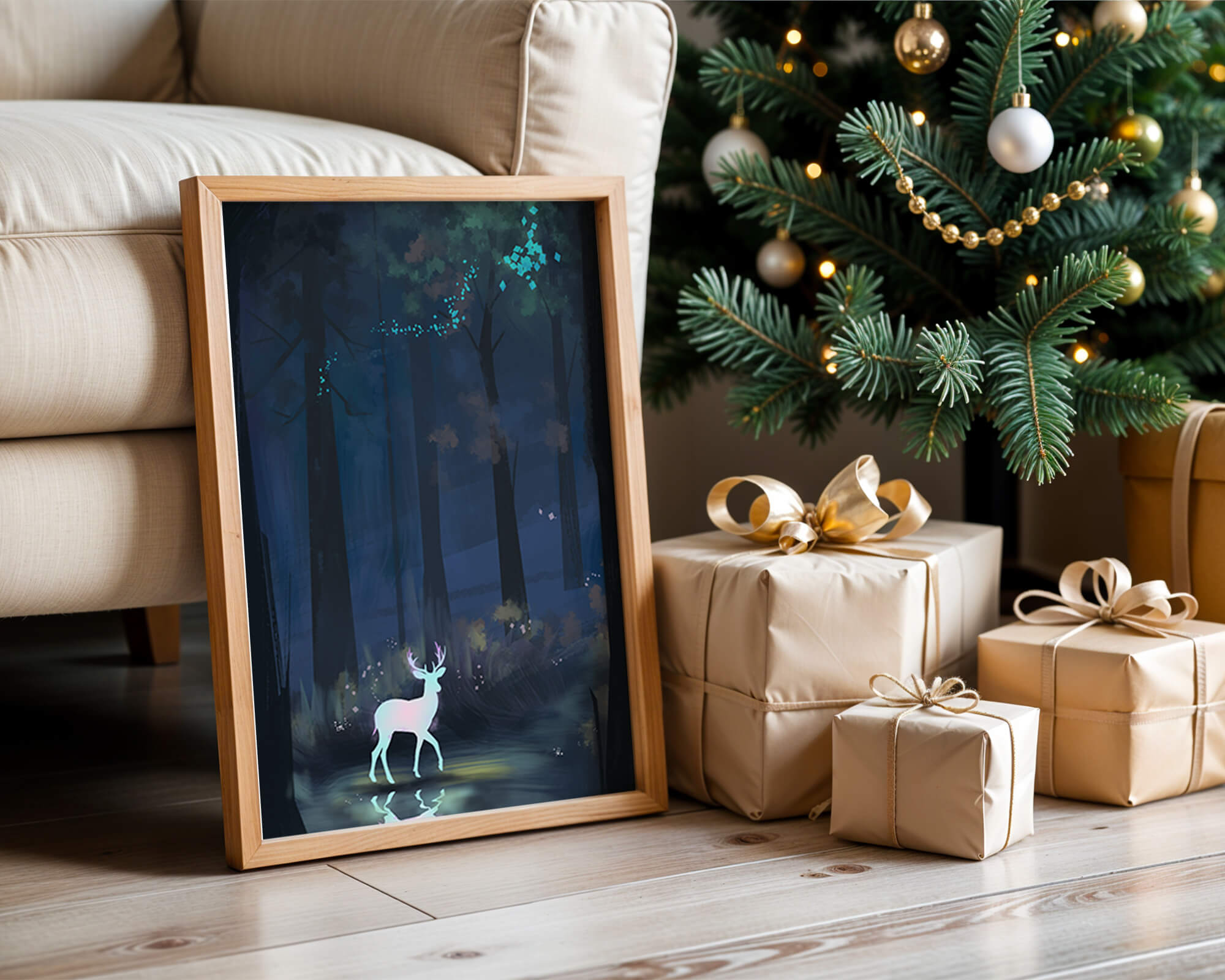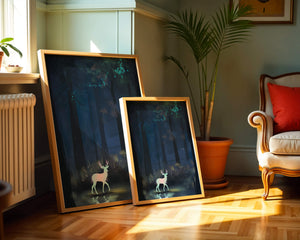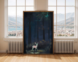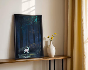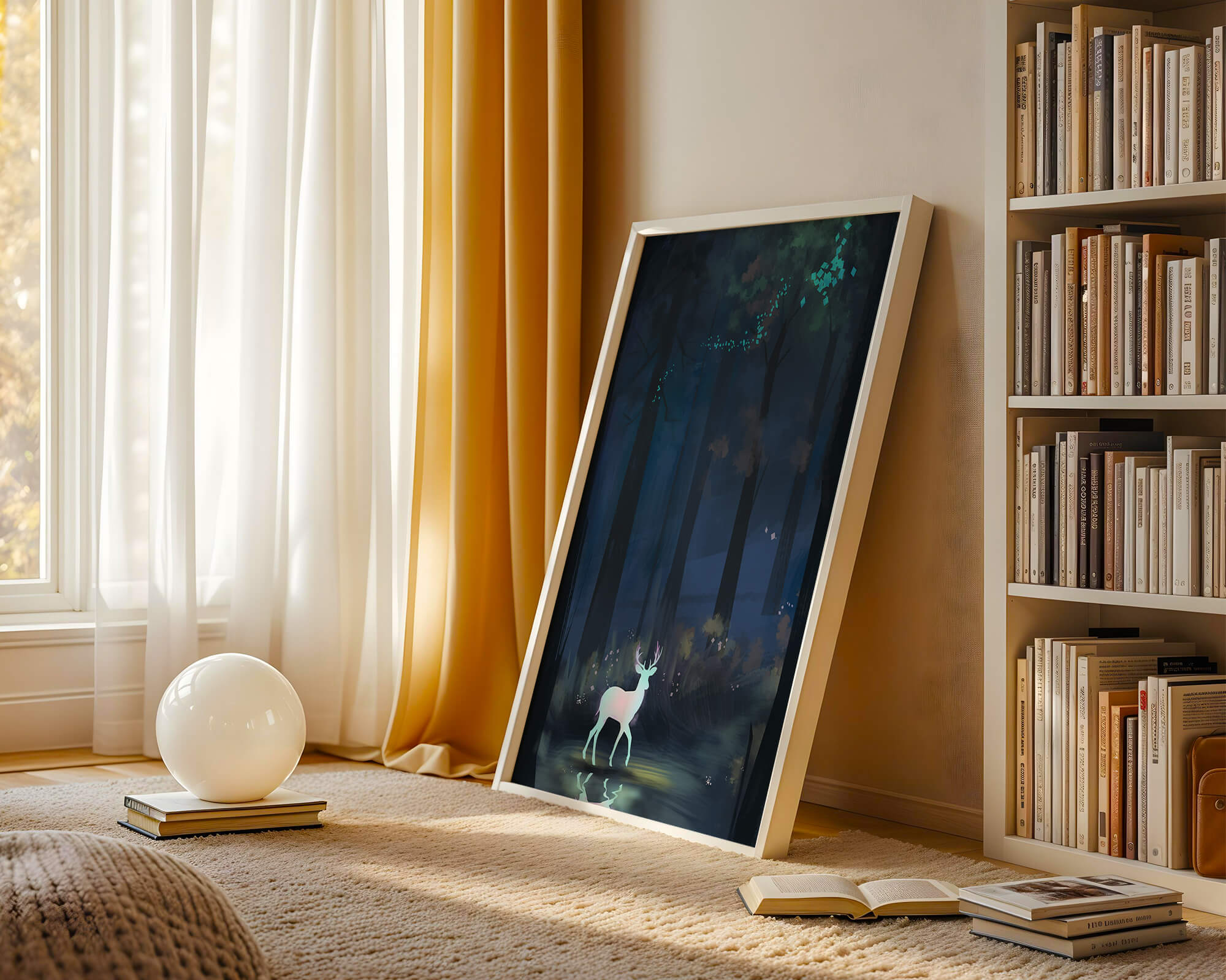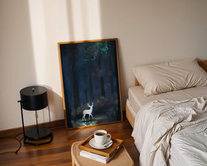 El bosque está representado en tonos profundos de azul y verde, creando una sensación de tranquilidad y misterio. Árboles altos y oscuros se extienden hacia arriba, sus hojas filtran la luz de la luna que baña la escena con un brillo suave. Entre ellos, un majestuoso ciervo con astas radiantes camina silenciosamente, su presencia luminosa se refleja en la brillante piscina debajo. Esta cautivadora escena captura la imaginación, ofreciendo un vistazo a un mundo donde la naturaleza se mezcla sin problemas con la fantasía. Invita a los espectadores a adentrarse en este reino mágico, donde cada sombra guarda un secreto, y cada destello de luz promete una aventura. La artesanía y el detalle evocan una sensación de paz y asombro, convirtiéndolo en una obra perfecta.| Tipo |