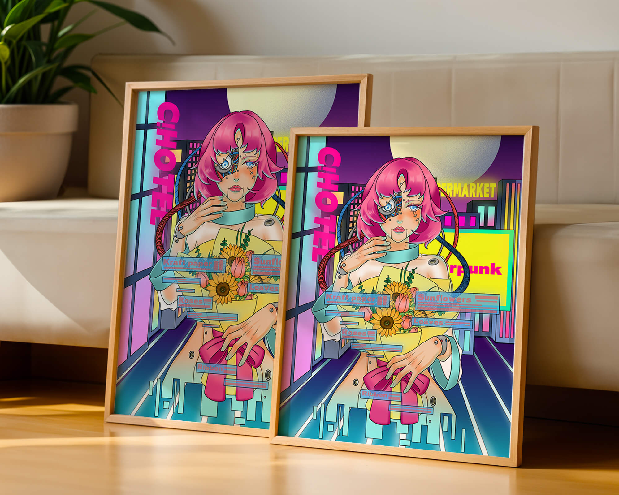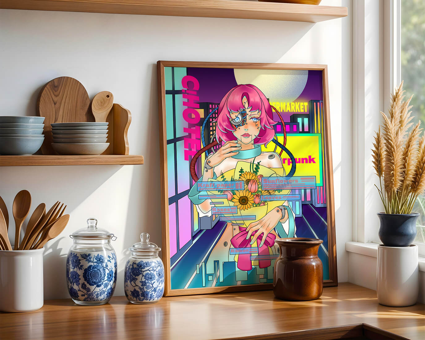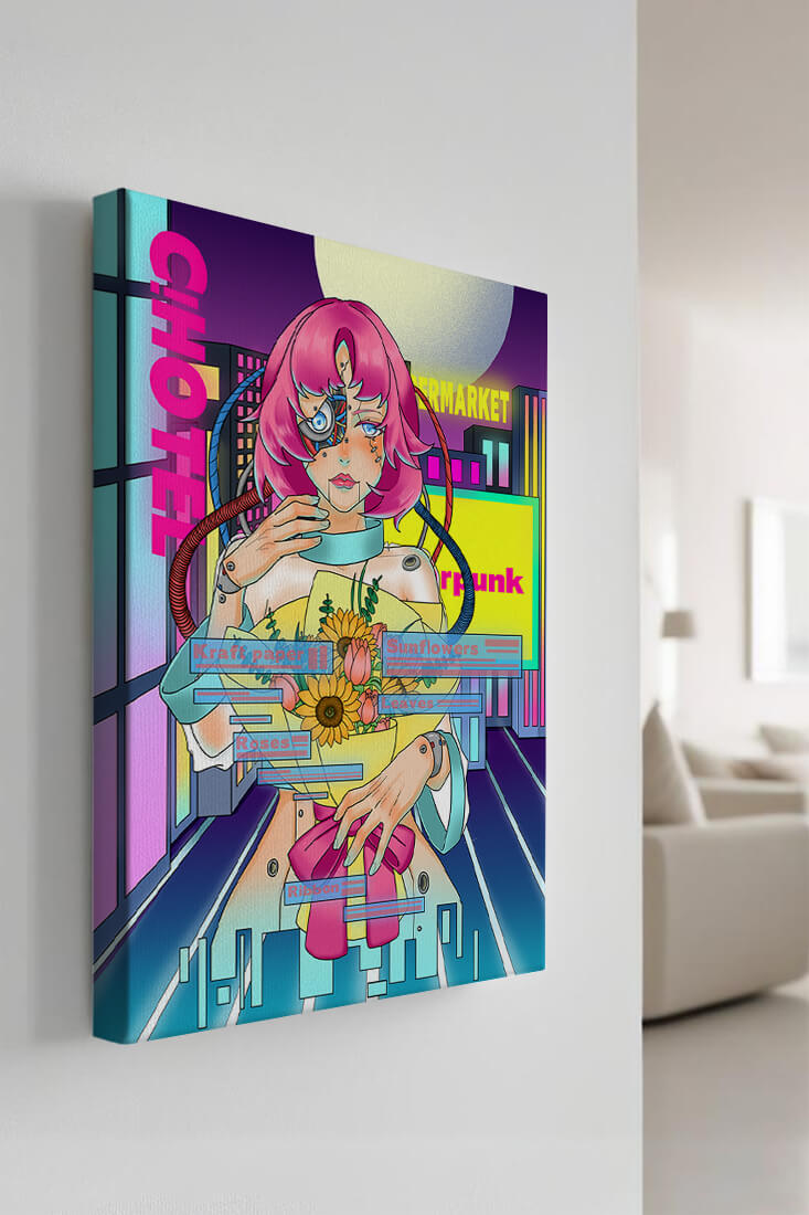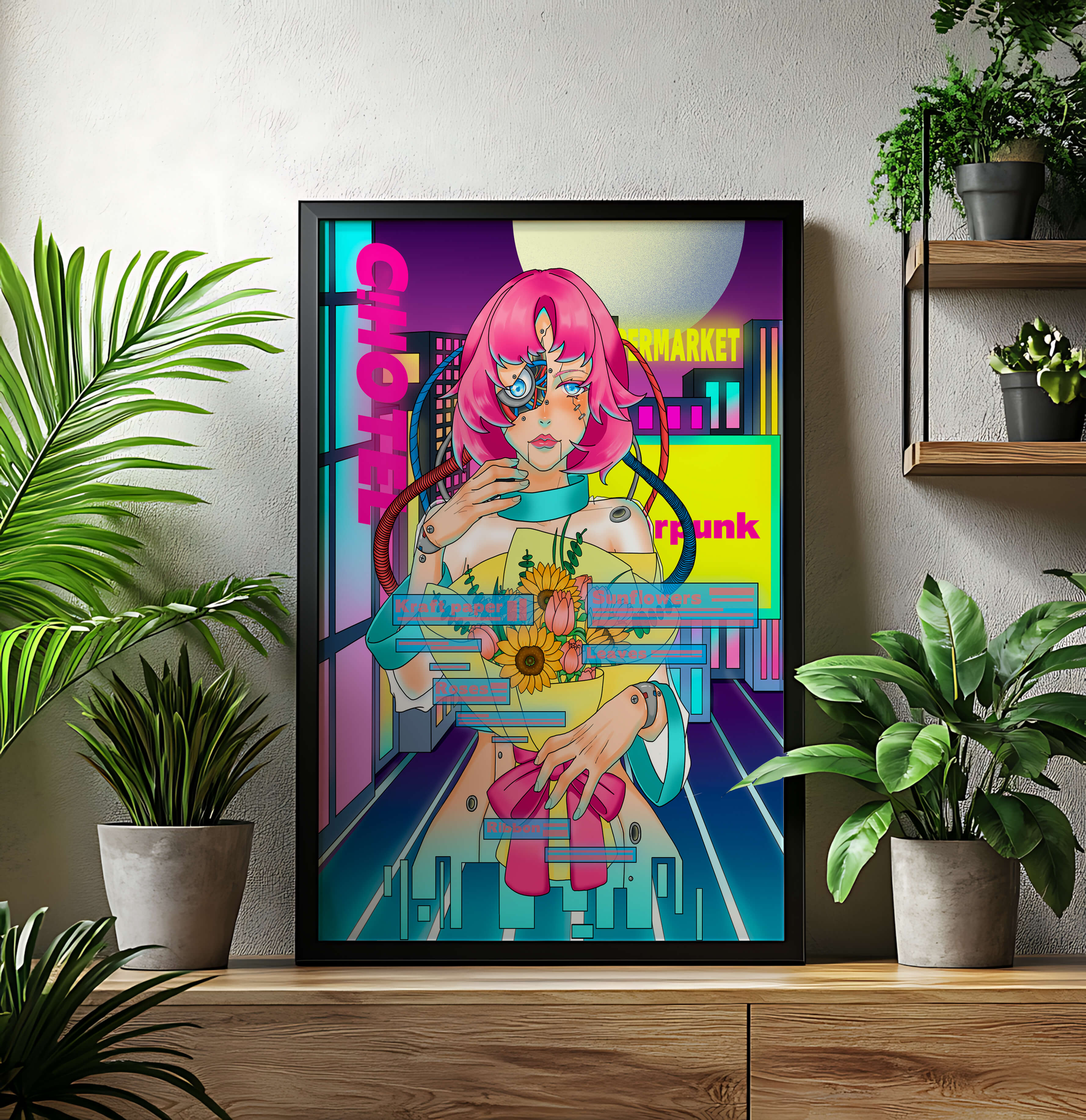 La mujer sostiene un ramo de flores, con girasoles y rosas envueltas en papel kraft y atadas con una cinta vibrante. Los colores contrastantes y los elementos orgánicos del ramo se mezclan sin problemas con el paisaje digital circundante. Su mirada es pensativa, tal vez sugiriendo un momento introspectivo en medio del bullicioso entorno urbano. Los edificios adyacentes muestran letreros llamativos, incluidas las coloridas palabras "hotel" y "supermercado", añadiendo profundidad a la escena. Esta imagen es un testimonio de la creativa colisión entre lo natural y lo artificial, invitando a los espectadores a reflexionar sobre las implicaciones de un futuro tan avanzado.| Tipo |