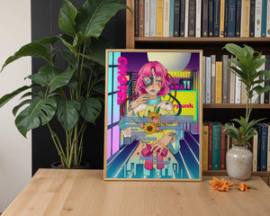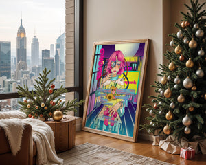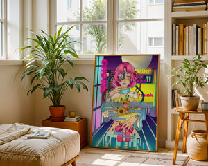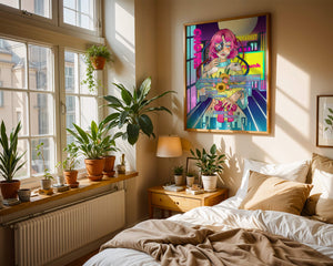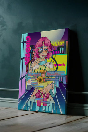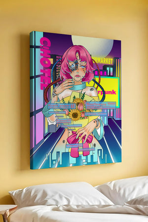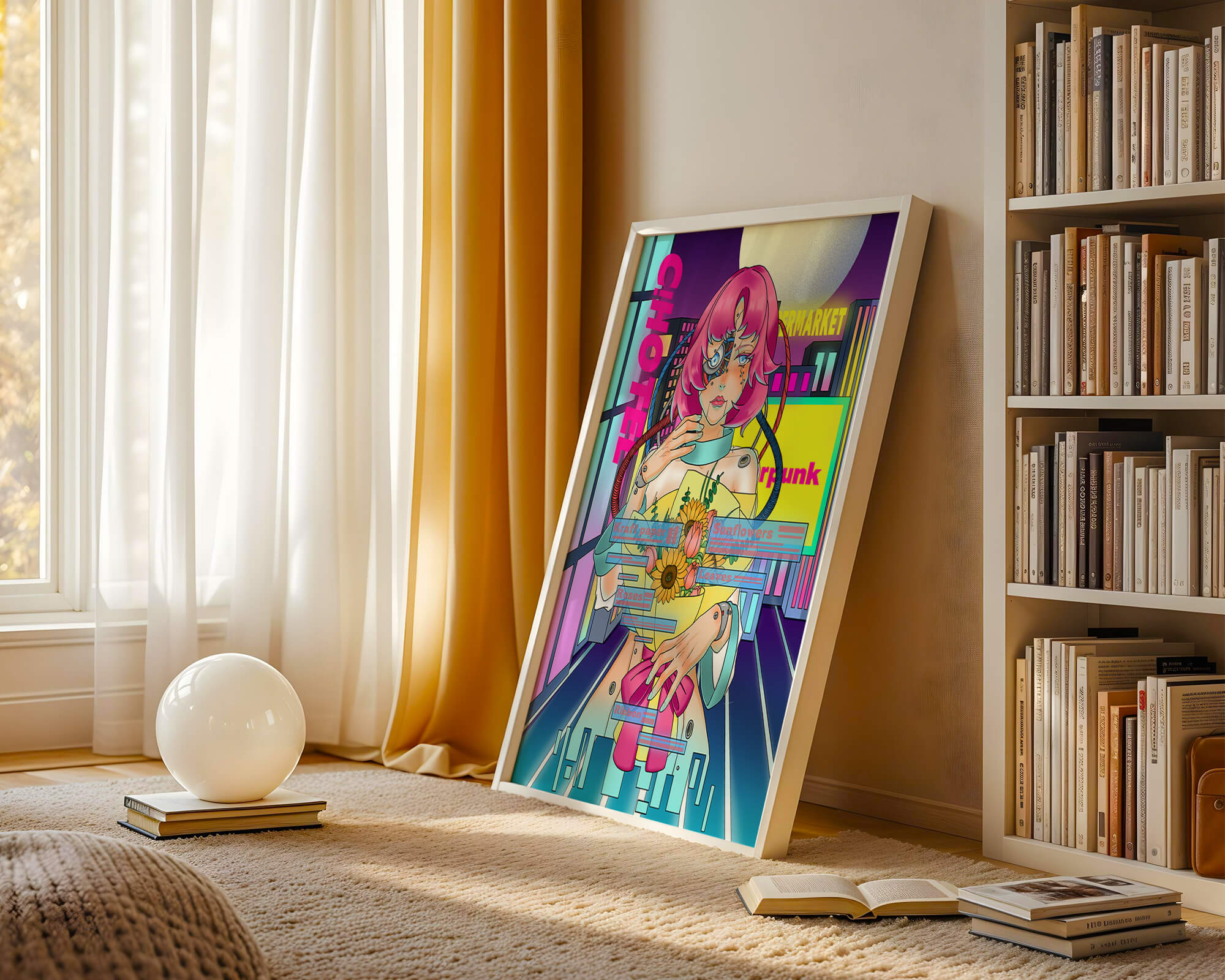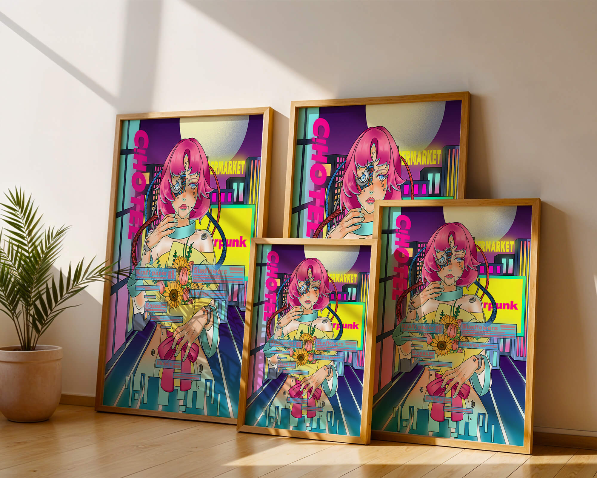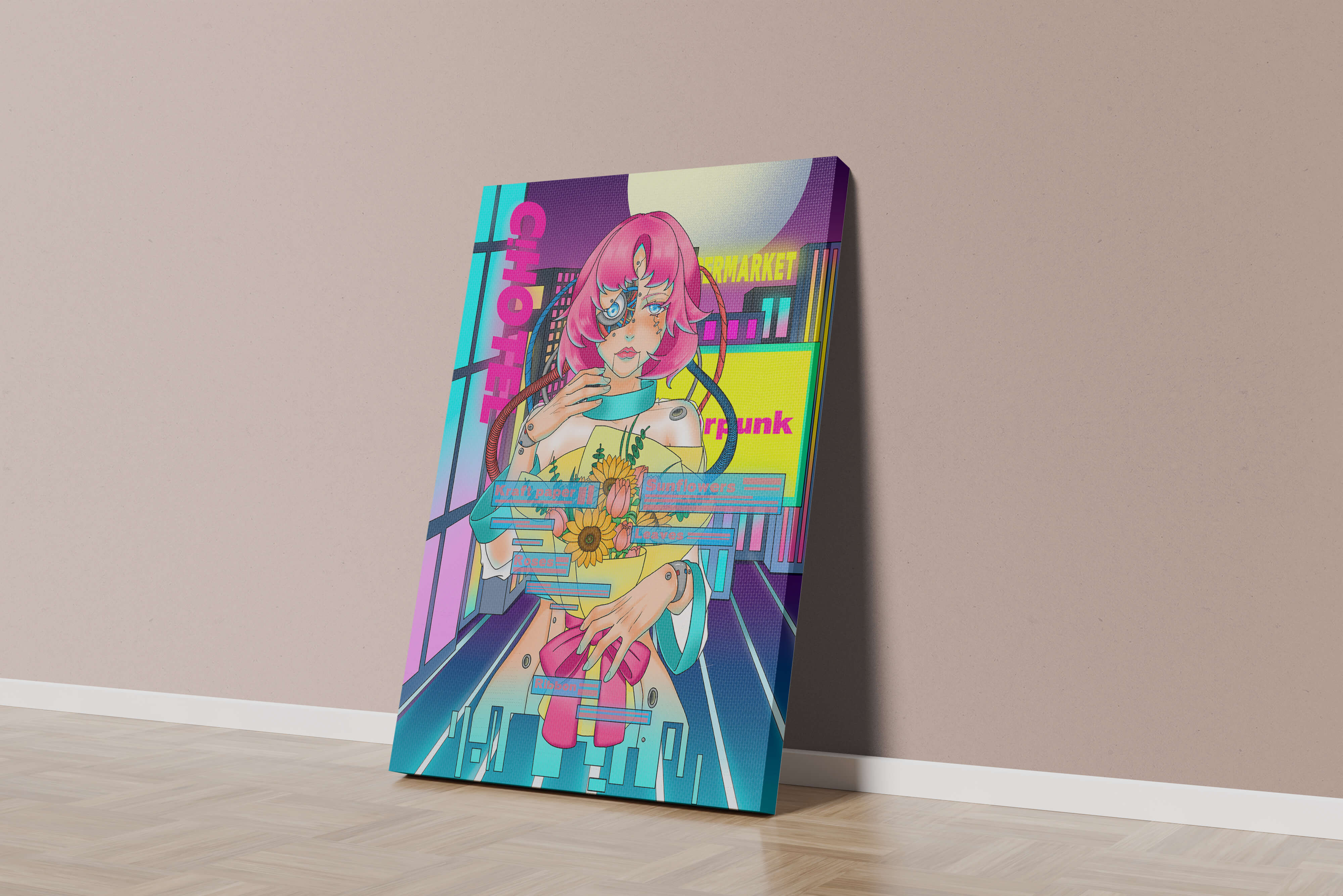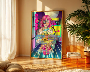 La mujer sostiene un ramo de flores, con girasoles y rosas envueltas en papel kraft y atadas con una cinta vibrante. Los colores contrastantes y los elementos orgánicos del ramo se mezclan sin problemas con el paisaje digital circundante. Su mirada es pensativa, tal vez sugiriendo un momento introspectivo en medio del bullicioso entorno urbano. Los edificios adyacentes muestran letreros llamativos, incluidas las coloridas palabras "hotel" y "supermercado", añadiendo profundidad a la escena. Esta imagen es un testimonio de la creativa colisión entre lo natural y lo artificial, invitando a los espectadores a reflexionar sobre las implicaciones de un futuro tan avanzado.| Tipo |