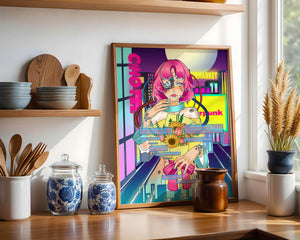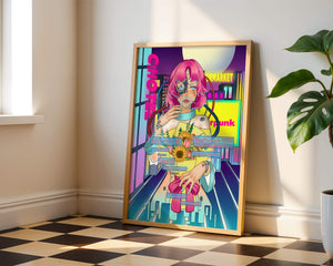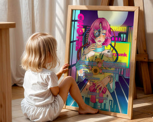 En esta cautivadora imagen con temática de ciberpunk, una mujer futurista de cabello rosa se encuentra en un vibrante paisaje urbano iluminado por neones. Sus mejoras cibernéticas están integradas intrincadamente con su apariencia impactante, creando una fusión única de humanidad y tecnología. Las luces brillantes de la ciudad proporcionan un telón de fondo dramático, proyectando reflejos a través de una ventana cercana.