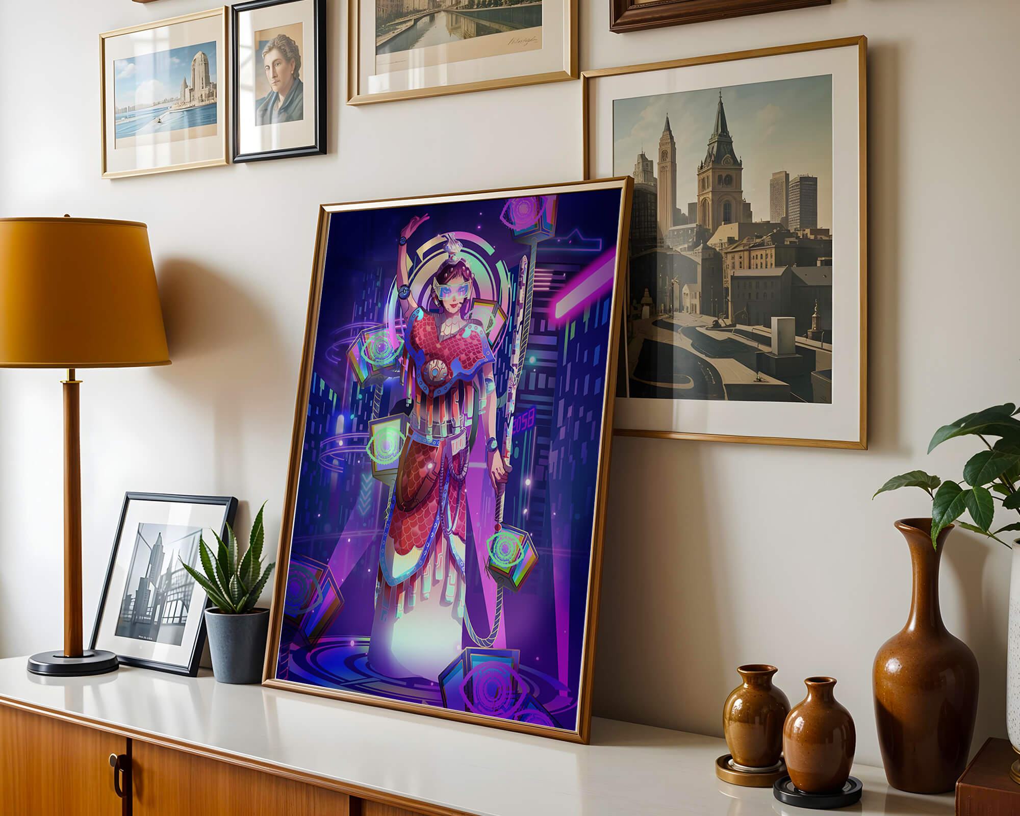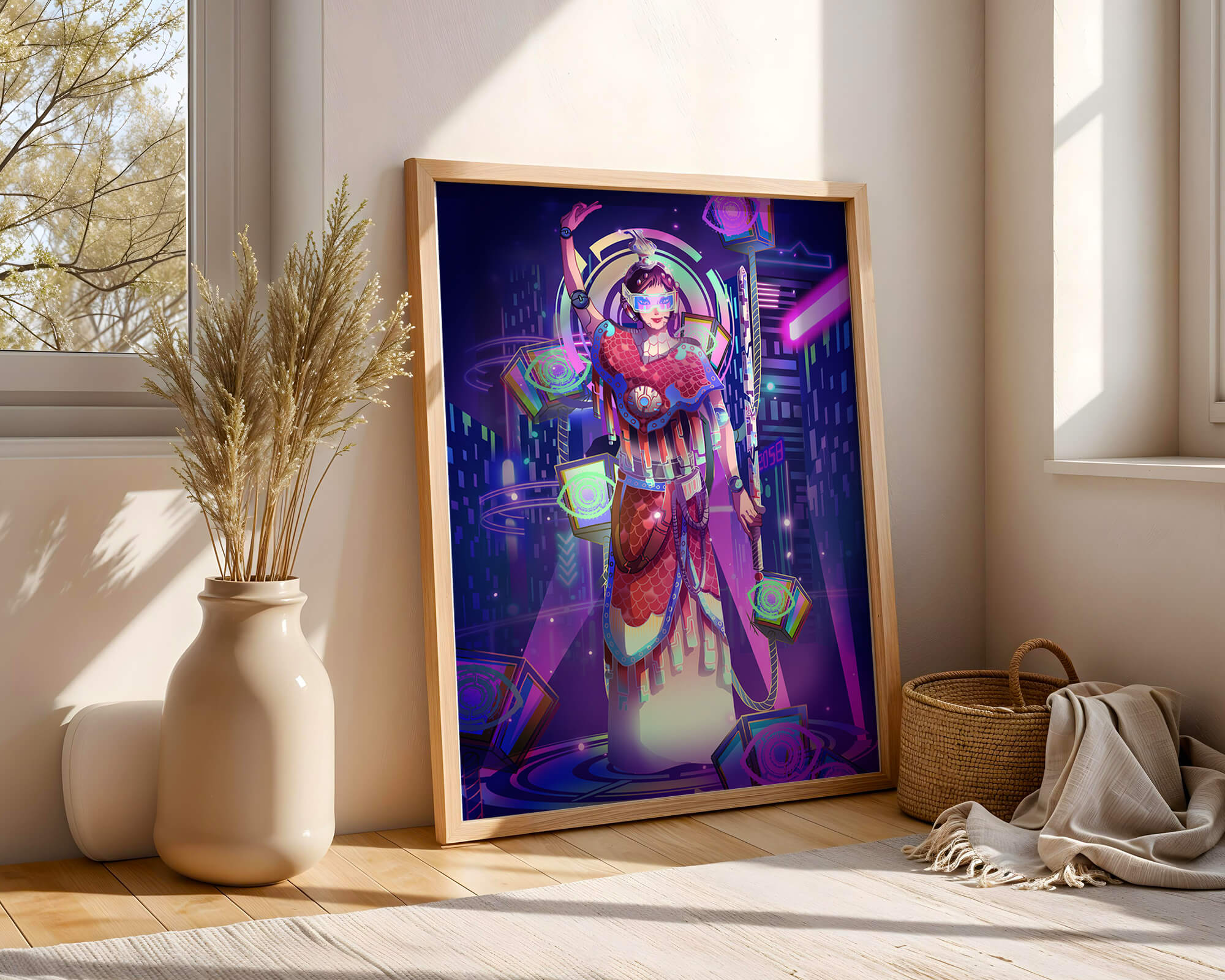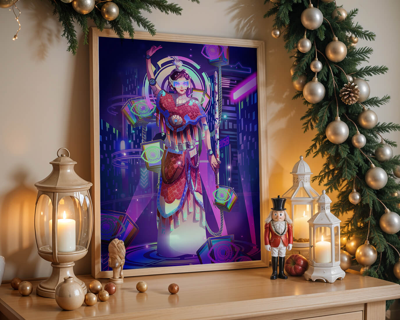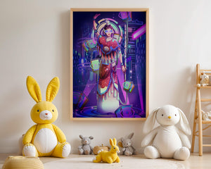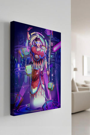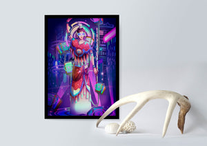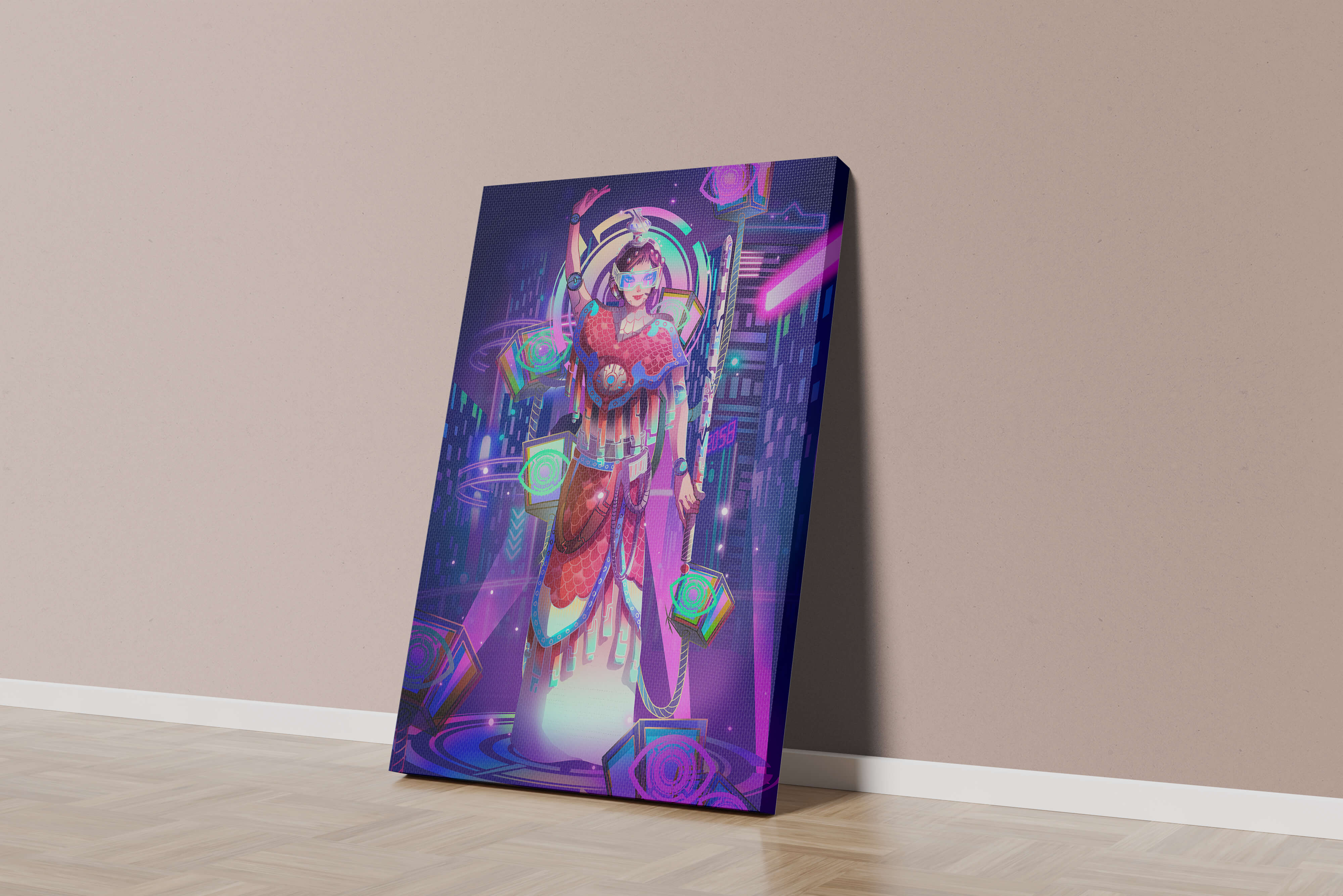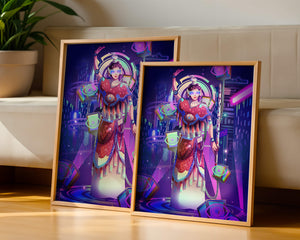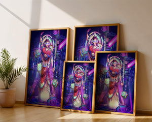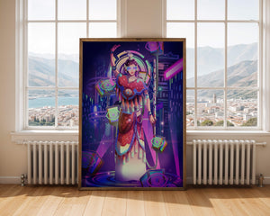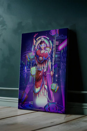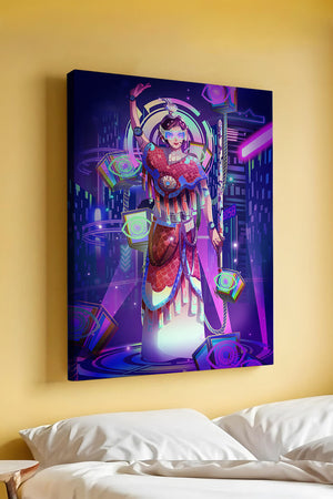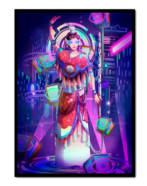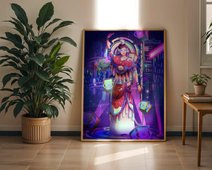 Esta obra de arte captura la esencia de un entorno ciberpunk, presentando una figura poderosa con armadura elaborada. El guerrero está adornado con accesorios luminosos y empuña un arma que emana energía. Alrededor del personaje hay cubos flotantes y patrones digitales que añaden una cualidad surrealista a la escena. El fondo es un vasto paisaje urbano, iluminado por innumerables luces de neón. Los tonos de púrpura, azul y rosa dominan la paleta, realzando el ambiente extraterrestre. Esta imagen combina bellamente elementos de la realidad virtual y la moda futurista, convirtiéndola en una representación cautivadora del arte digital.| Tipo |