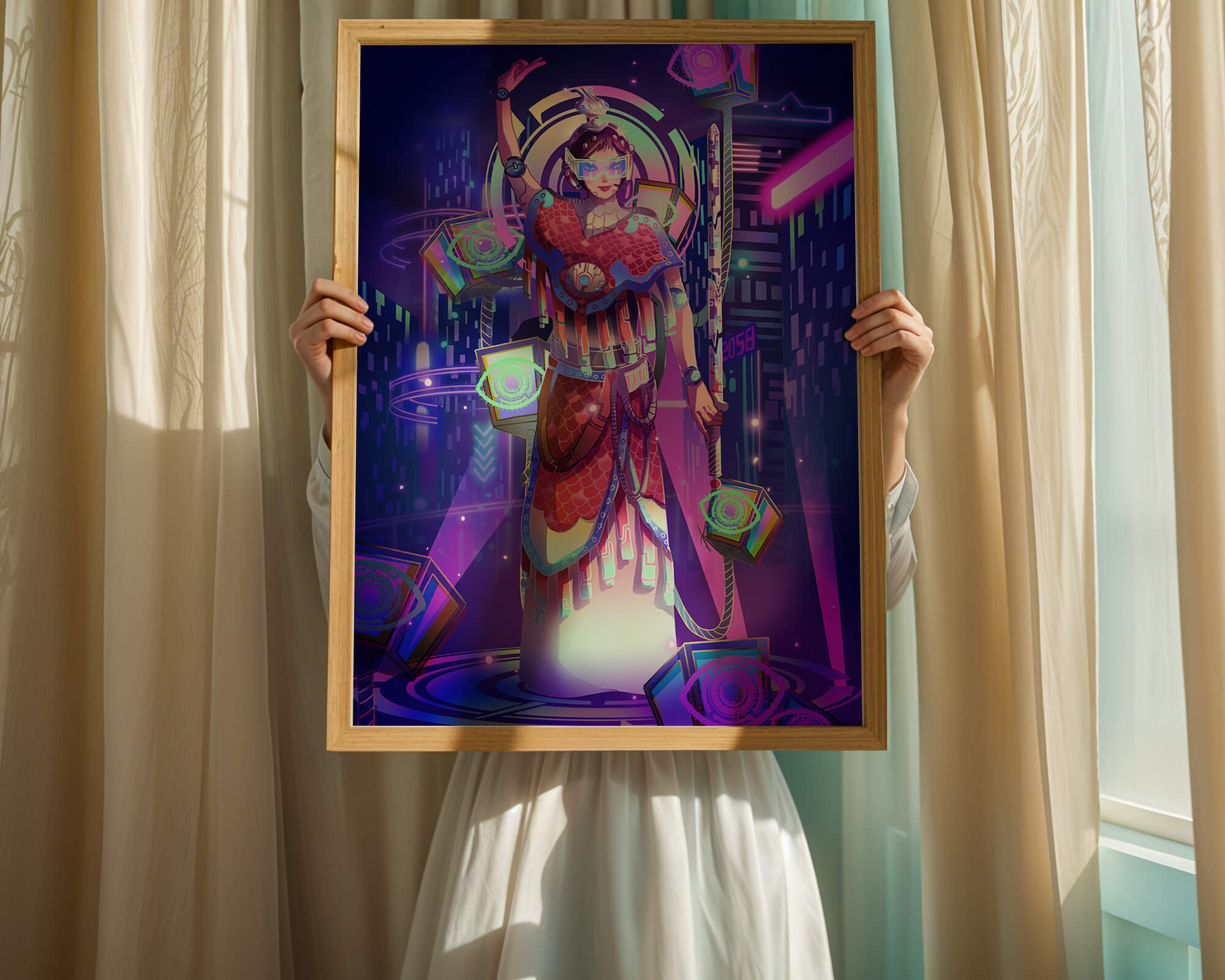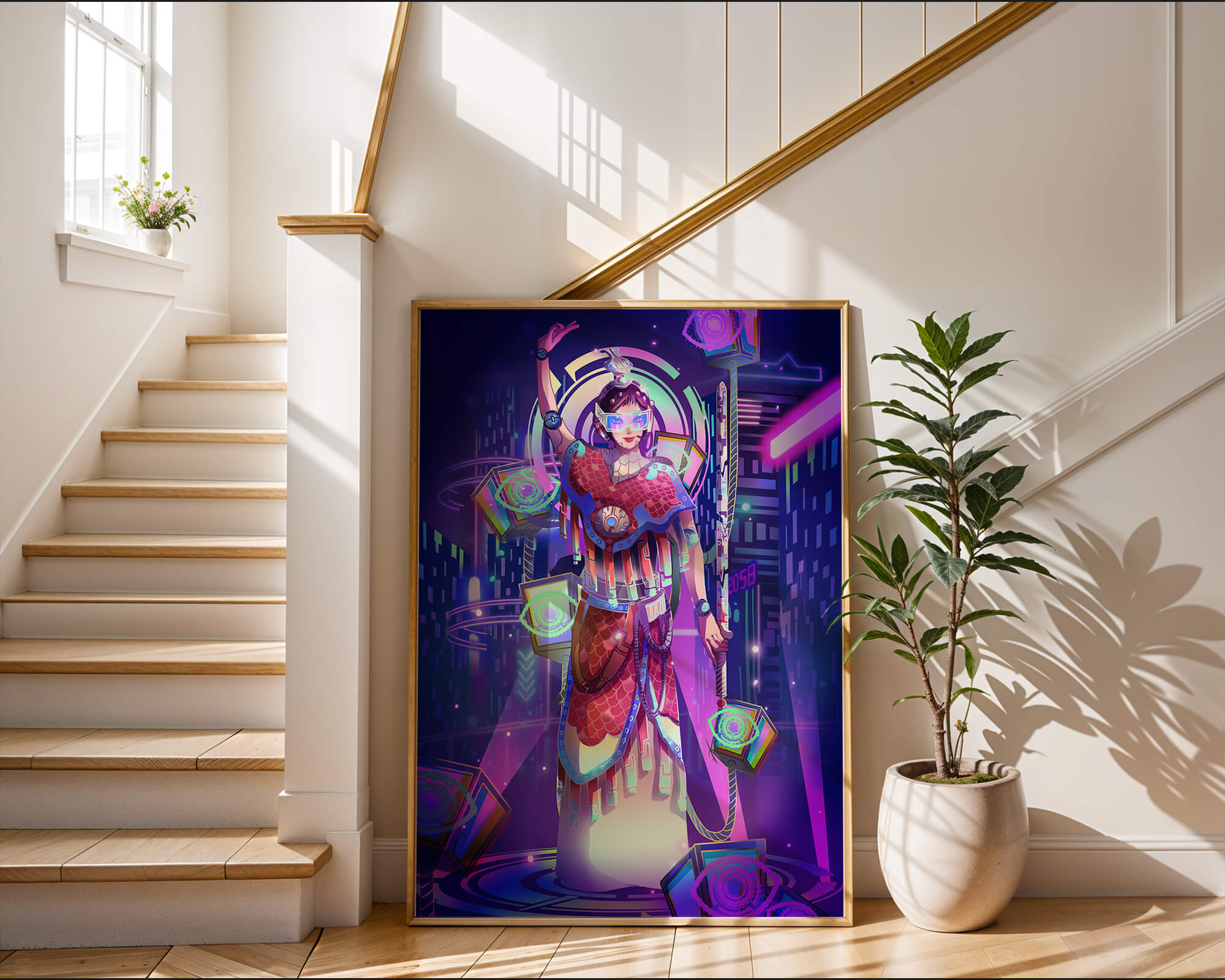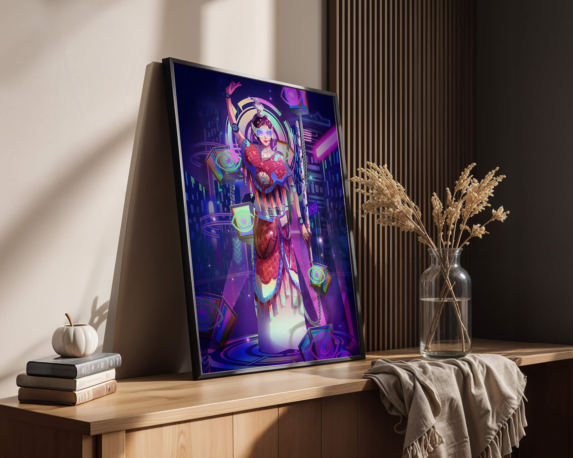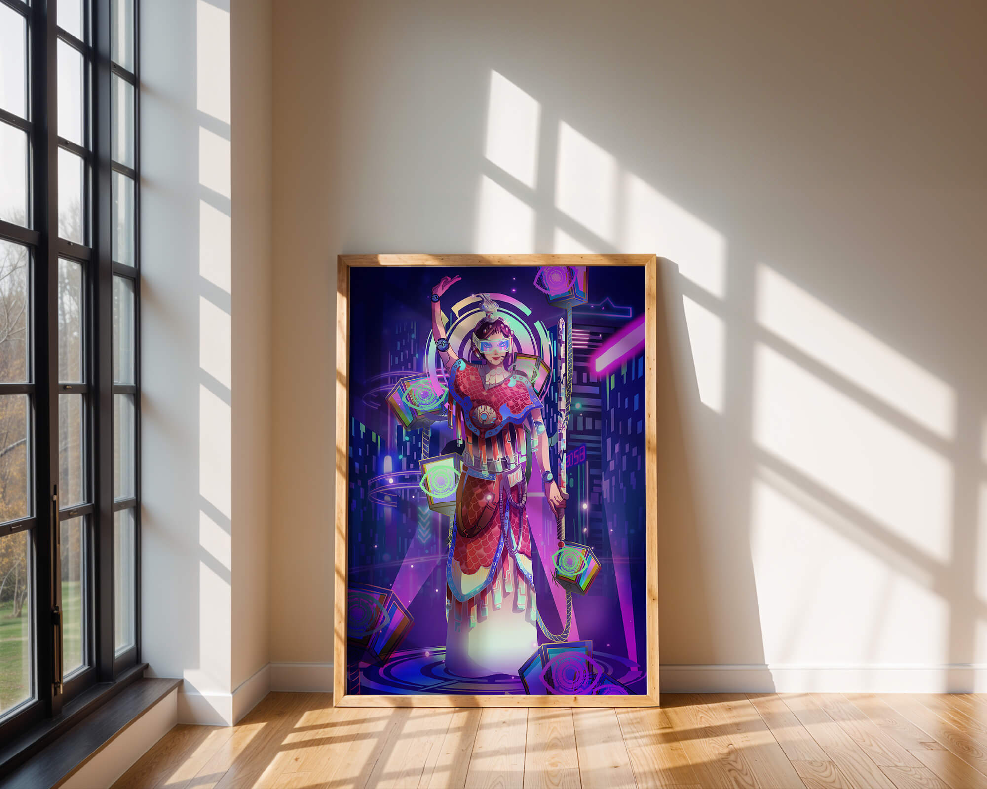 Esta obra de arte captura la esencia de un entorno ciberpunk, presentando una figura poderosa con armadura elaborada. El guerrero está adornado con accesorios luminosos y empuña un arma que emana energía. Alrededor del personaje hay cubos flotantes y patrones digitales que añaden una cualidad surrealista a la escena. El fondo es un vasto paisaje urbano, iluminado por innumerables luces de neón. Los tonos de púrpura, azul y rosa dominan la paleta, realzando el ambiente extraterrestre. Esta imagen combina bellamente elementos de la realidad virtual y la moda futurista, convirtiéndola en una representación cautivadora del arte digital.| Tipo |