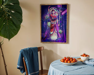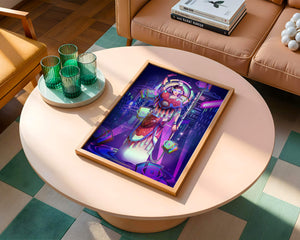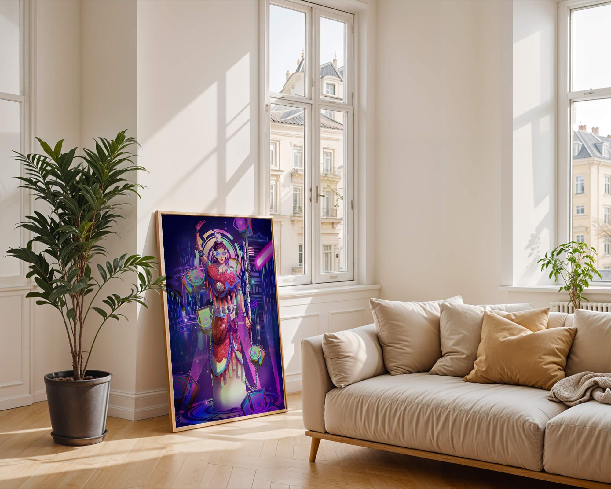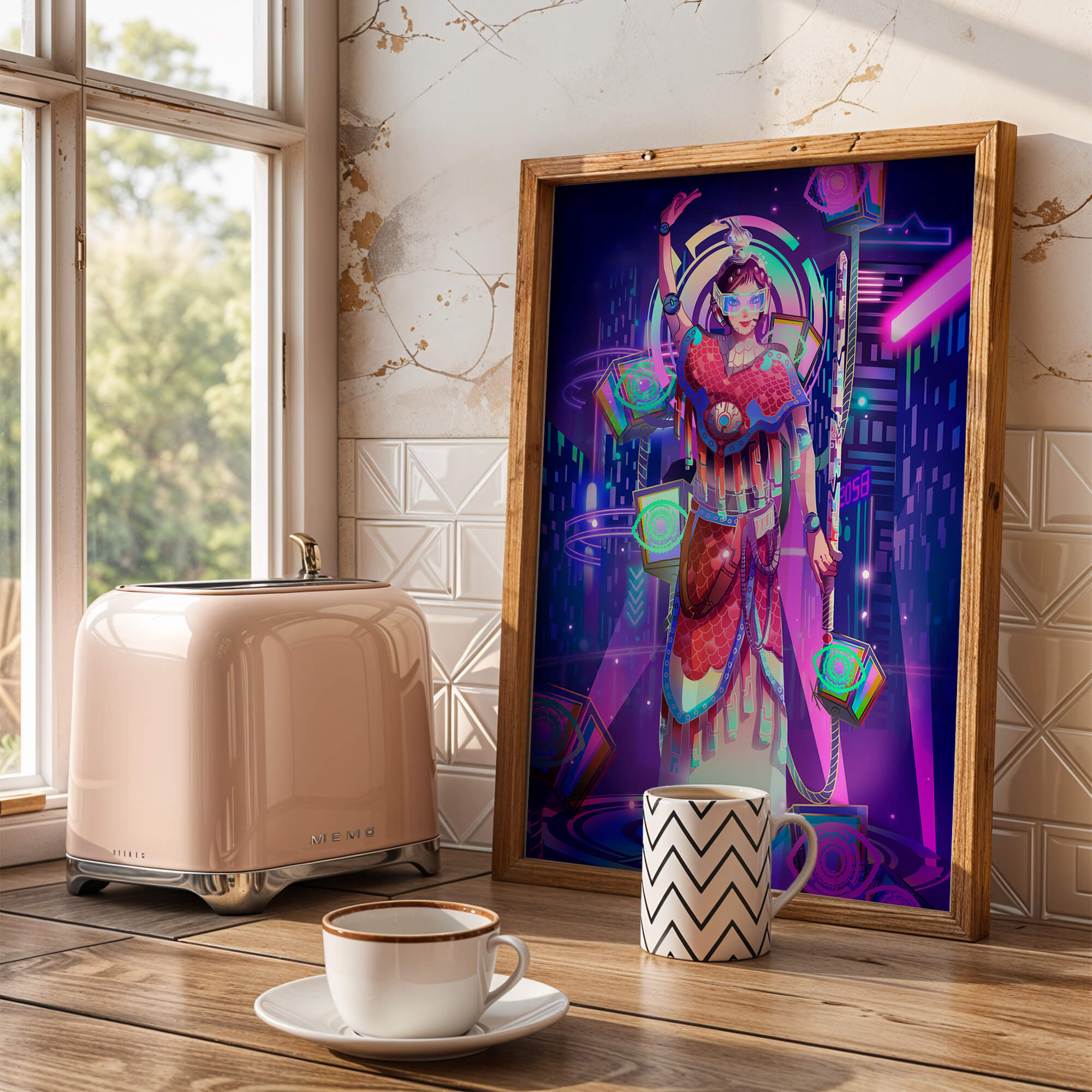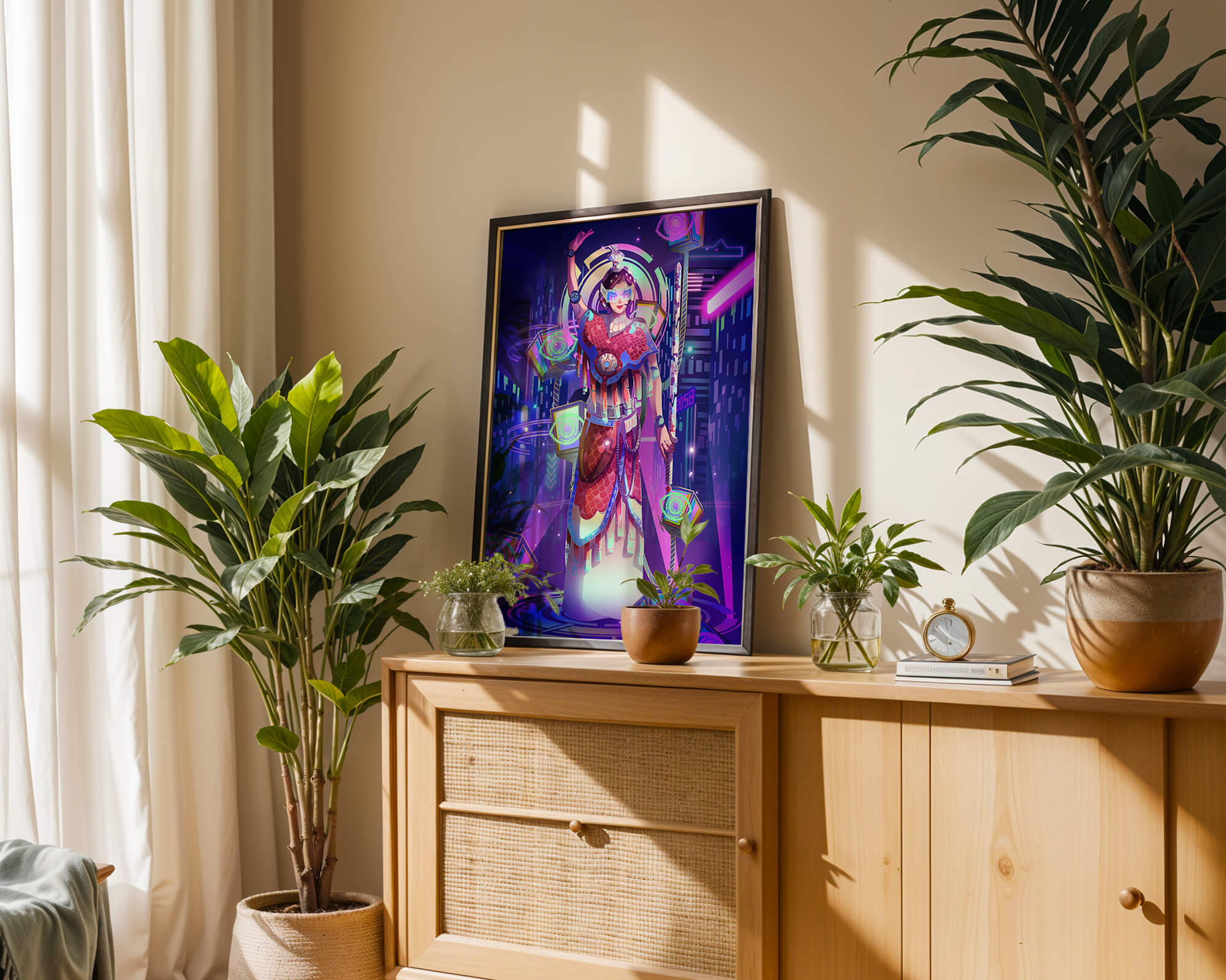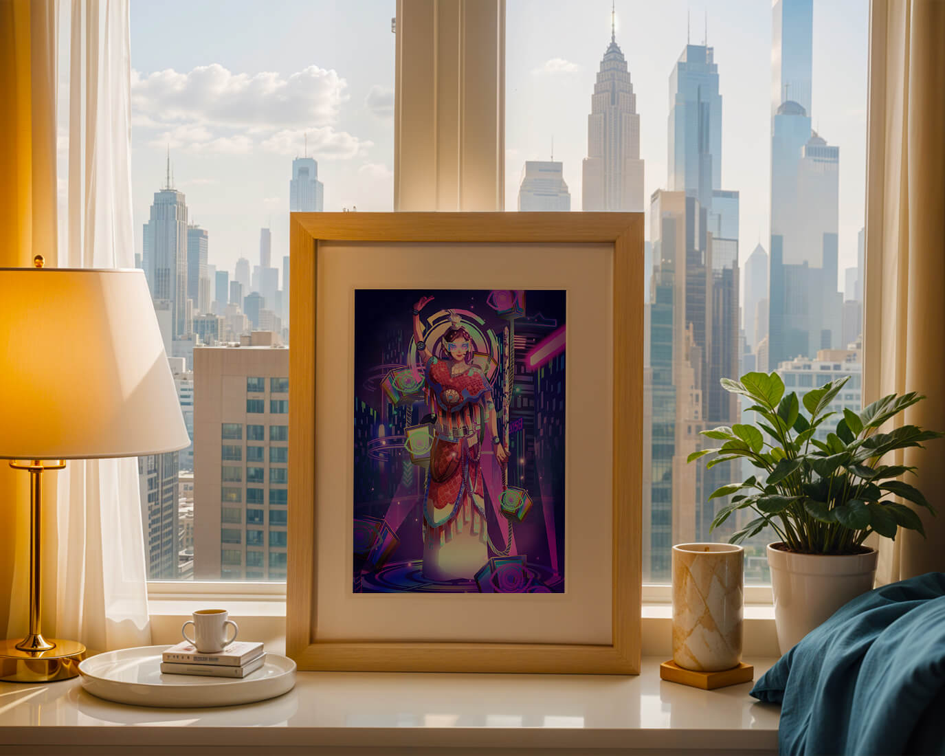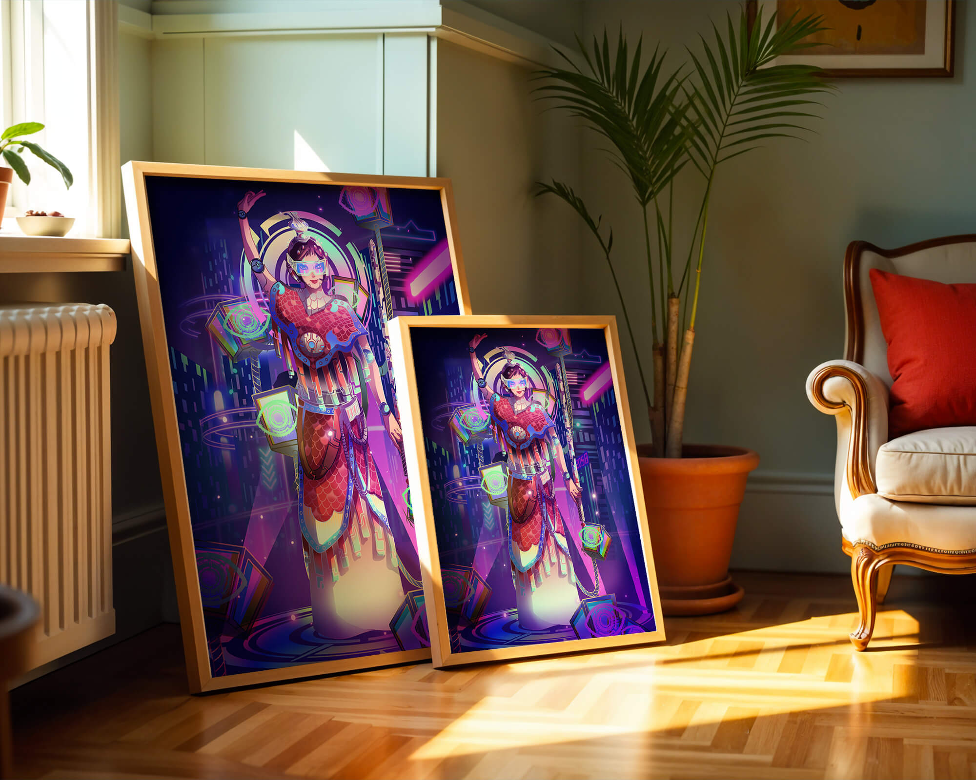 Esta obra de arte captura la esencia de un entorno ciberpunk, presentando una figura poderosa con armadura elaborada. El guerrero está adornado con accesorios luminosos y empuña un arma que emana energía. Alrededor del personaje hay cubos flotantes y patrones digitales que añaden una cualidad surrealista a la escena. El fondo es un vasto paisaje urbano, iluminado por innumerables luces de neón. Los tonos de púrpura, azul y rosa dominan la paleta, realzando el ambiente extraterrestre. Esta imagen combina bellamente elementos de la realidad virtual y la moda futurista, convirtiéndola en una representación cautivadora del arte digital.| Tipo |