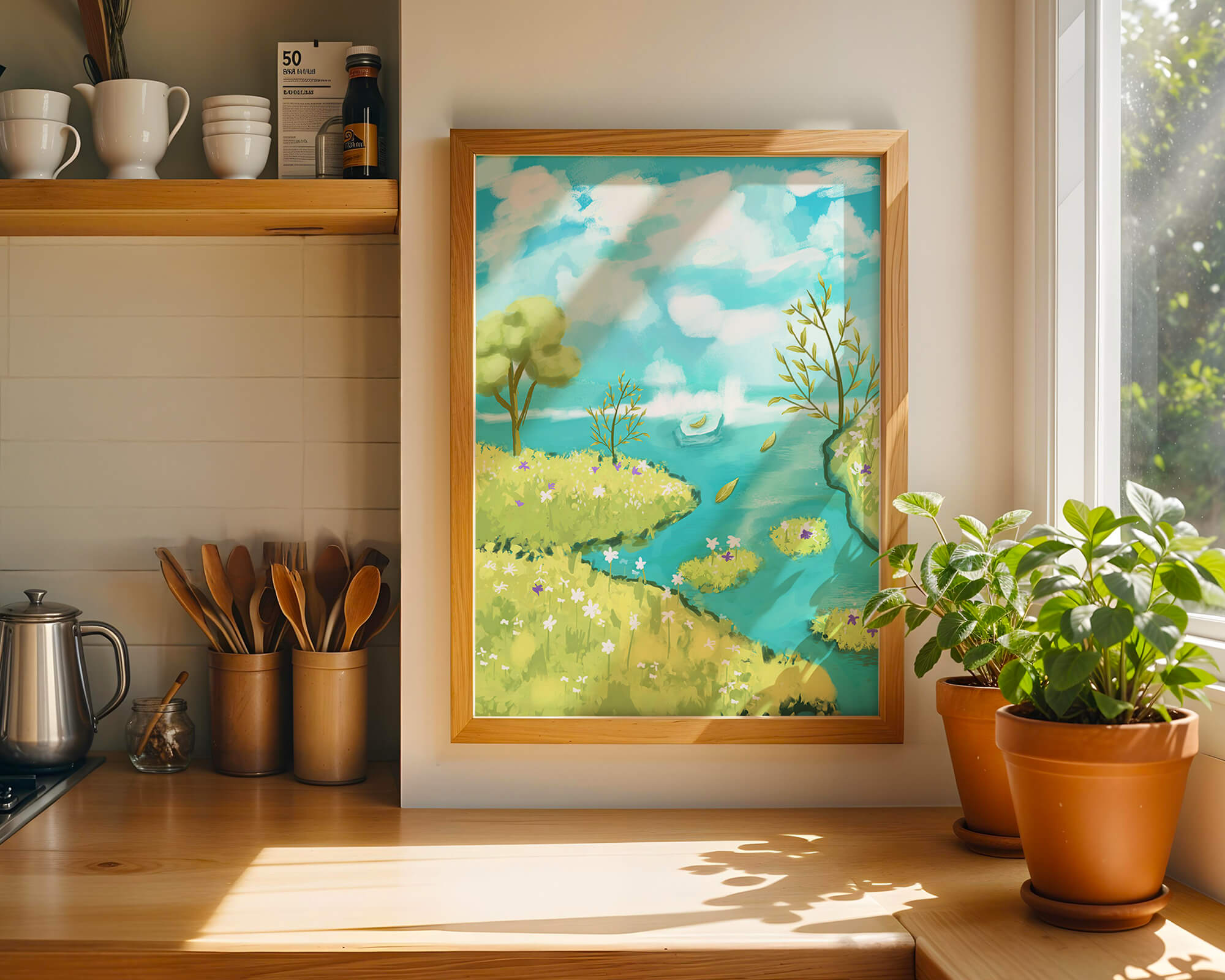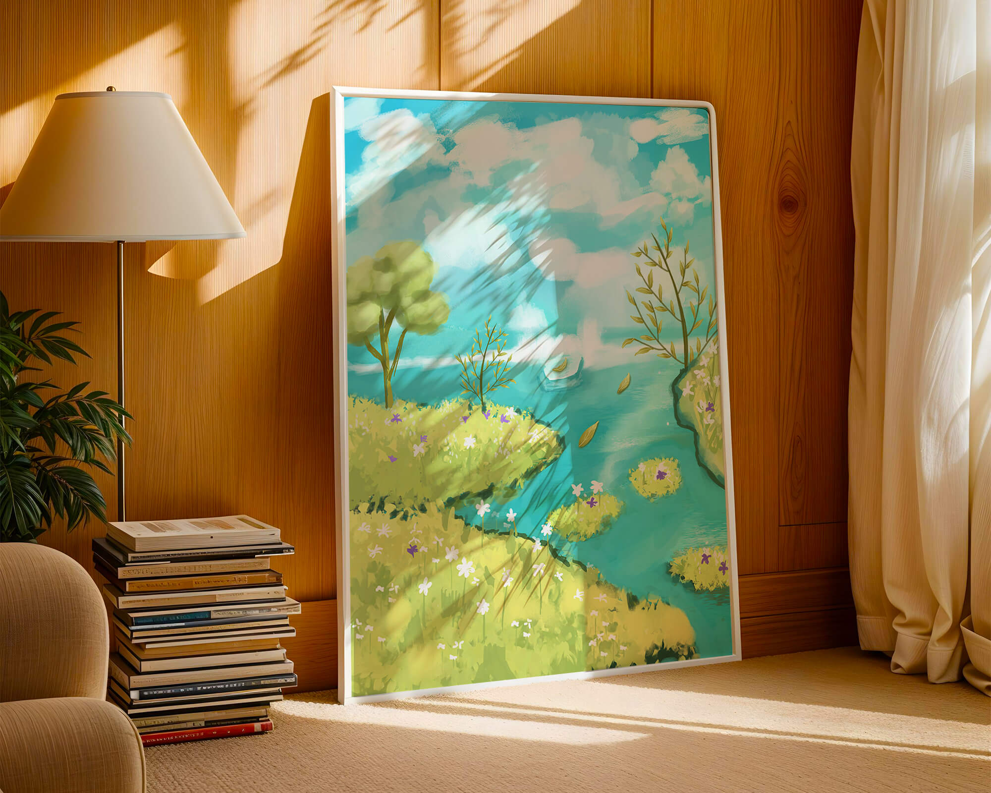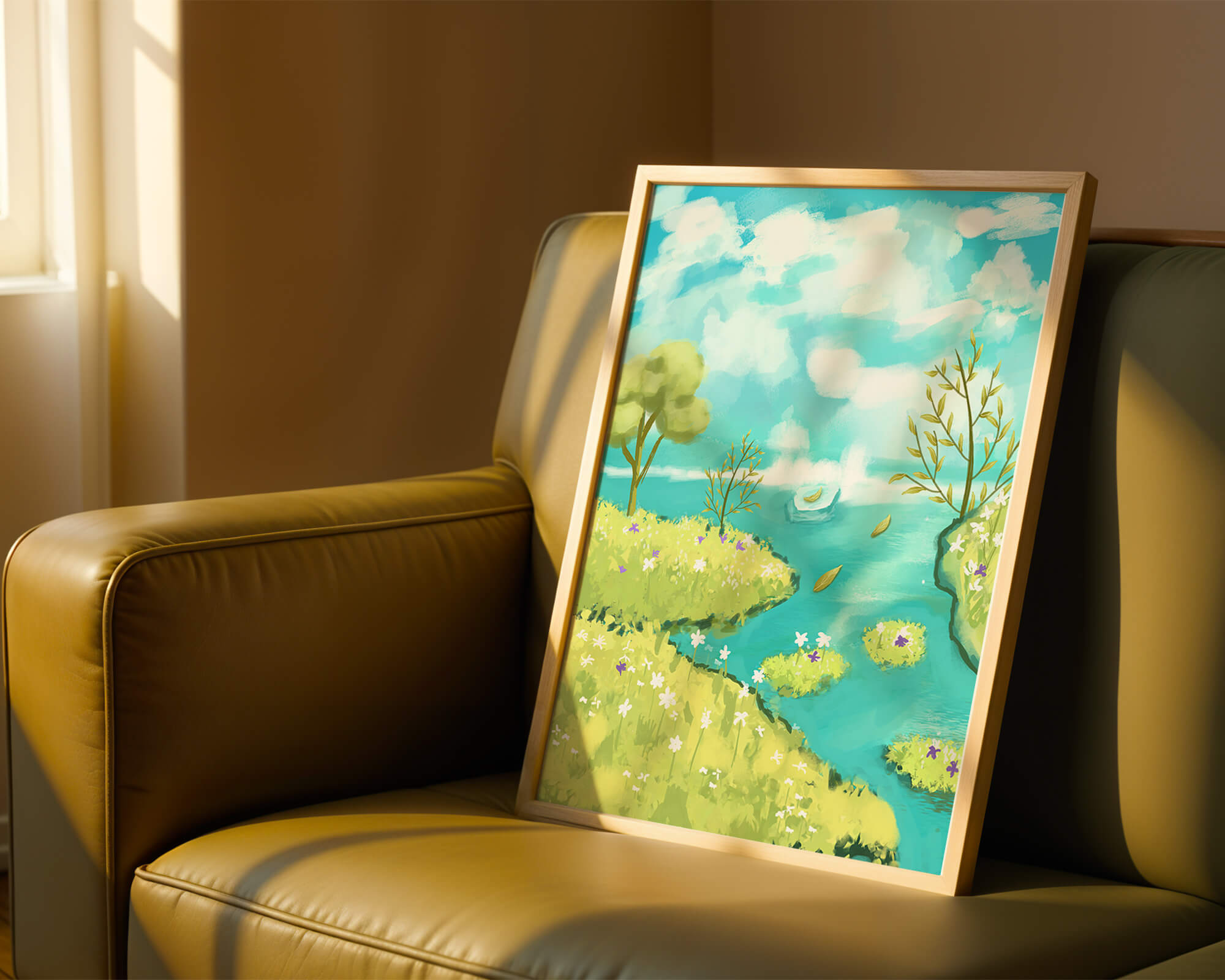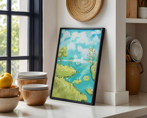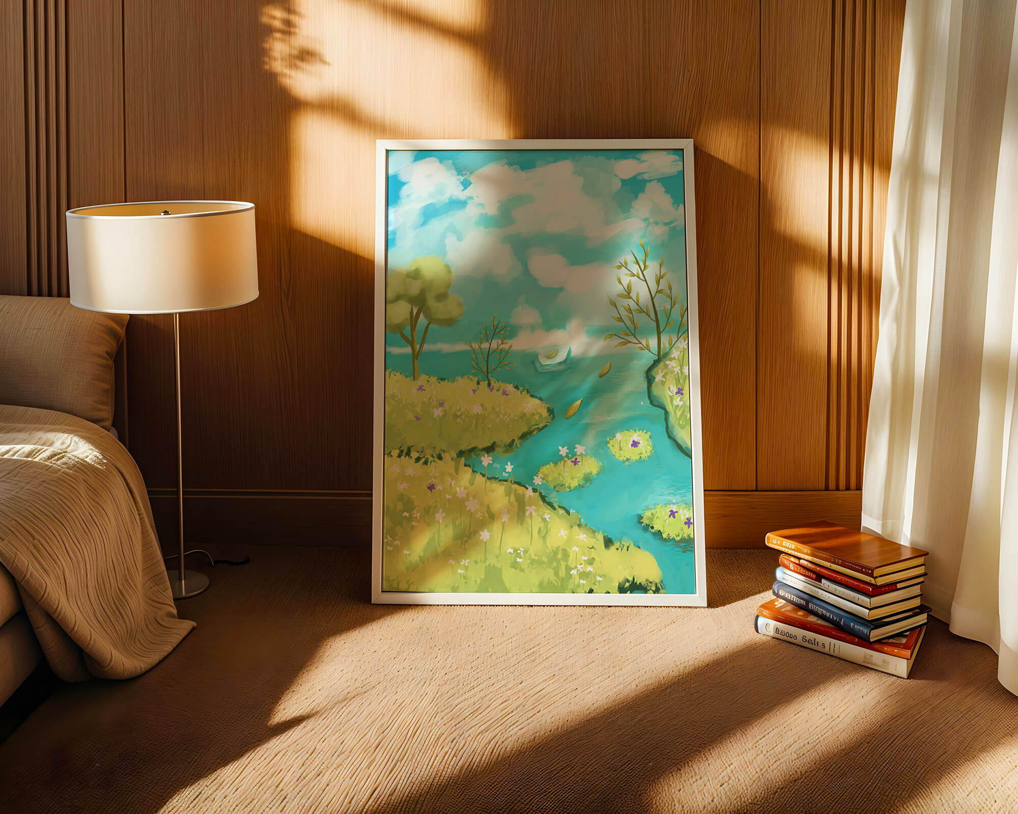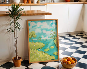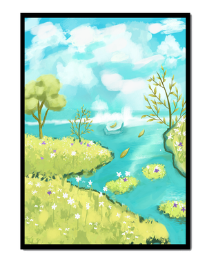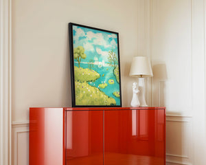 This landscape presents a harmonious blend of natures finest elements. The meadows vibrant greenery contrasts beautifully with the azure river, creating a visual feast for the eyes. Trees with delicate branches frame the image, guiding the viewers gaze towards the calm, flowing water and enhancing the serenity of the setting. The combination of soft, scattered clouds against a clear blue sky further elevates the peacefulness of this idyllic scene. Its a perfect representation of the quiet beauty found in untouched natural landscapes, making it a calming visual escape for any observer.| Tipo |
