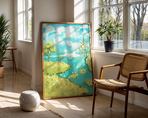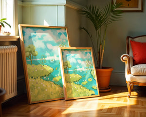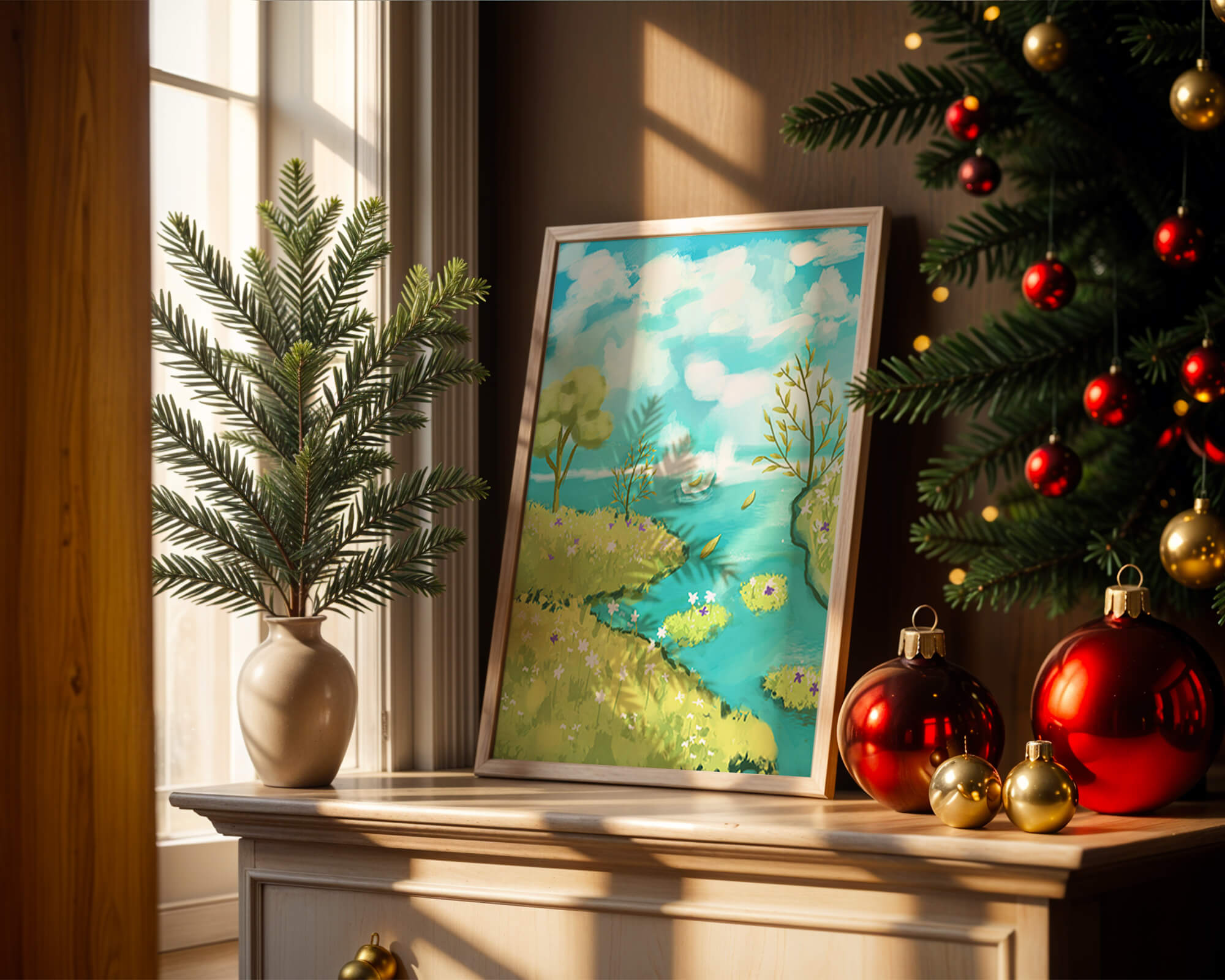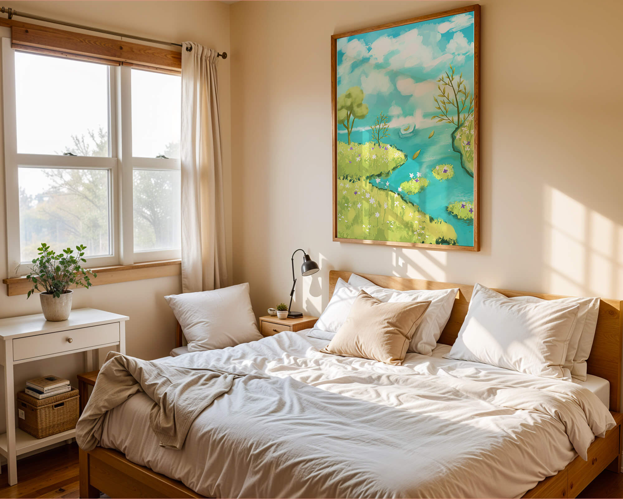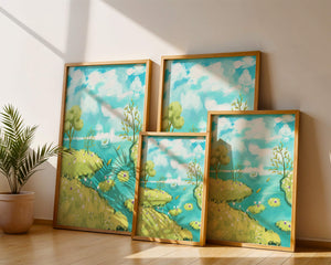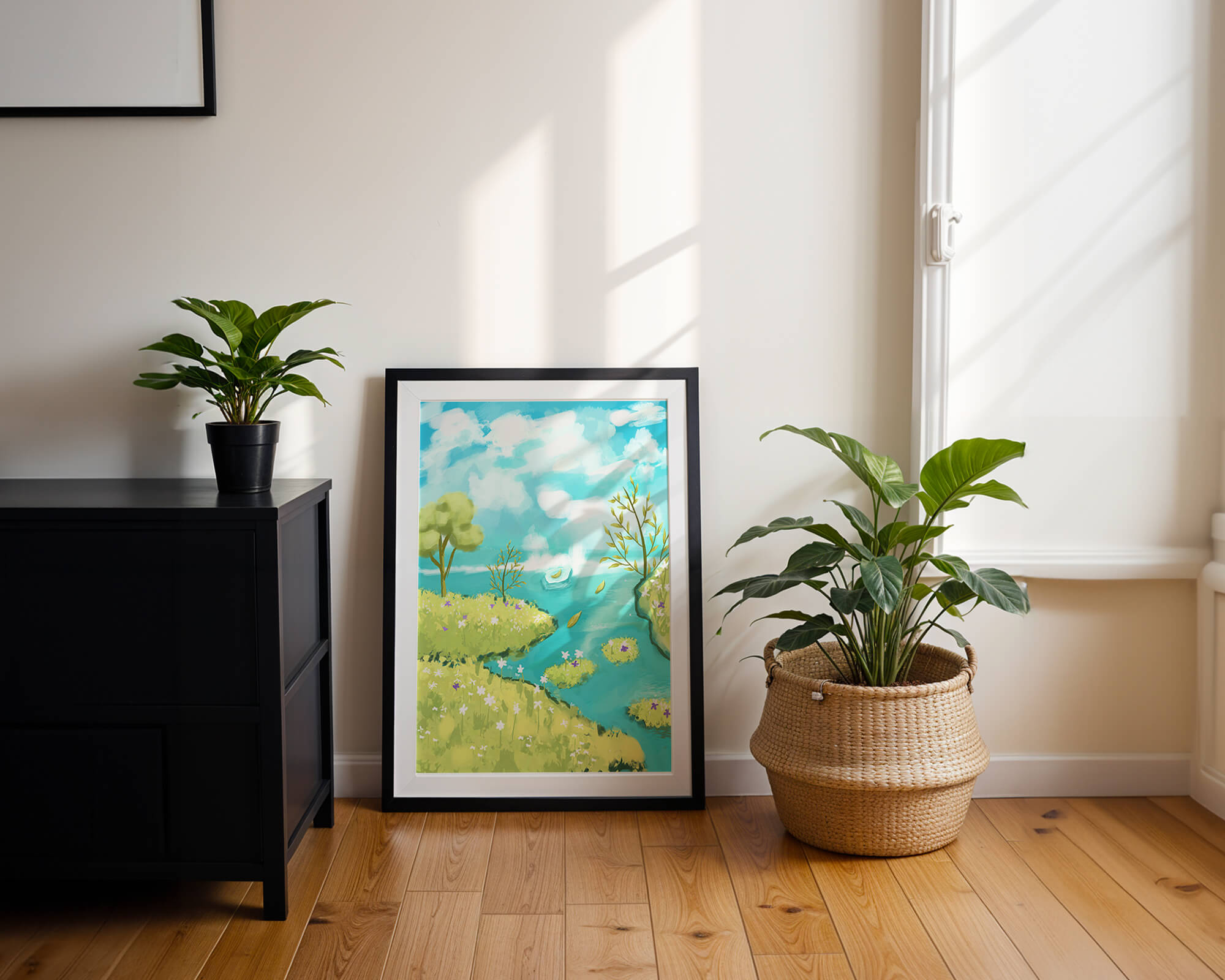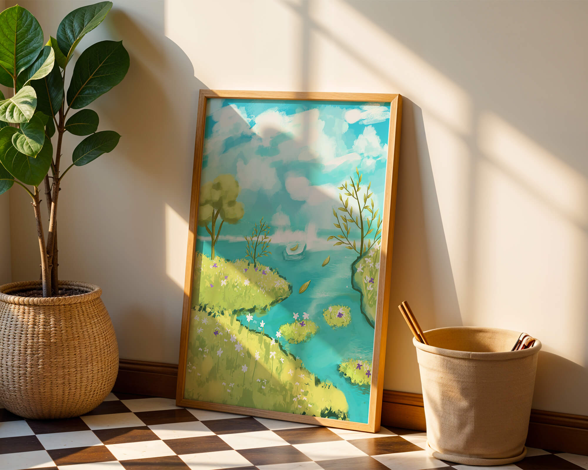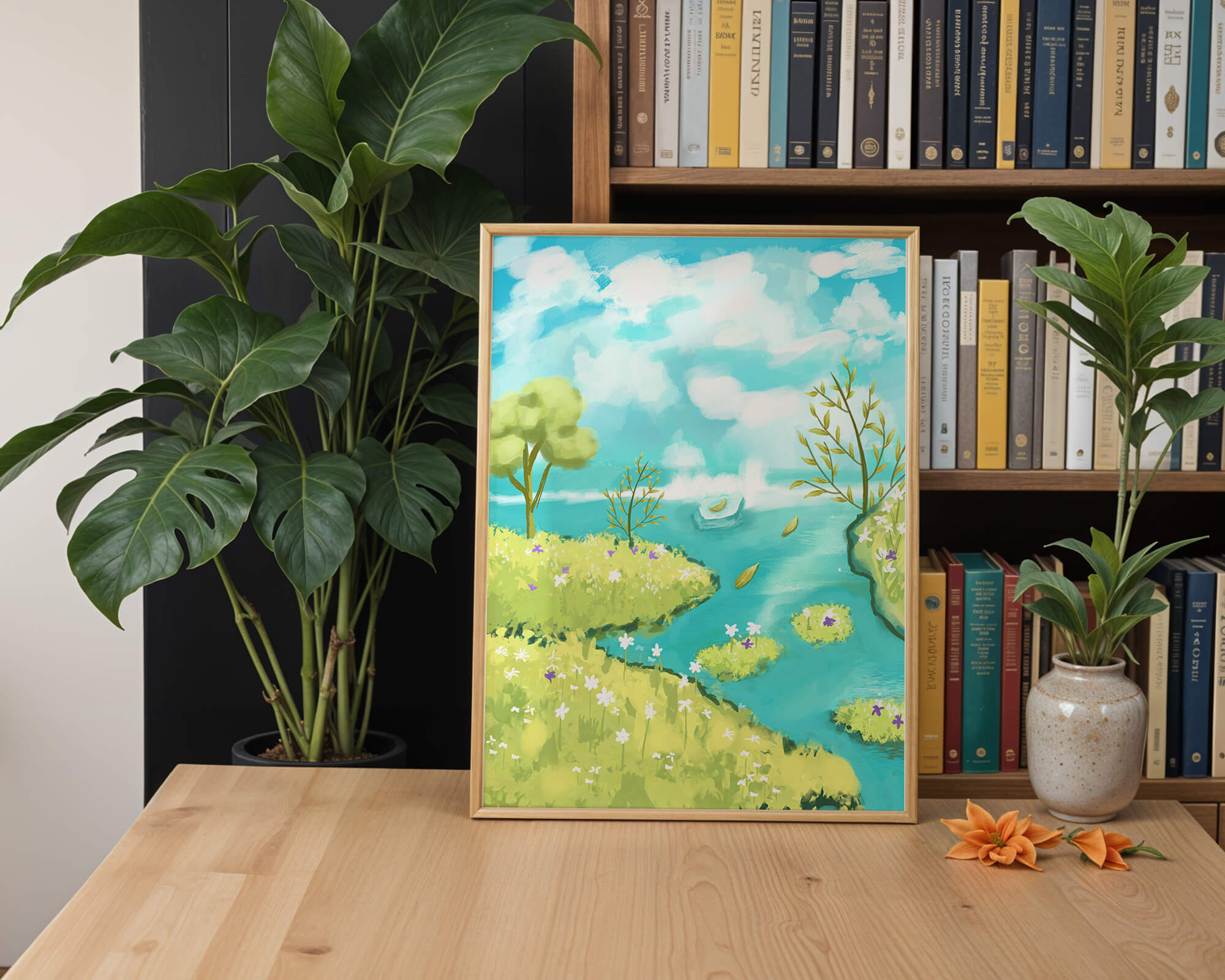 This landscape presents a harmonious blend of natures finest elements. The meadows vibrant greenery contrasts beautifully with the azure river, creating a visual feast for the eyes. Trees with delicate branches frame the image, guiding the viewers gaze towards the calm, flowing water and enhancing the serenity of the setting. The combination of soft, scattered clouds against a clear blue sky further elevates the peacefulness of this idyllic scene. Its a perfect representation of the quiet beauty found in untouched natural landscapes, making it a calming visual escape for any observer.| Tipo |