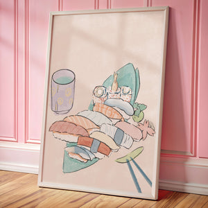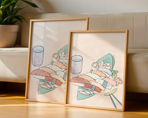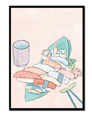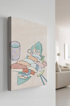 Esta imagen muestra un hermoso plato de sushi ilustrado, que incluye una variedad de tipos de sushi junto con una bebida complementaria. La obra utiliza colores pasteles suaves para evocar una sensación de deleite culinario y expresión artística.