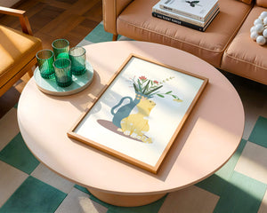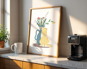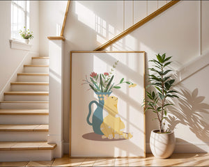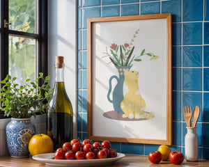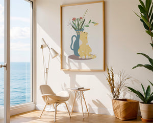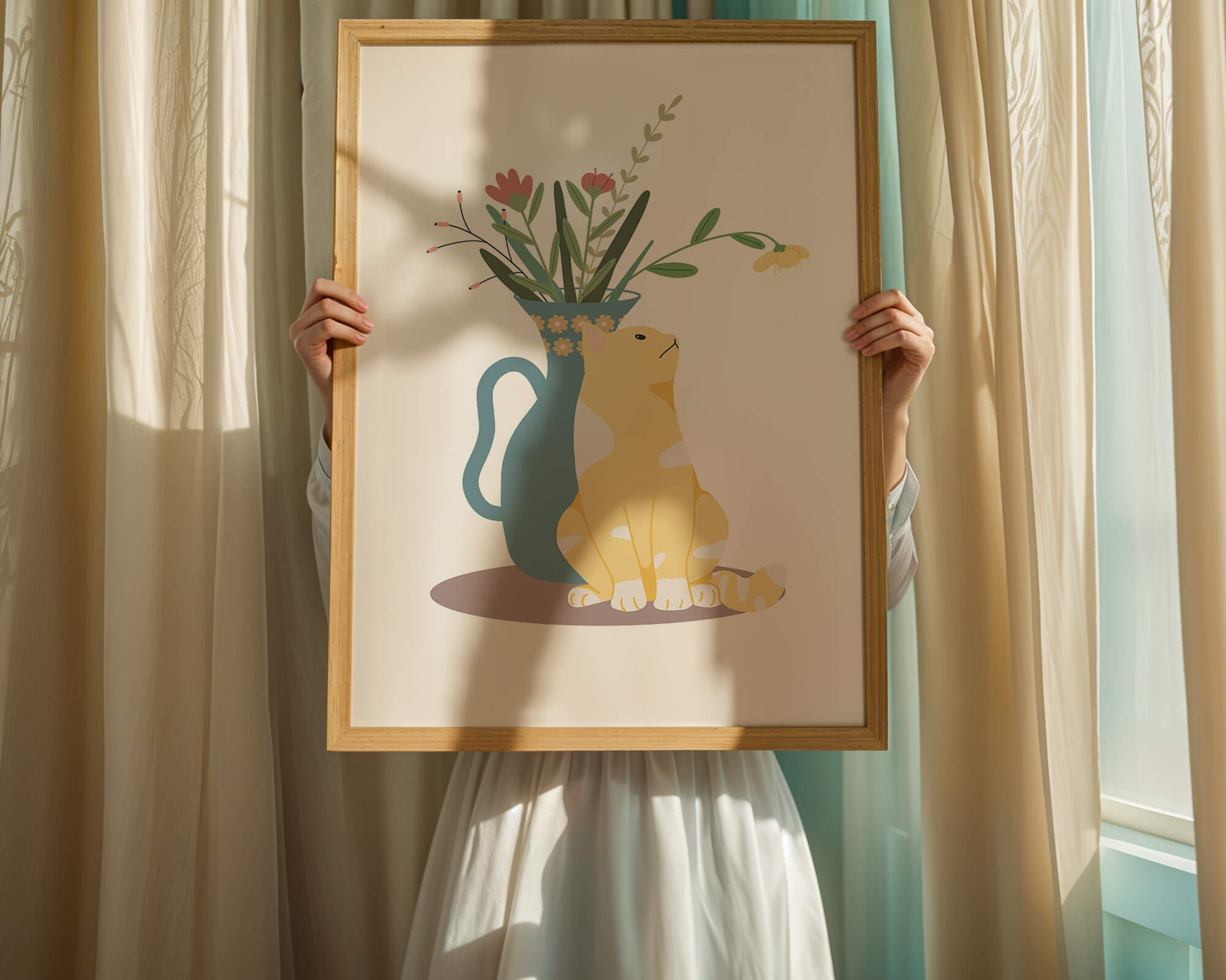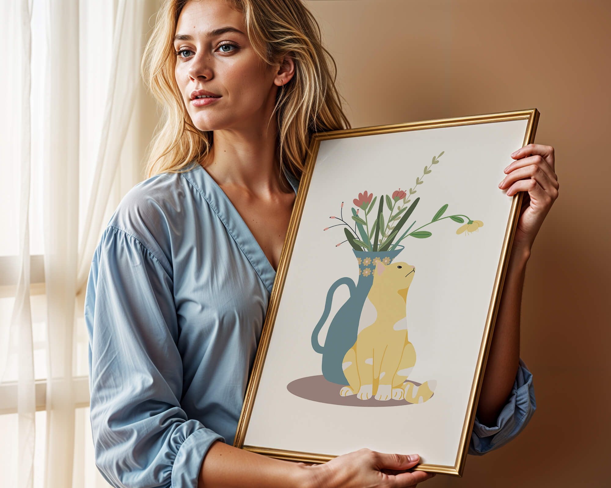 El jarrón, de un impresionante tono azul, está adornado con delicados patrones florales que complementan su contenido. Su asa curva y cuello alargado le dan una apariencia moderna y artística. Del jarrón emerge un vibrante ramo con varias flores en tonos de rosa, púrpura y verde, trayendo un toque de naturaleza al interior. Junto al jarrón, el gato se sienta atentamente, su pelaje marcado con suaves manchas blancas. La curiosa mirada del felino está dirigida hacia las flores, añadiendo un elemento juguetón a la escena. Esta representación artística captura la esencia de la tranquilidad y la belleza natural, convirtiéndola en una pieza decorativa ideal para cualquier entorno hogareño. Ya sea colocada en una sala de estar o en un estudio, esta ilustración seguramente mejorará el ambiente con su presencia alegre y armoniosa.| Tipo |