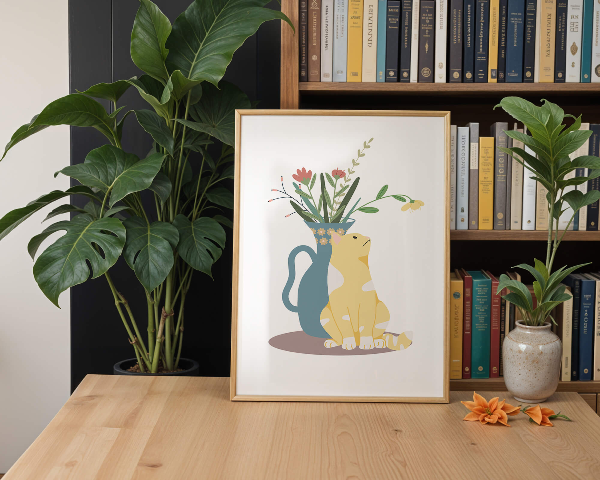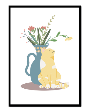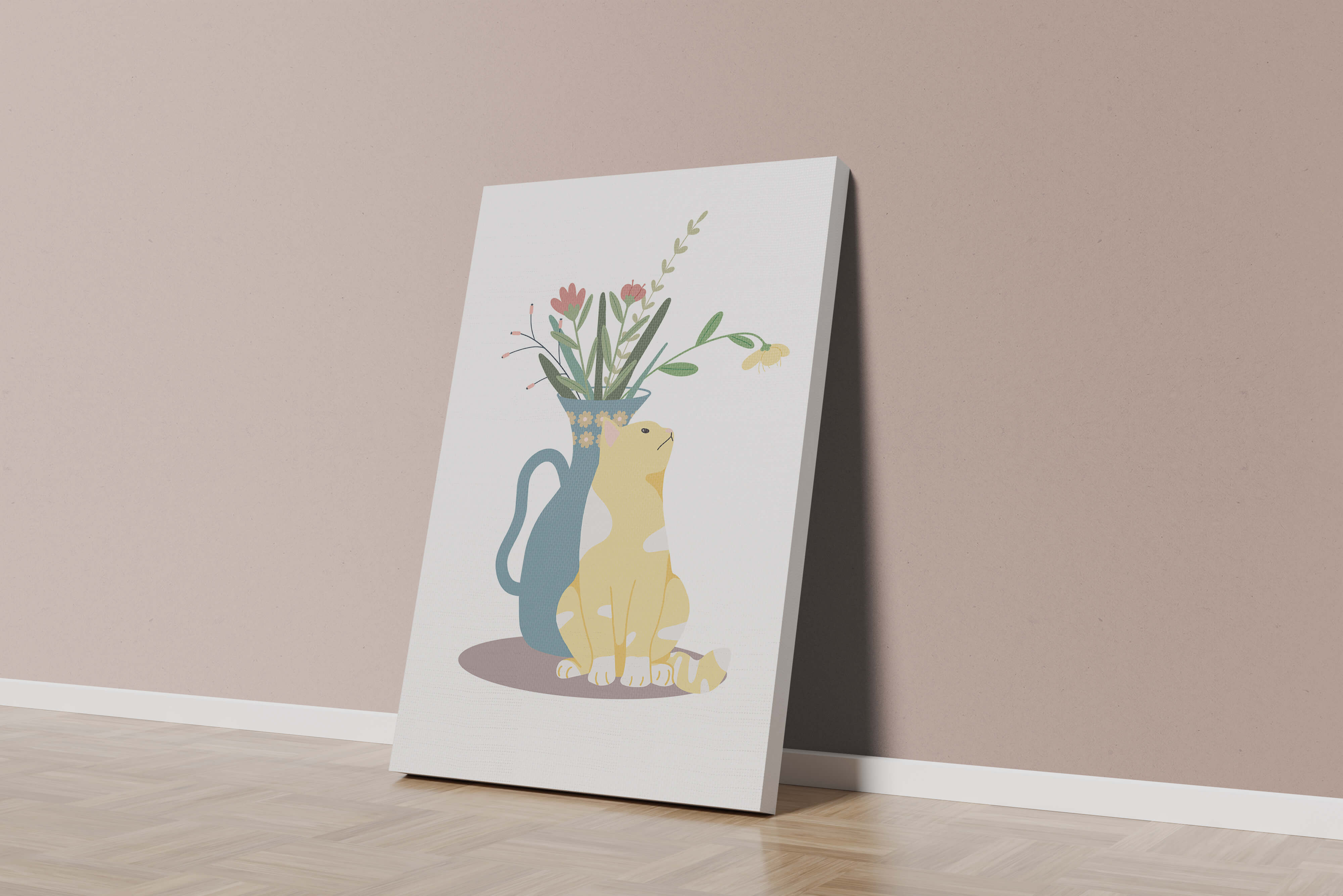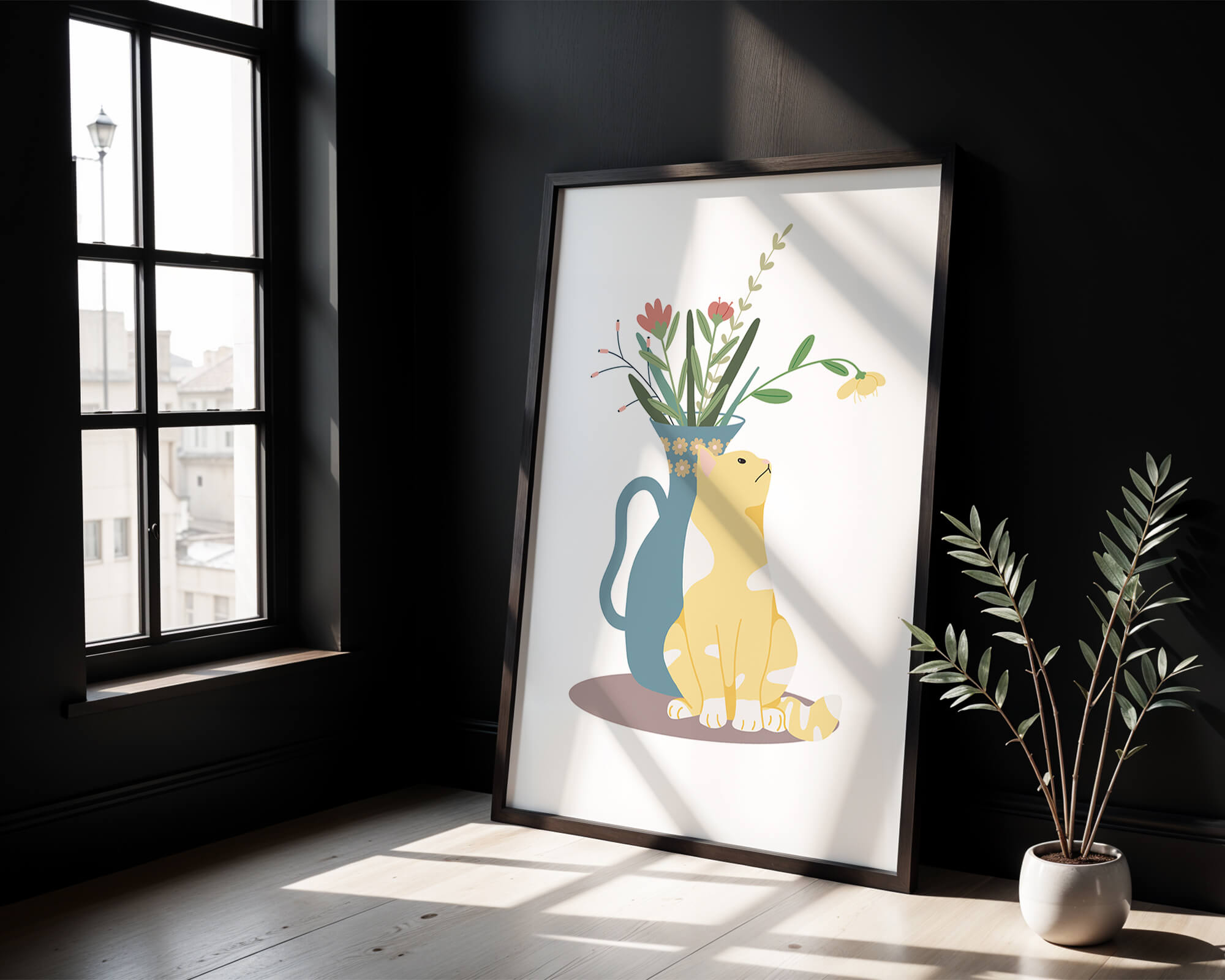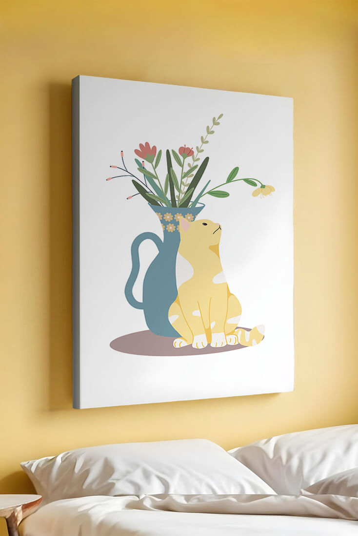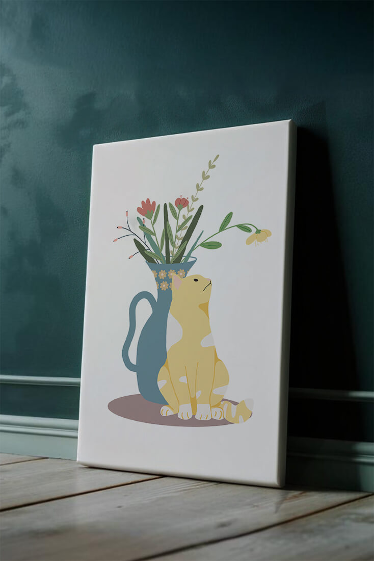 En esta encantadora ilustración, un gato amarillo se sienta graciosamente junto a un jarrón bellamente diseñado lleno de una variedad de flores coloridas. La composición, simple pero elegante, crea una atmósfera serena que es visualmente atractiva y calmante.