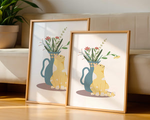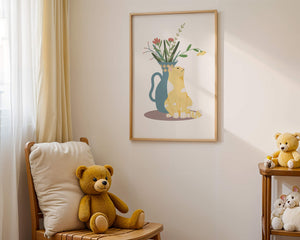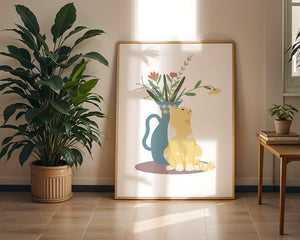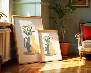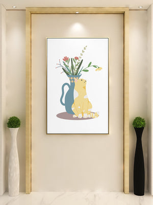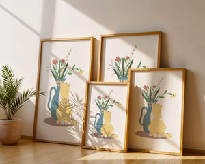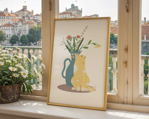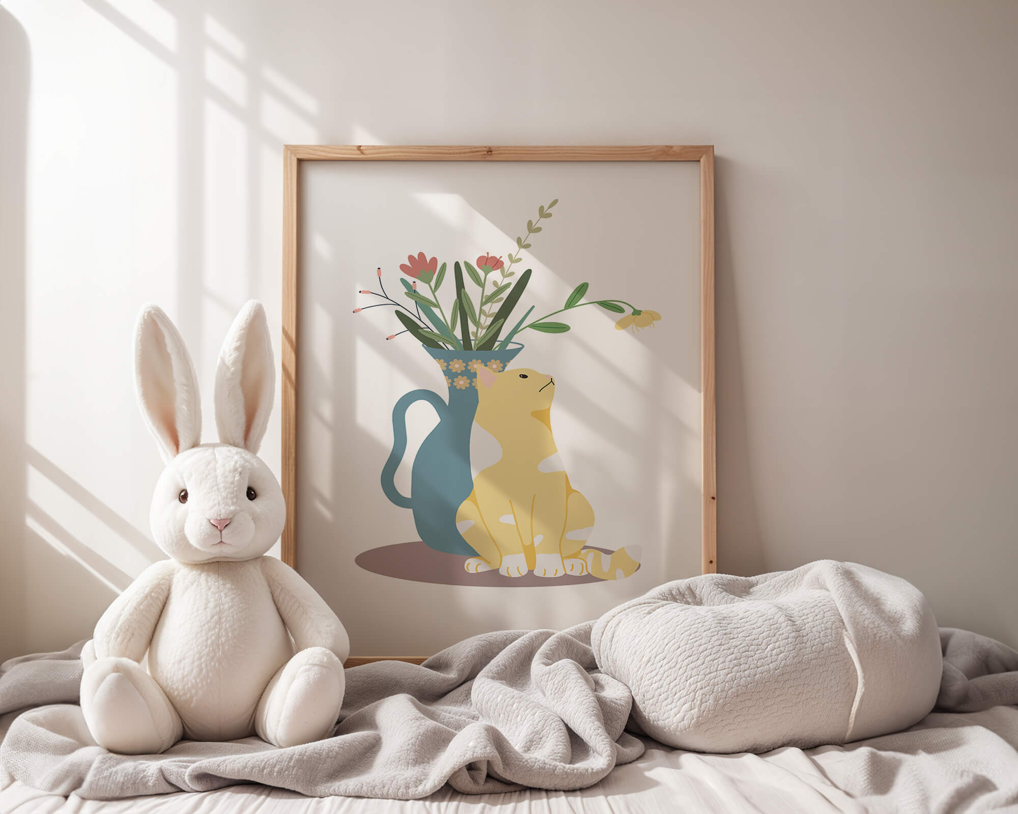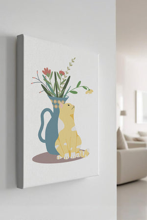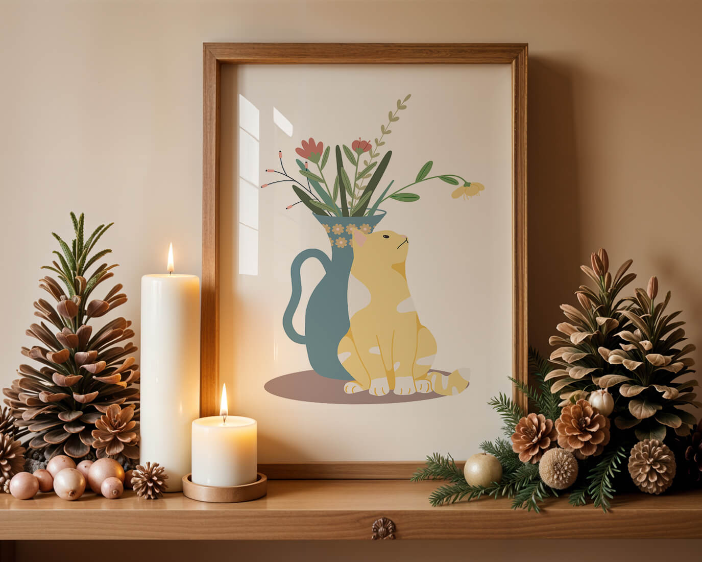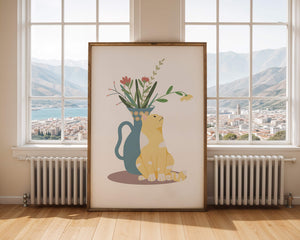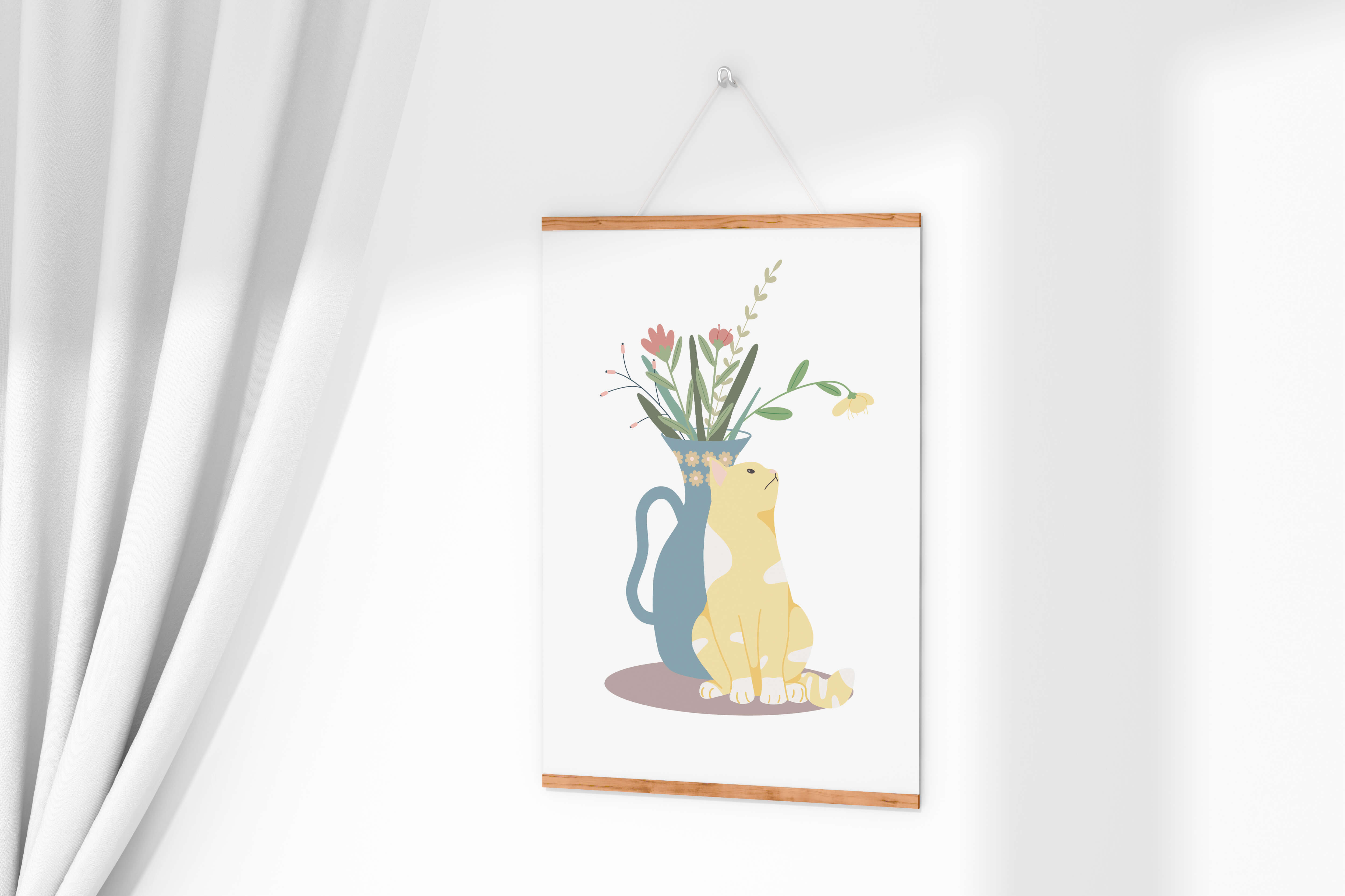 En esta encantadora ilustración, un gato amarillo se sienta graciosamente junto a un jarrón bellamente diseñado lleno de una variedad de flores coloridas. La composición, simple pero elegante, crea una atmósfera serena que es visualmente atractiva y calmante.