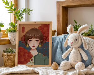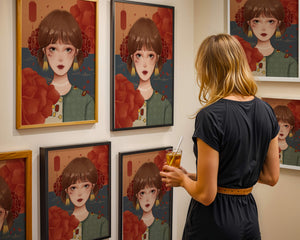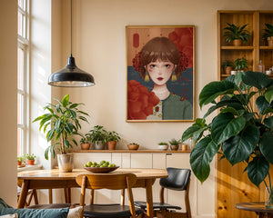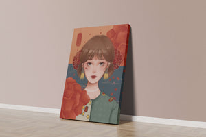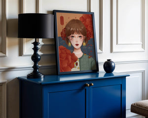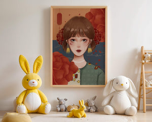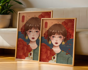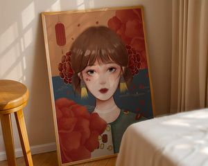 Esta cautivadora ilustración presenta a una joven rodeada de vívidos elementos florales, subrayando una combinación perfecta de estética tradicional y contemporánea.