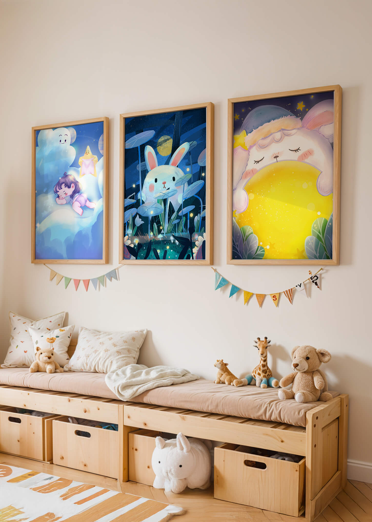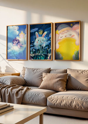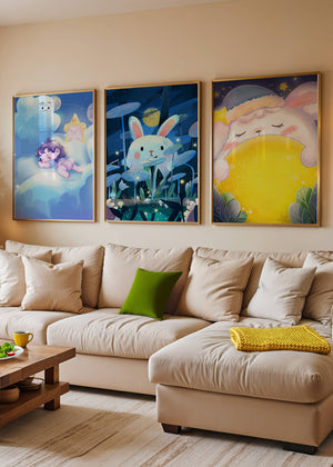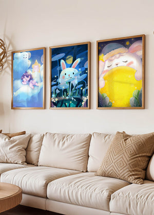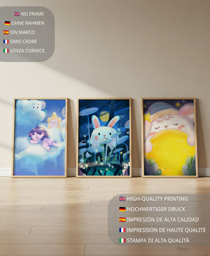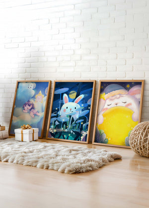 Las ilustraciones representan escenas llenas de ternura y fantasía que capturan la esencia de un mundo soñado por niños. El conejo y el niño parecen coexistir en un universo mágico, donde la luna y las estrellas sirven como telón de fondo, creando una atmósfera de tranquilidad y encanto. Estos diseños son ideales para decorar la habitación de los niños, aportando un toque de fantasía y color. Las ilustraciones capturan momentos de inocencia y sueños, perfectos para estimular la imaginación de los pequeños y proporcionarles un ambiente cálido y acogedor.| Tipo |