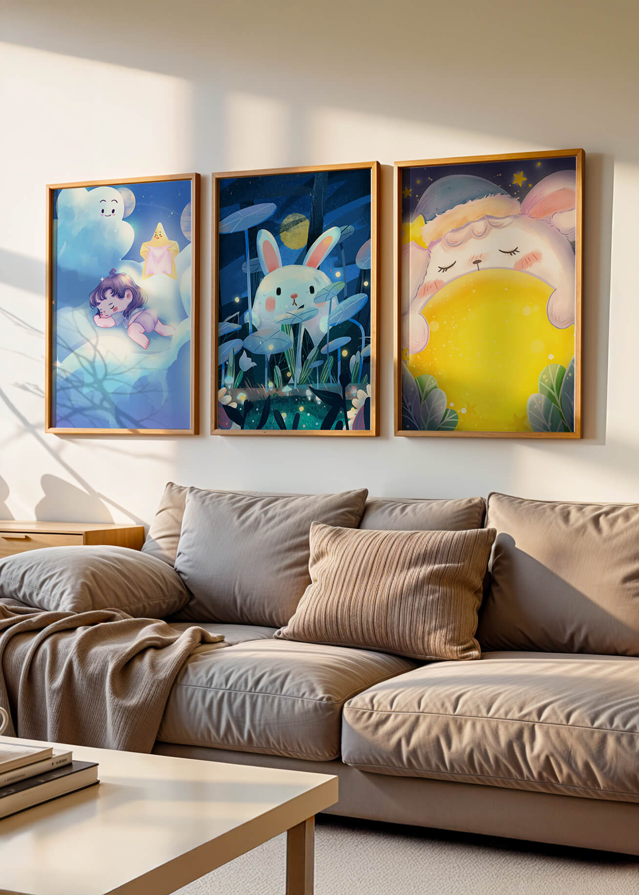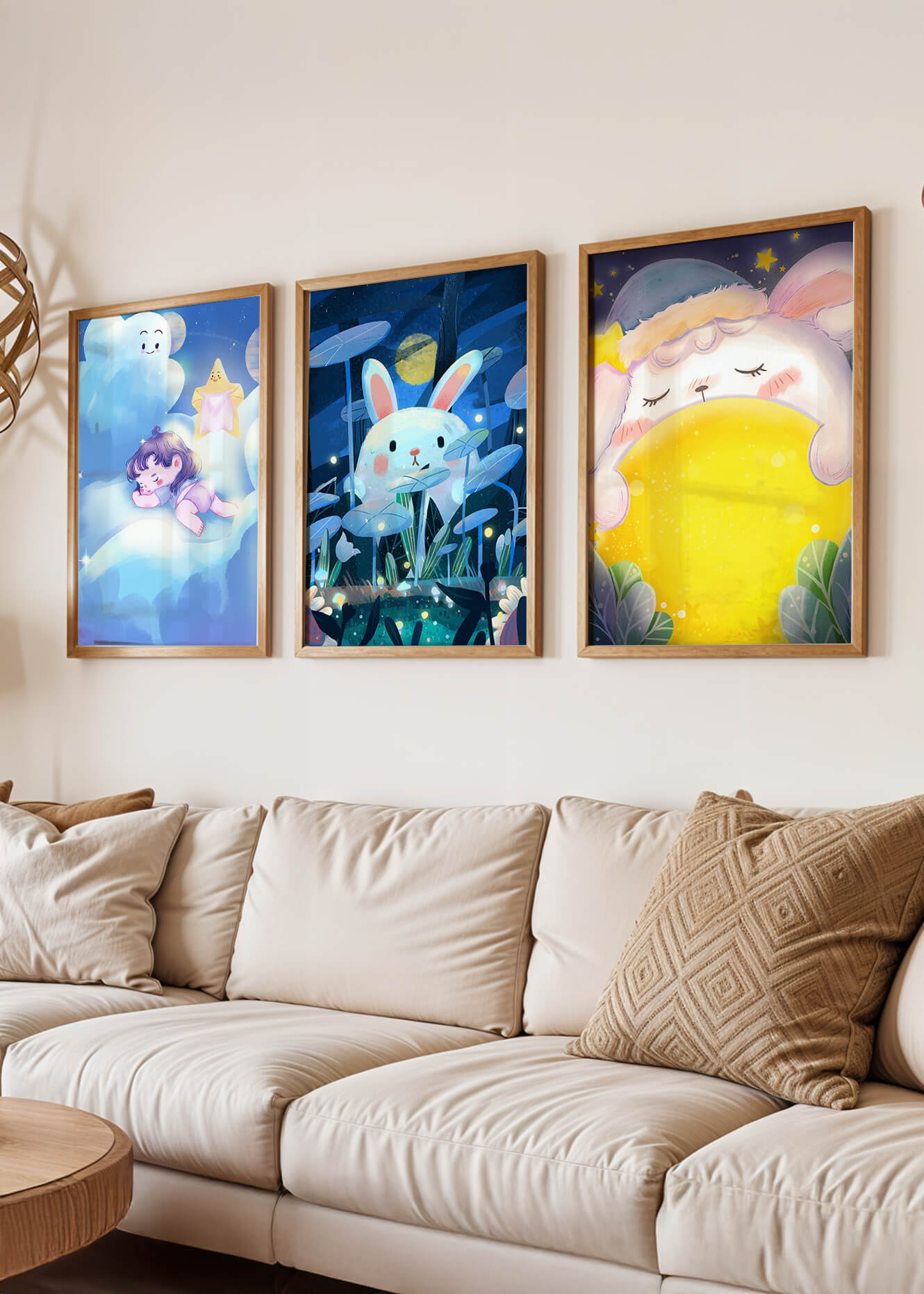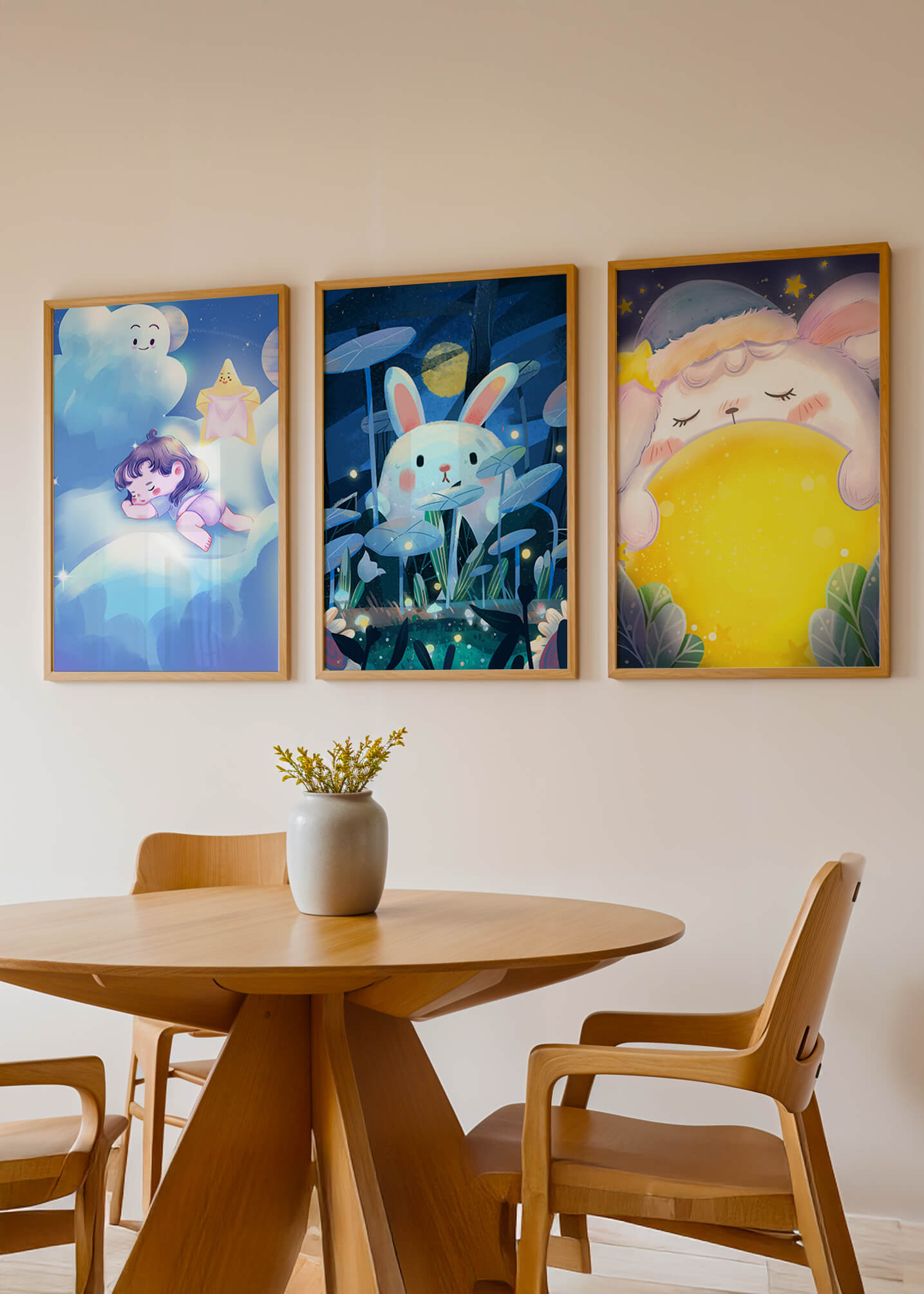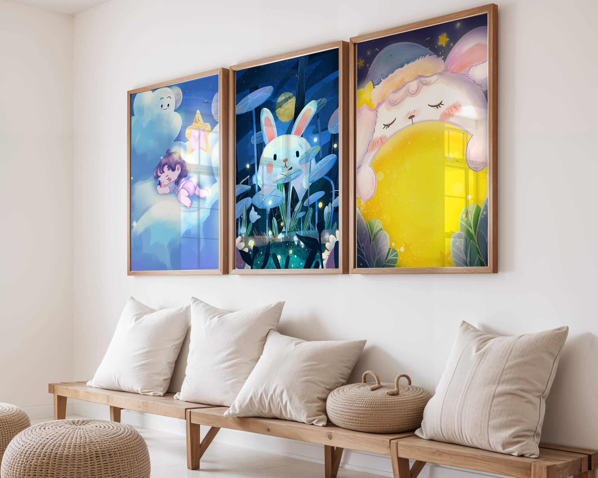 Esta composición artística presenta tres imágenes encantadoras con temática nocturna, donde un niño y un conejo destacan en un ambiente de ensueño.