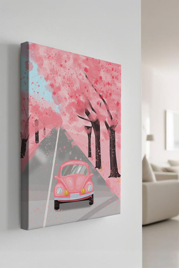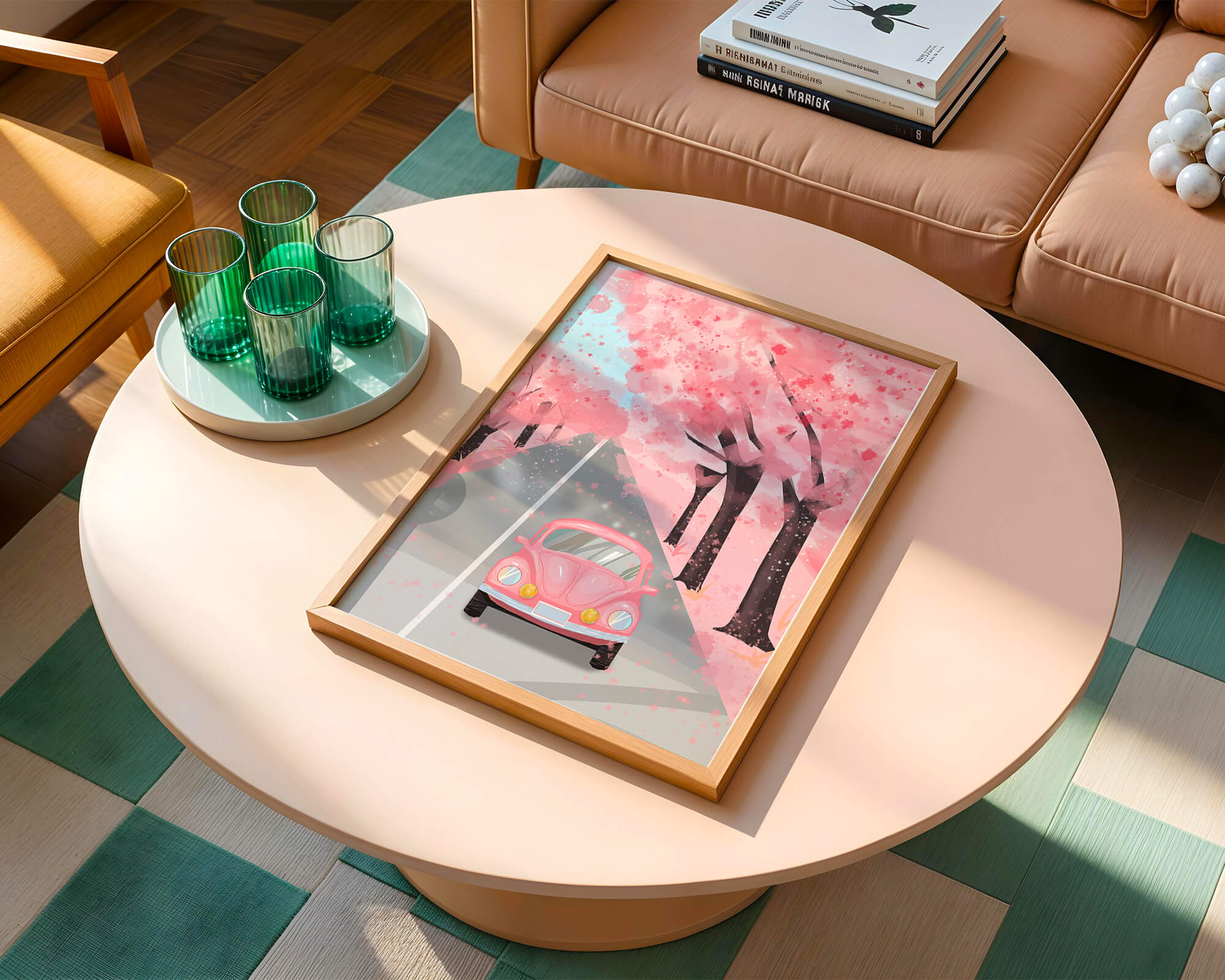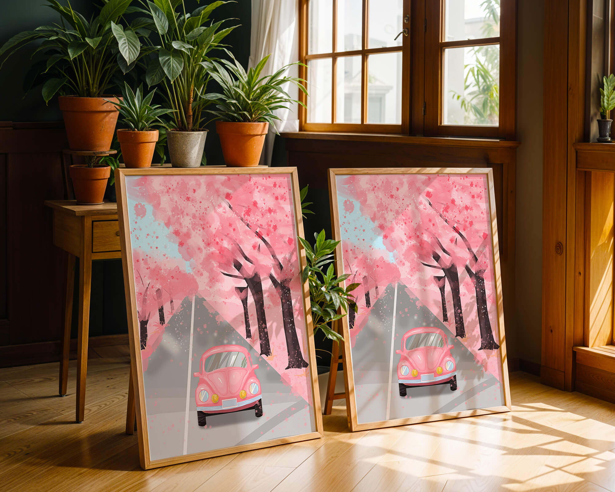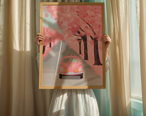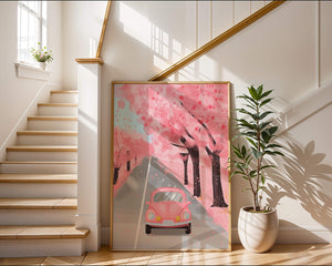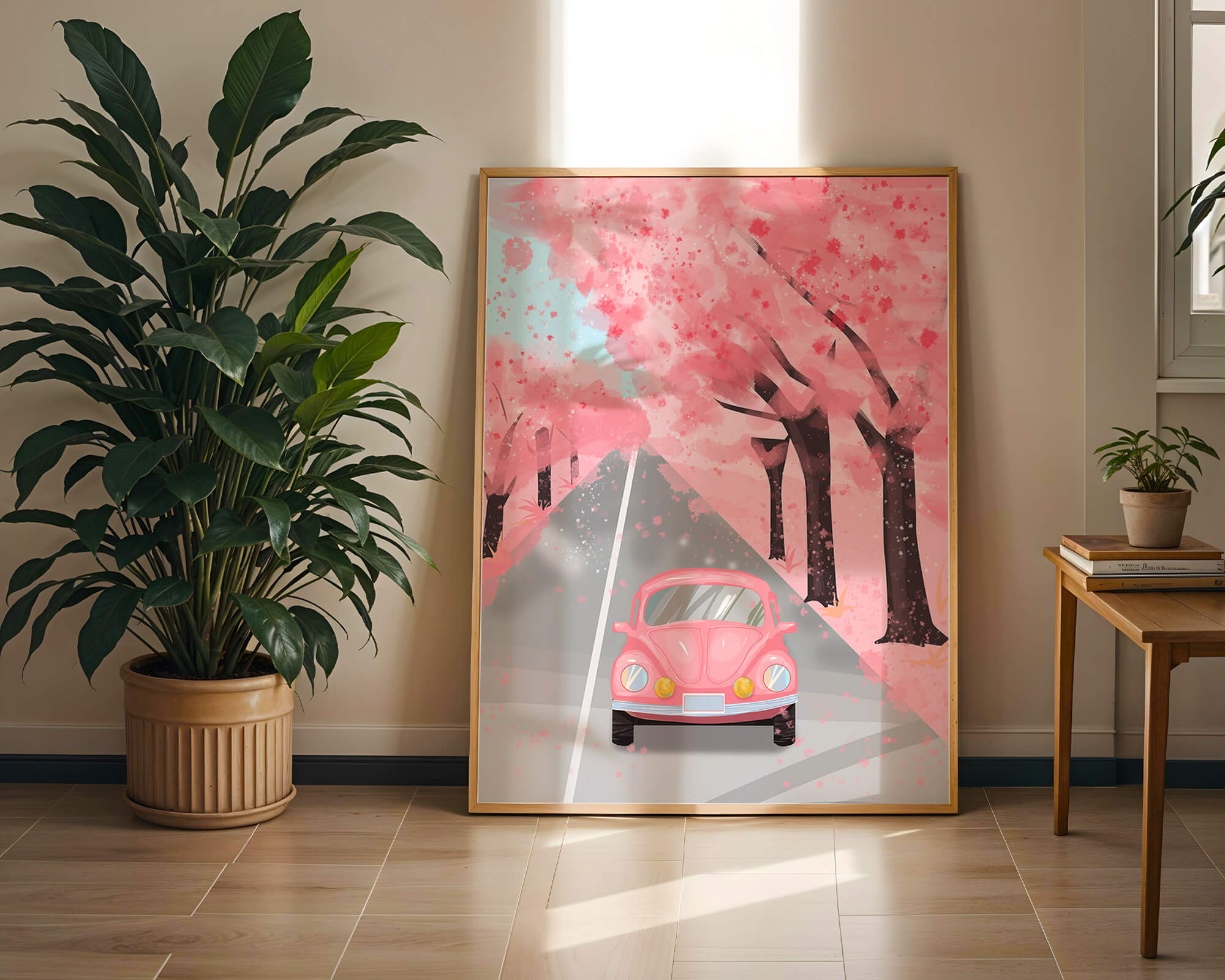 La imagen presenta una escena encantadora con un coche vintage rosa conduciendo por una carretera bordeada de árboles de cerezo en plena floración. Los vibrantes tonos rosas crean una atmósfera onírica y caprichosa, perfecta para evocar la belleza de la primavera.