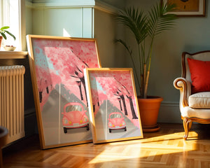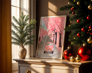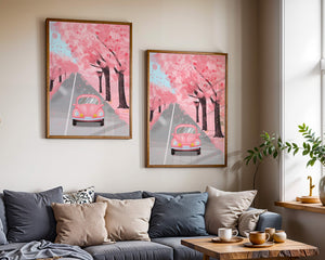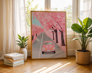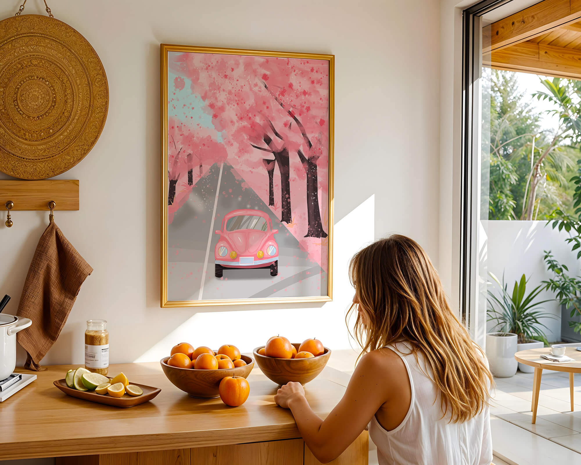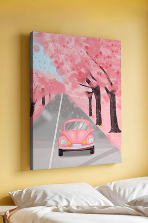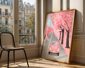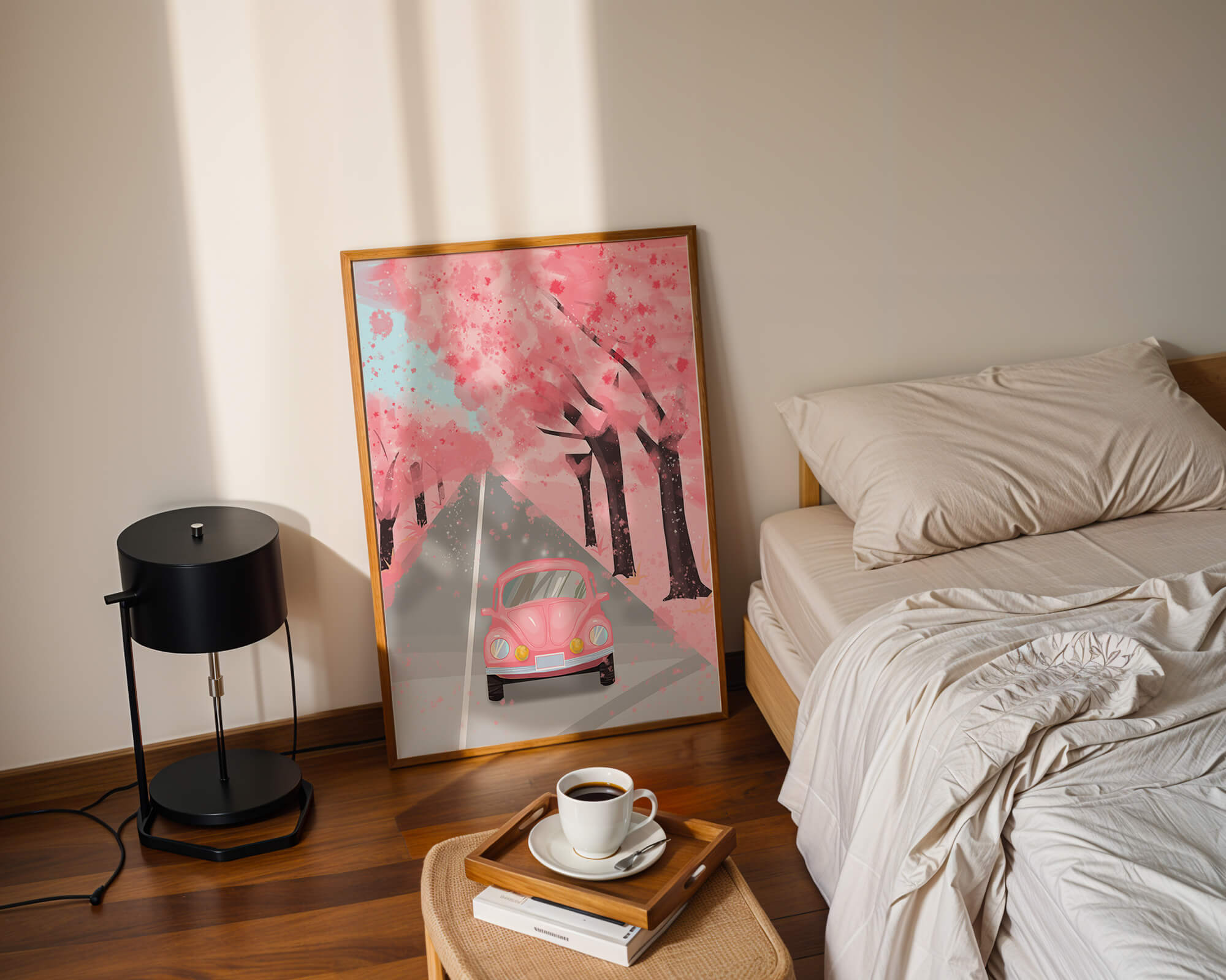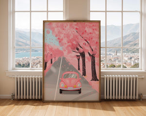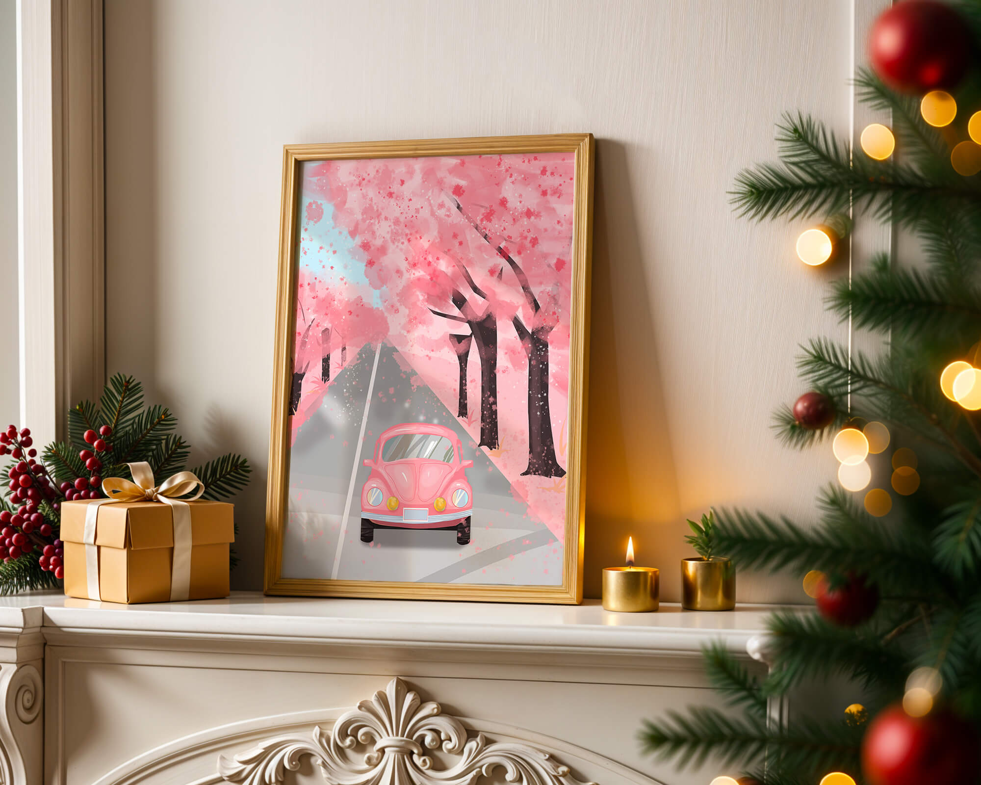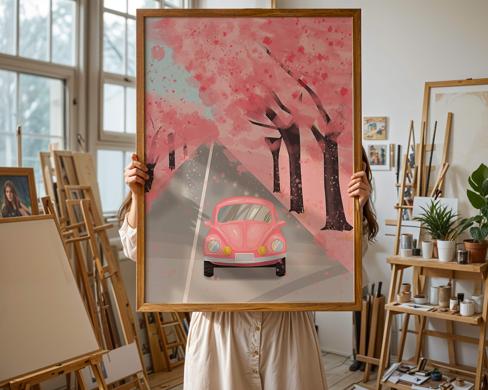 La imagen presenta una escena encantadora con un coche vintage rosa conduciendo por una carretera bordeada de árboles de cerezo en plena floración. Los vibrantes tonos rosas crean una atmósfera onírica y caprichosa, perfecta para evocar la belleza de la primavera.