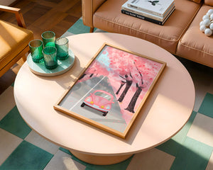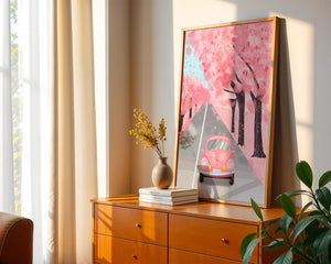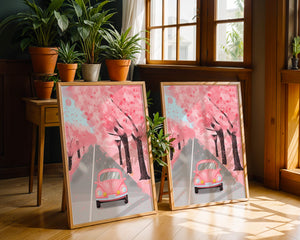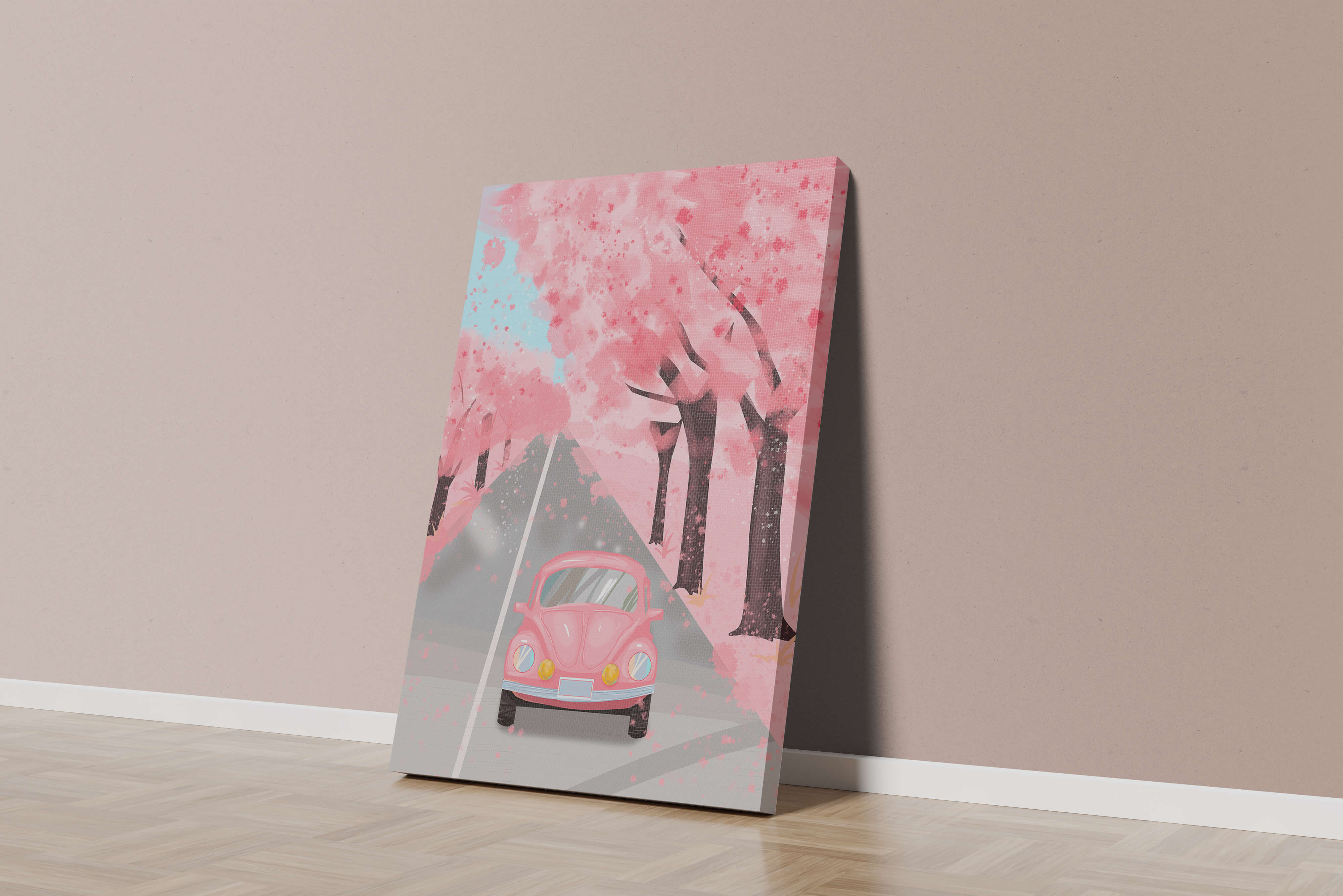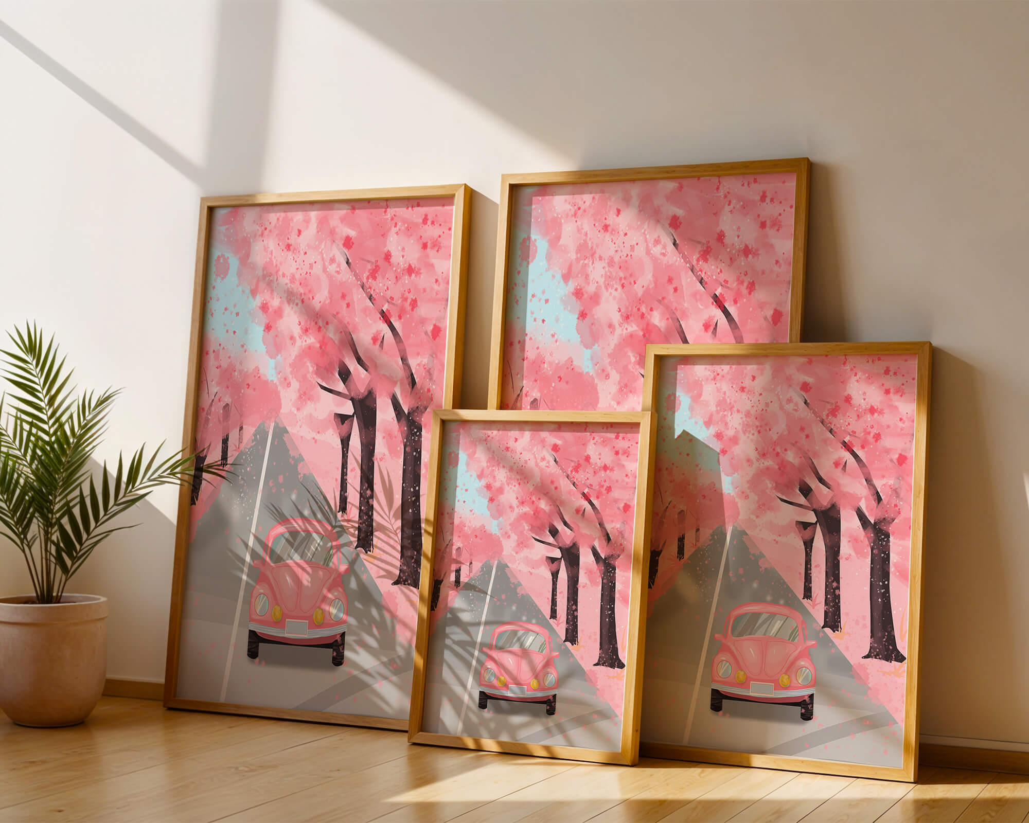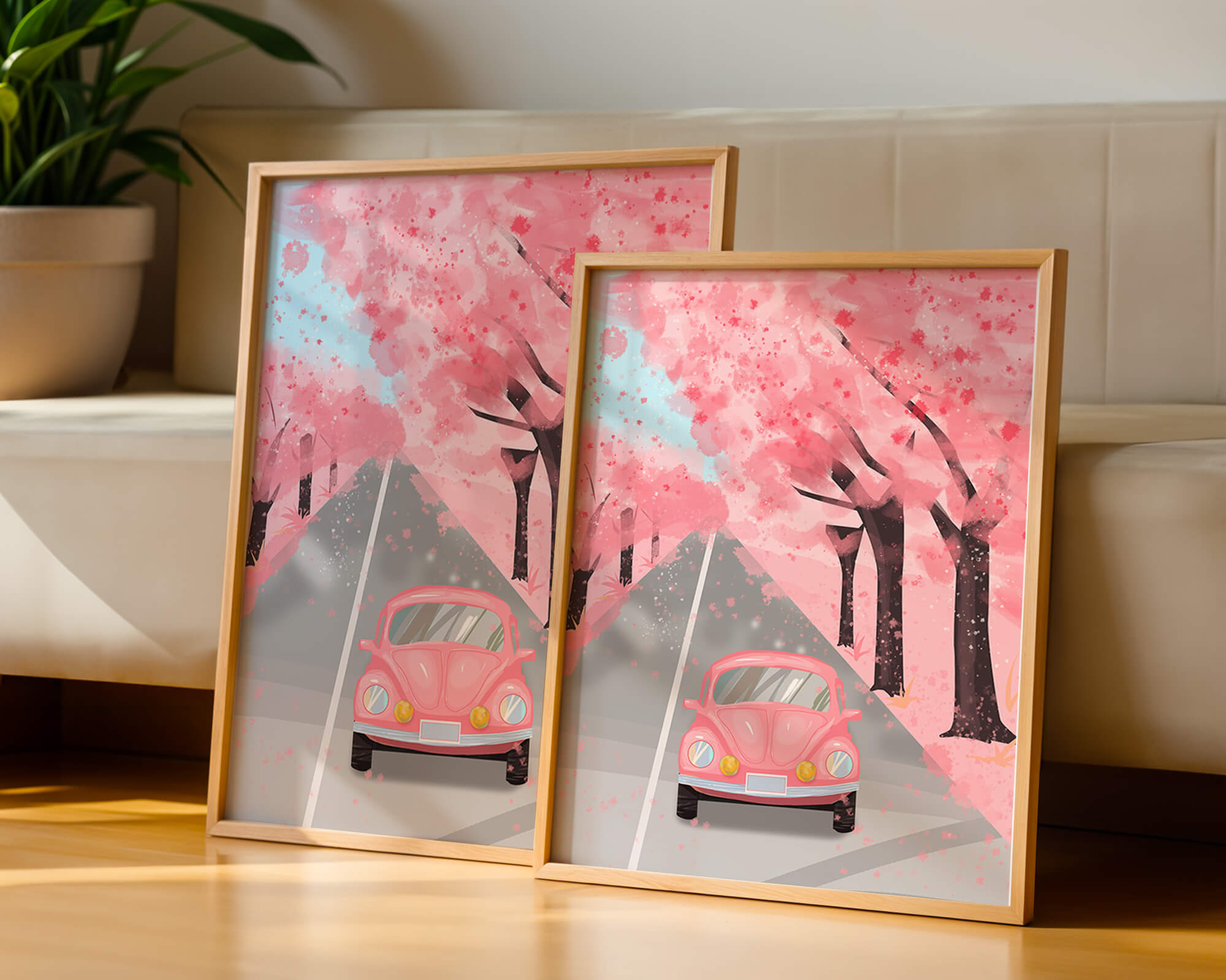En esta deliciosa escena, el espectador es transportado a una carretera pintoresca donde el encanto de los cerezos en flor cautiva los sentidos. El diseño clásico del coche vintage añade un toque nostálgico, fusionándose sin esfuerzo con la belleza natural que lo rodea. Las flores rosadas crean un llamativo contraste contra el cielo azul claro, mejorando el atractivo visual general. A medida que el coche avanza por este paisaje encantador, los pétalos parecen danzar en la suave brisa, esparciéndose por la carretera. Esta ilustración captura la esencia de un tranquilo paseo a través de maravillas en flor, convirtiéndola en una pieza ideal para aquellos que aprecian la serenidad y la alegría que se encuentran en las maravillas de la naturaleza.| Tipo |
