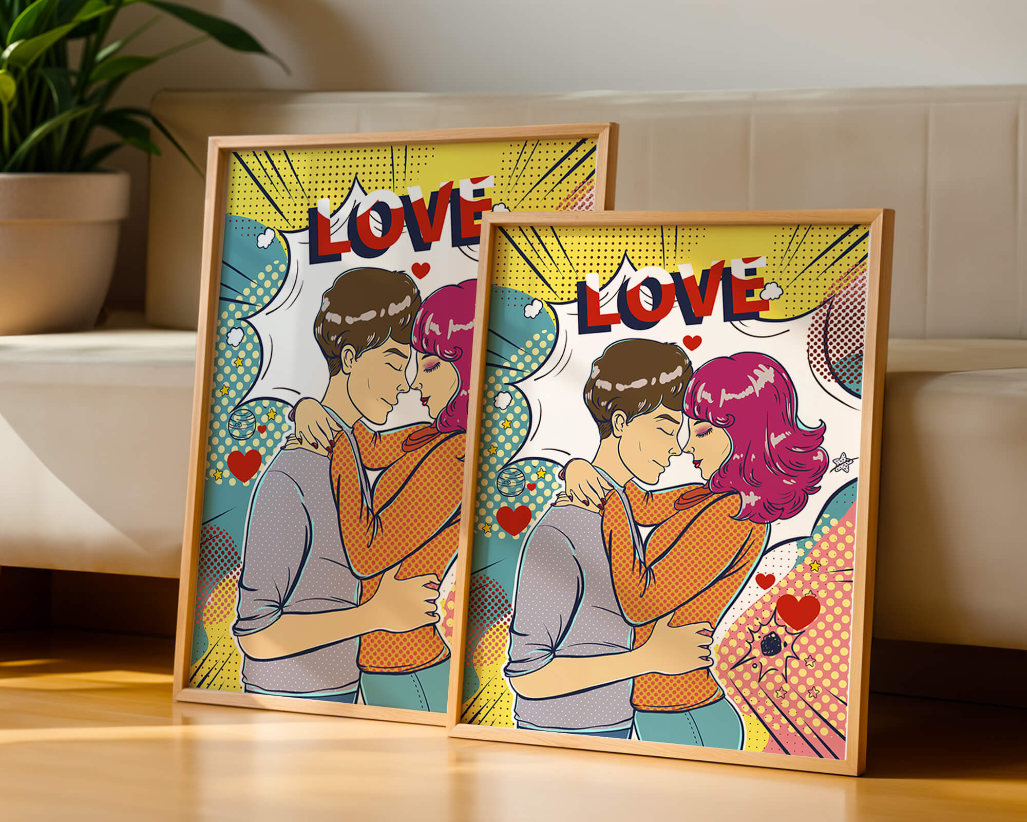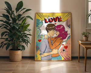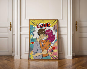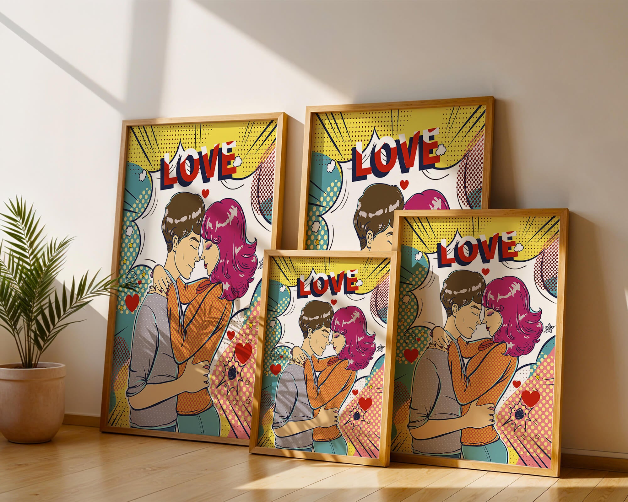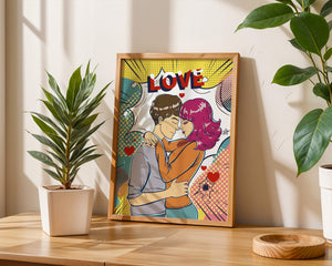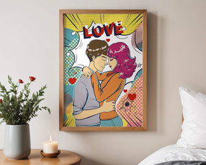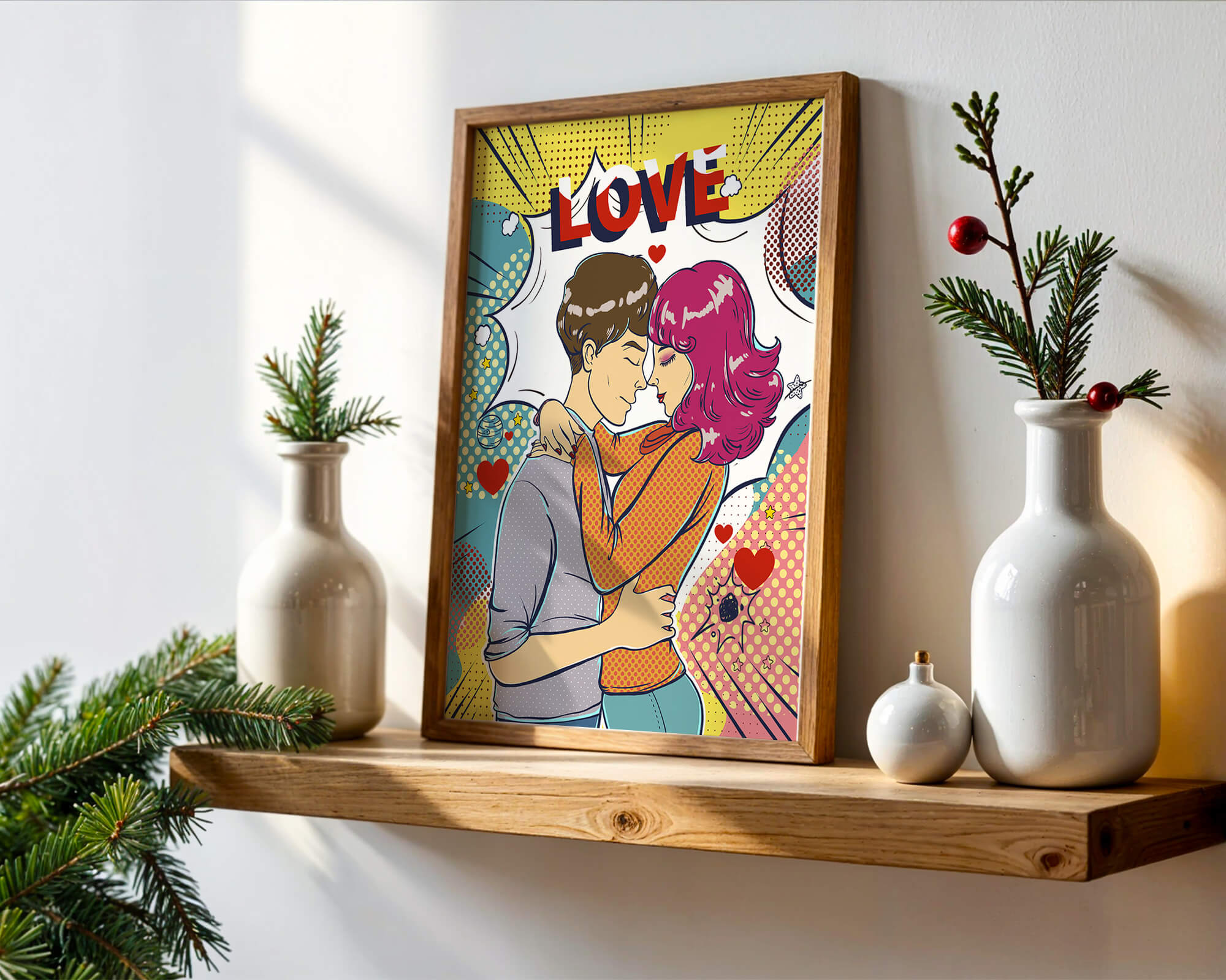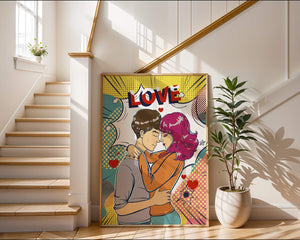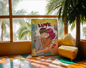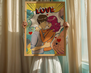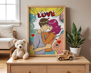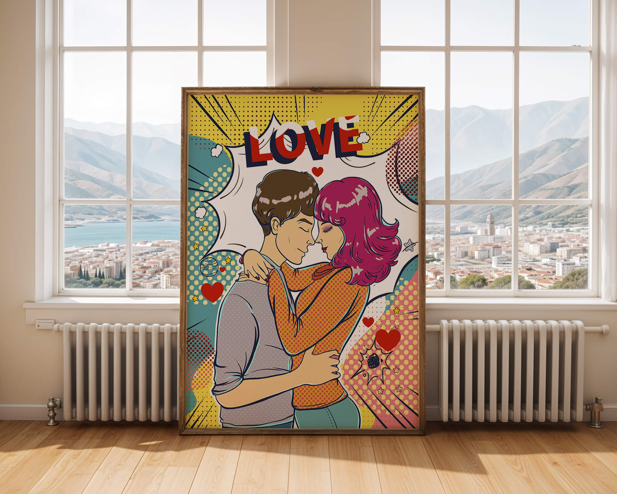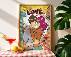 Esta vibrante ilustración captura la esencia del romance con un toque de arte pop. Una pareja se abraza con amor, sobre un colorido fondo al estilo de cómic, con la palabra "LOVE" destacada prominentemente.