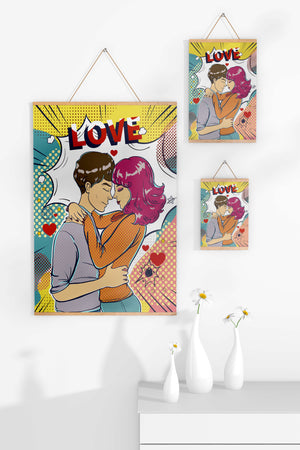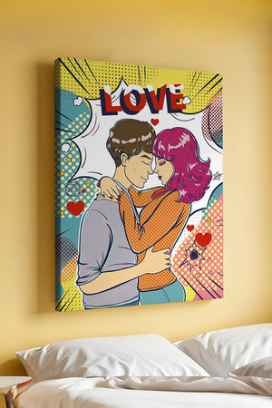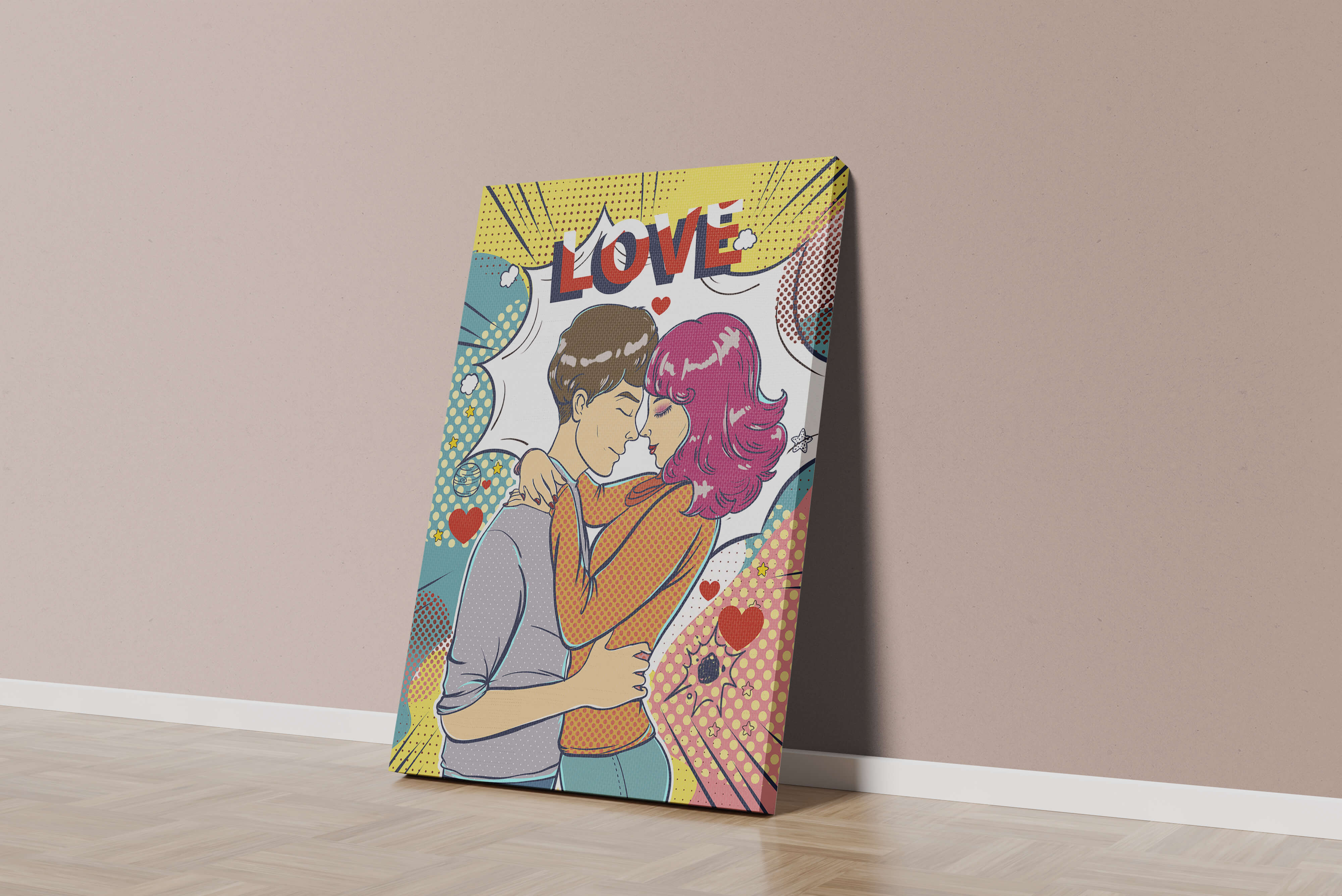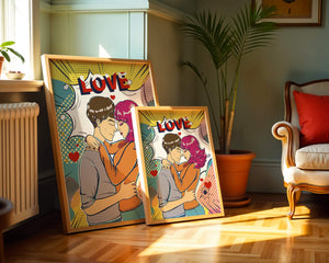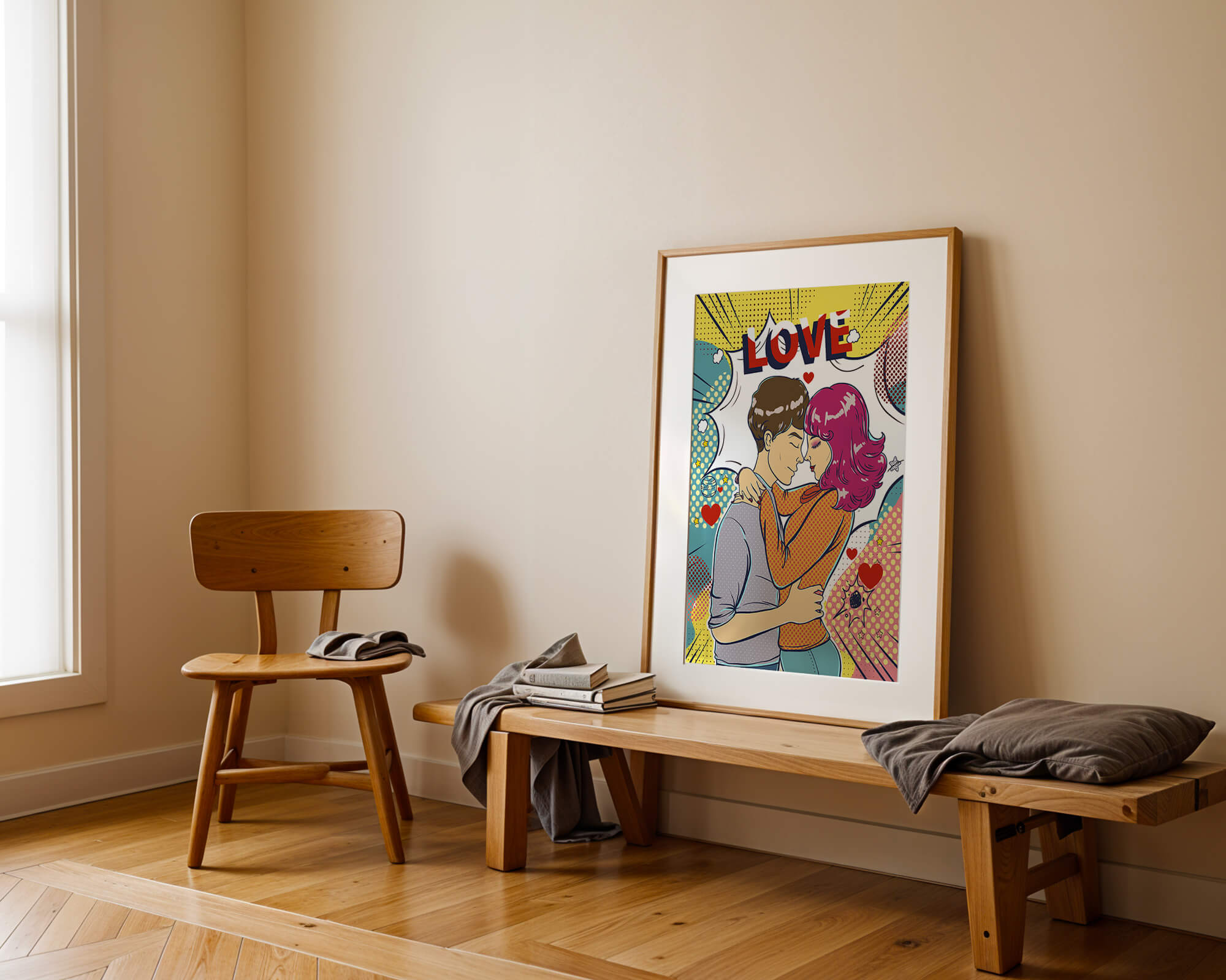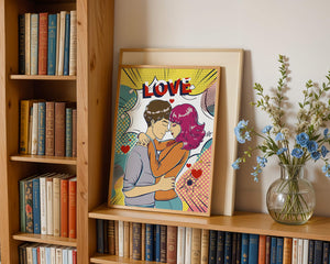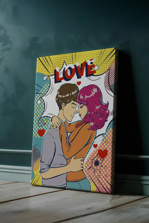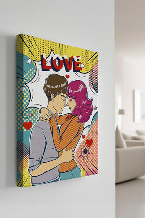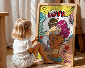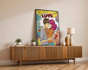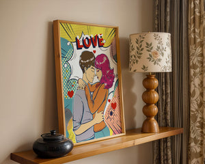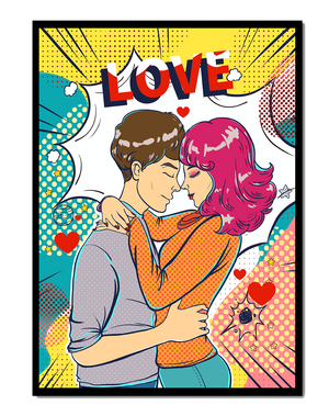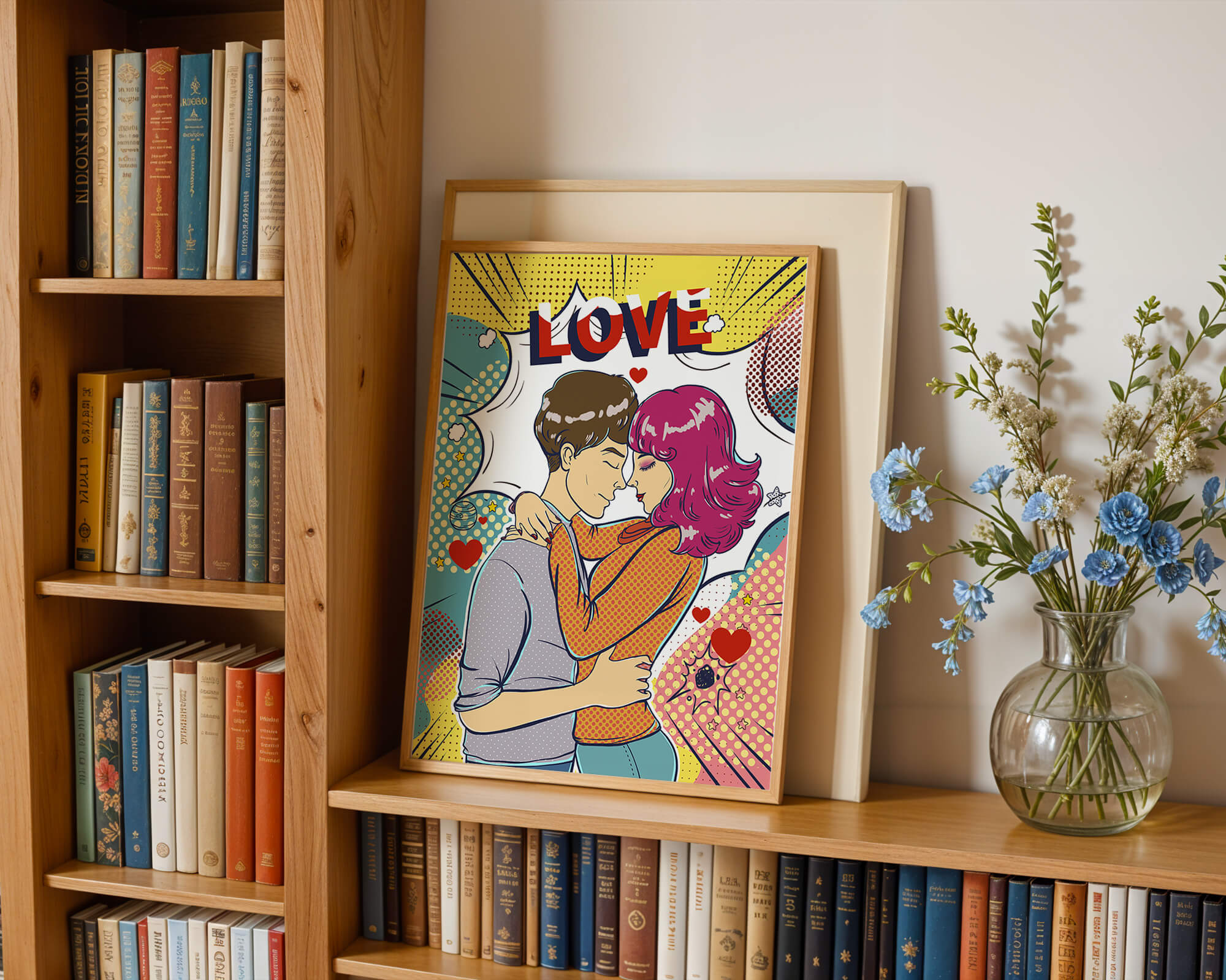 Esta vibrante ilustración captura la esencia del romance con un toque de arte pop. Una pareja se abraza con amor, sobre un colorido fondo al estilo de cómic, con la palabra "LOVE" destacada prominentemente.