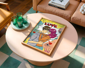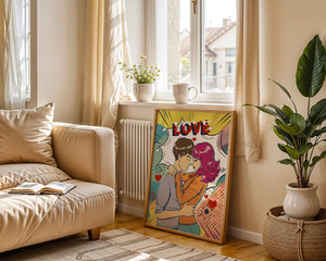 El fondo está lleno de tonos vibrantes de amarillo, azul y rojo, entrelazados con estilos retro de cómic. El uso de lunares y líneas vivas añade un toque caprichoso, haciendo que la obra de arte no solo sea una declaración de amor, sino también una celebración del arte en sí mismo. Perfecto para aquellos que aprecian diseños coloridos y expresivos.