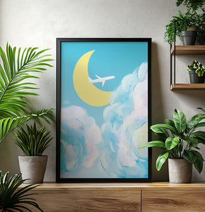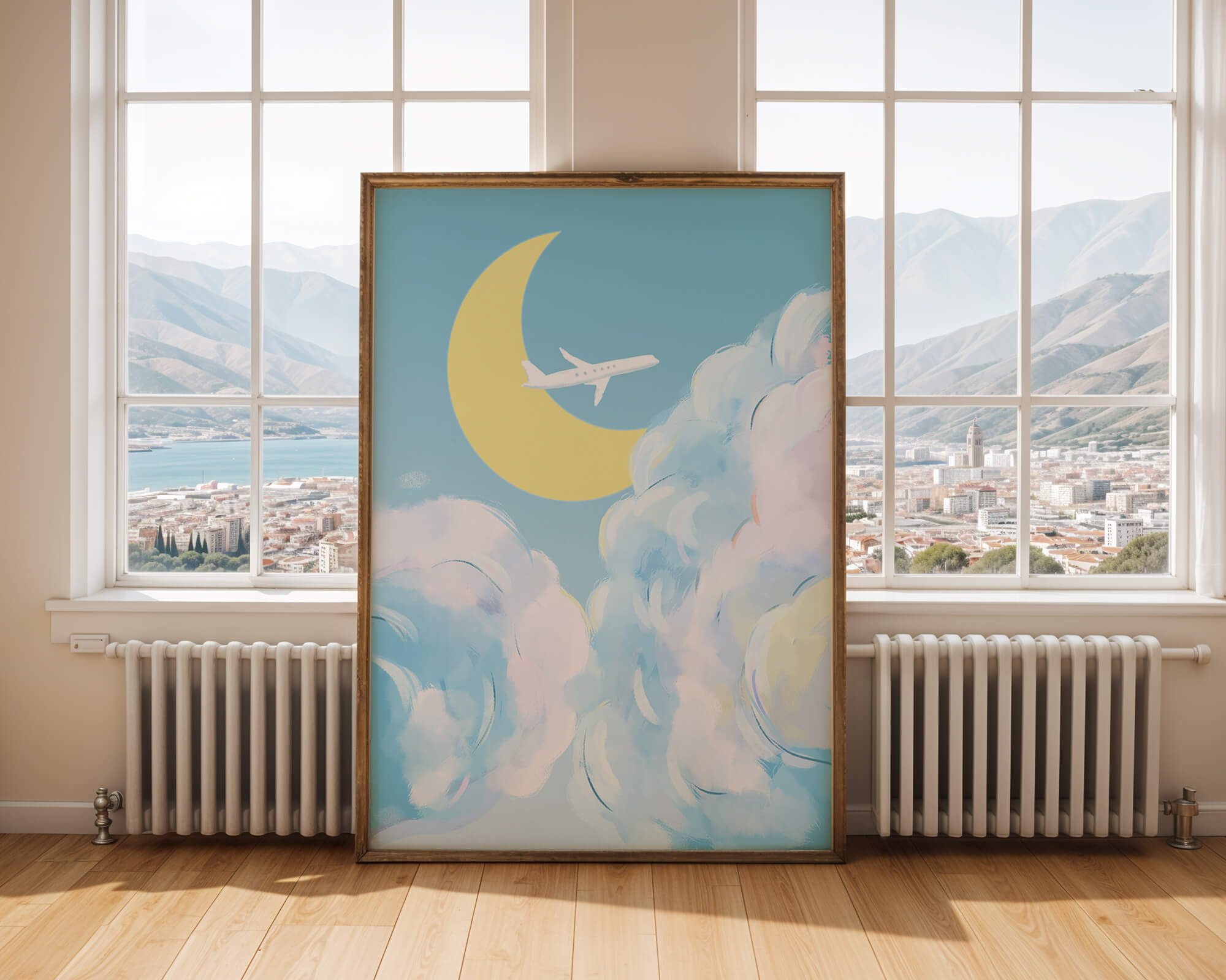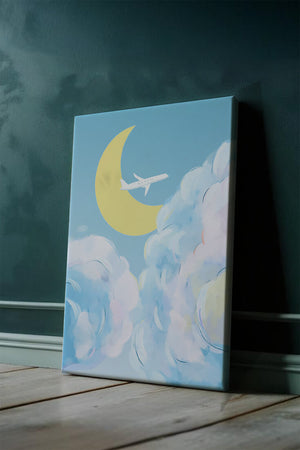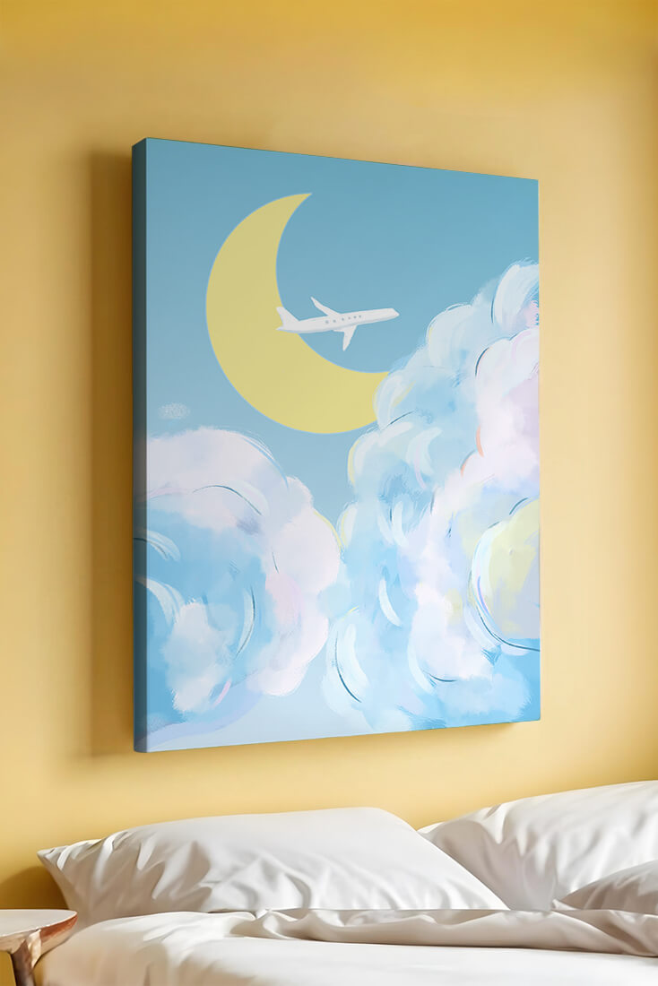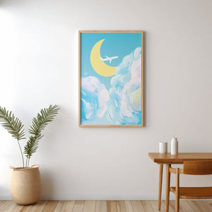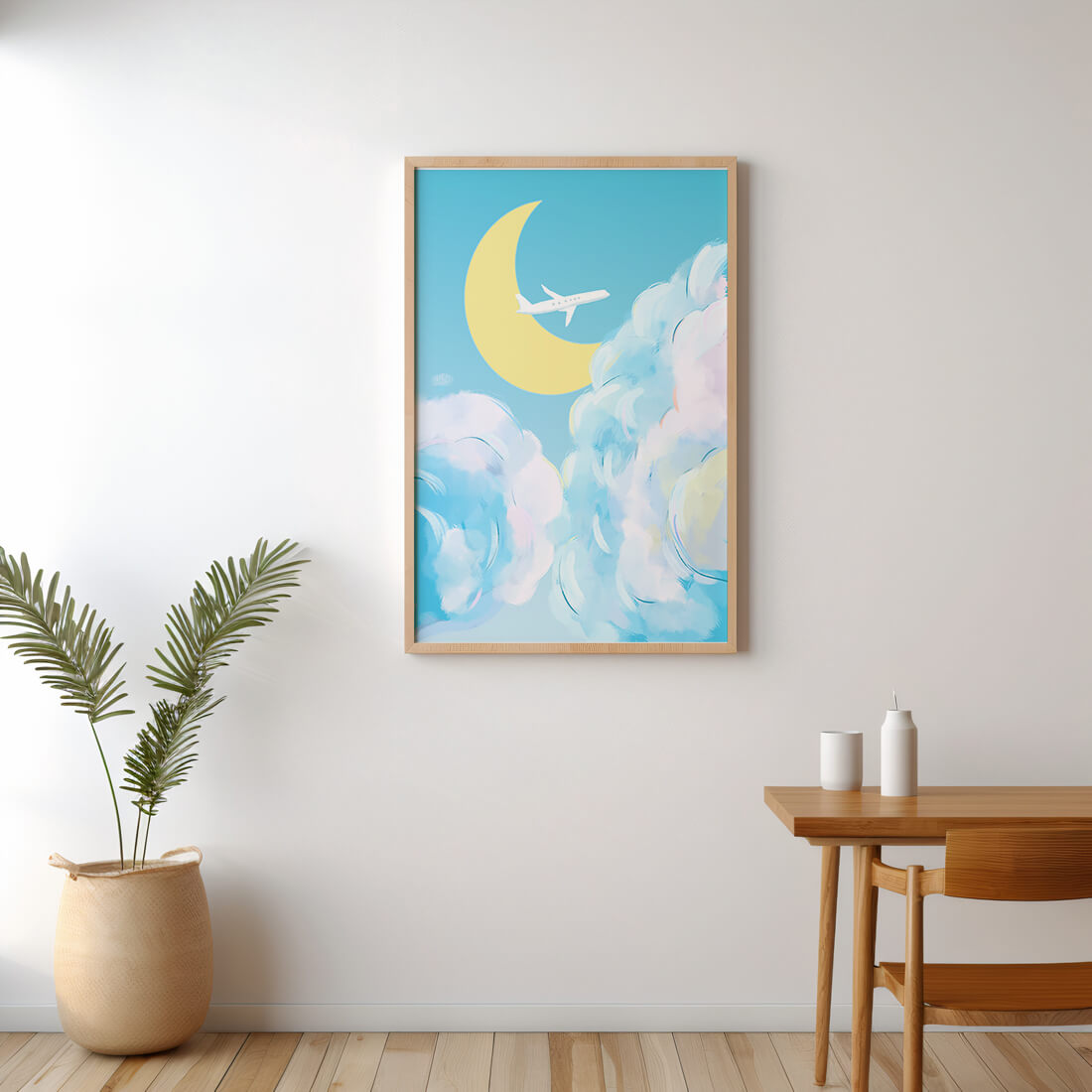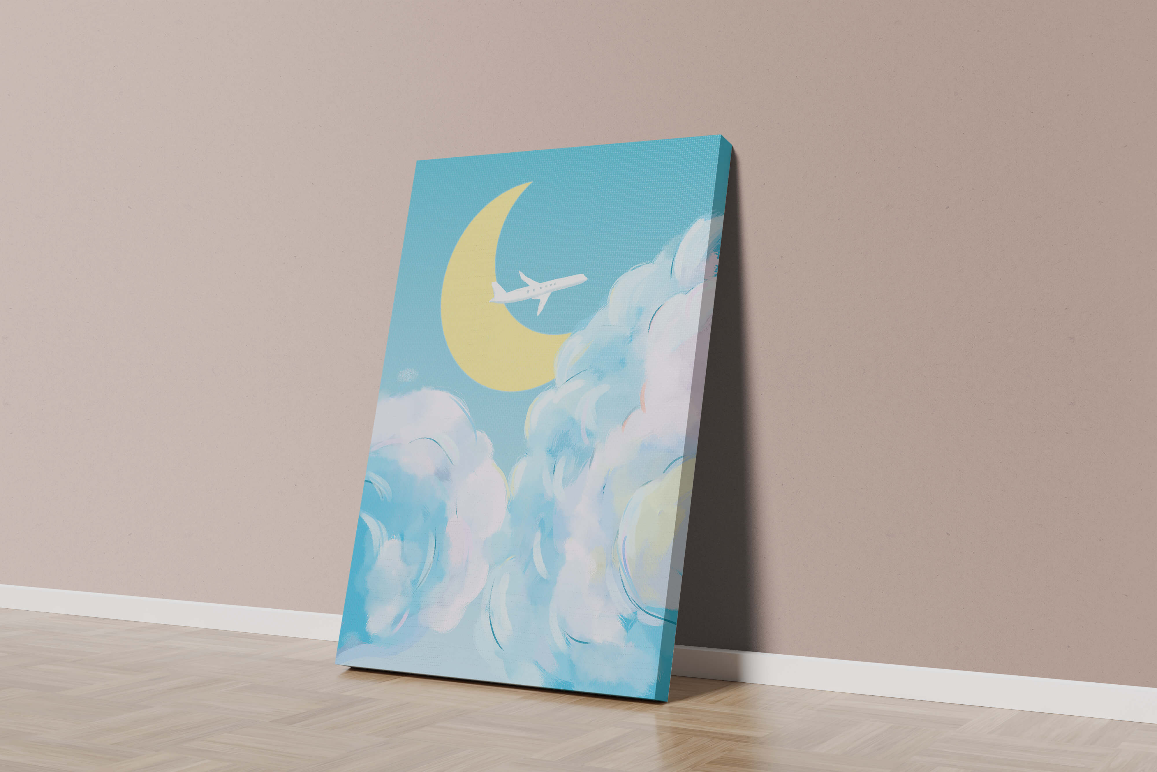 Esta cautivadora ilustración representa un cielo onírico donde la imaginación despega. Un avión blanco se desliza sin esfuerzo por los pálidos cielos azules, flanqueado por suaves nubes parecidas al algodón que parecen susurrar historias de viajes y exploración. La luna creciente emite un suave resplandor amarillo, añadiendo al ambiente mágico de la escena. Perfecto para una habitación infantil o una guardería, esta obra de arte transmite calma e inspiración. La paleta de colores pastel y los elementos caprichosos crean una atmósfera encantadora, convirtiéndola en una pieza ideal para aquellos que aprecian la belleza del cielo y el atractivo de la aventura.| Tipo |
