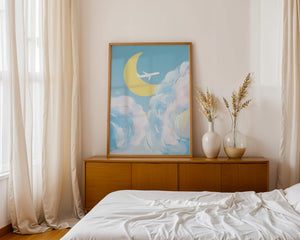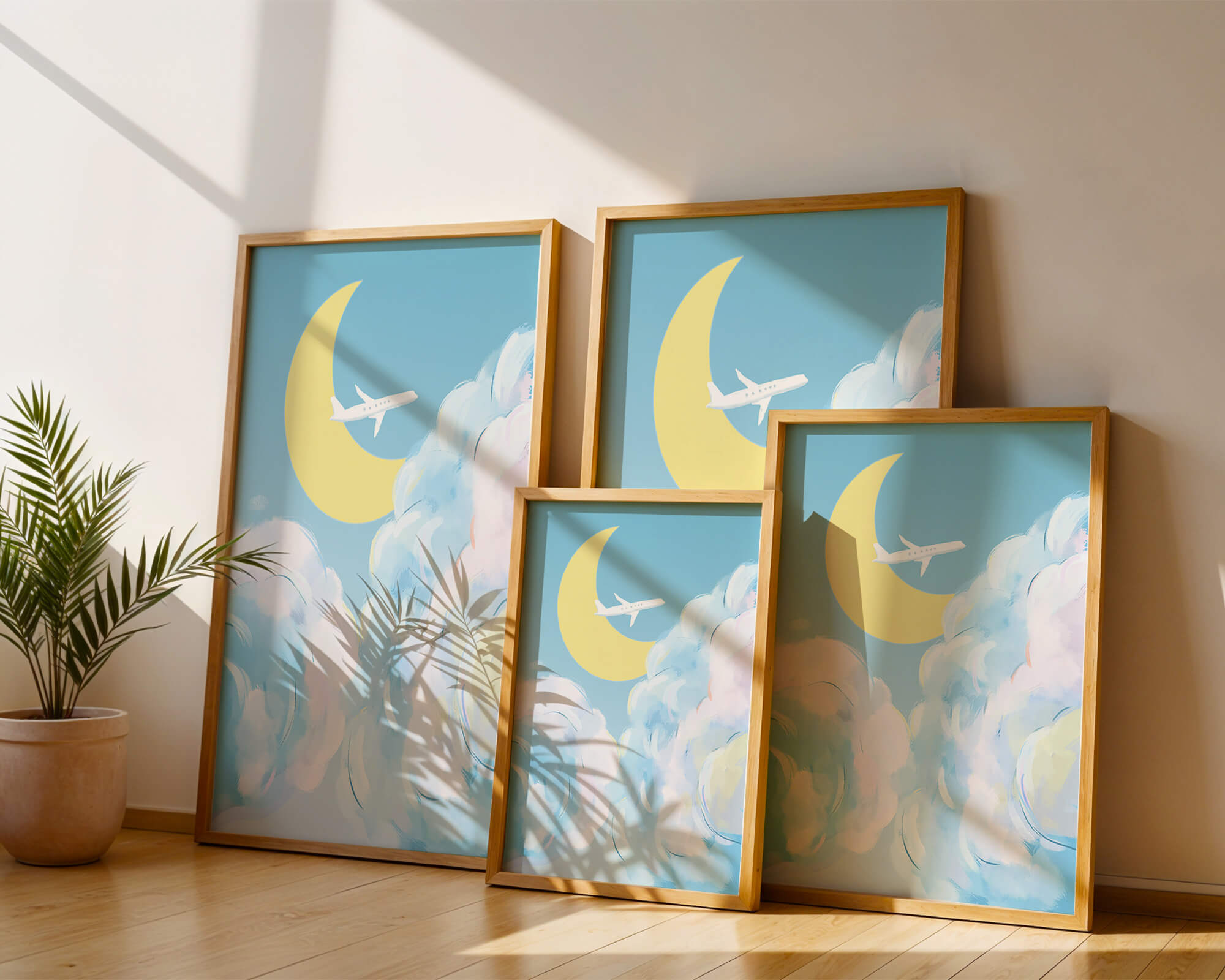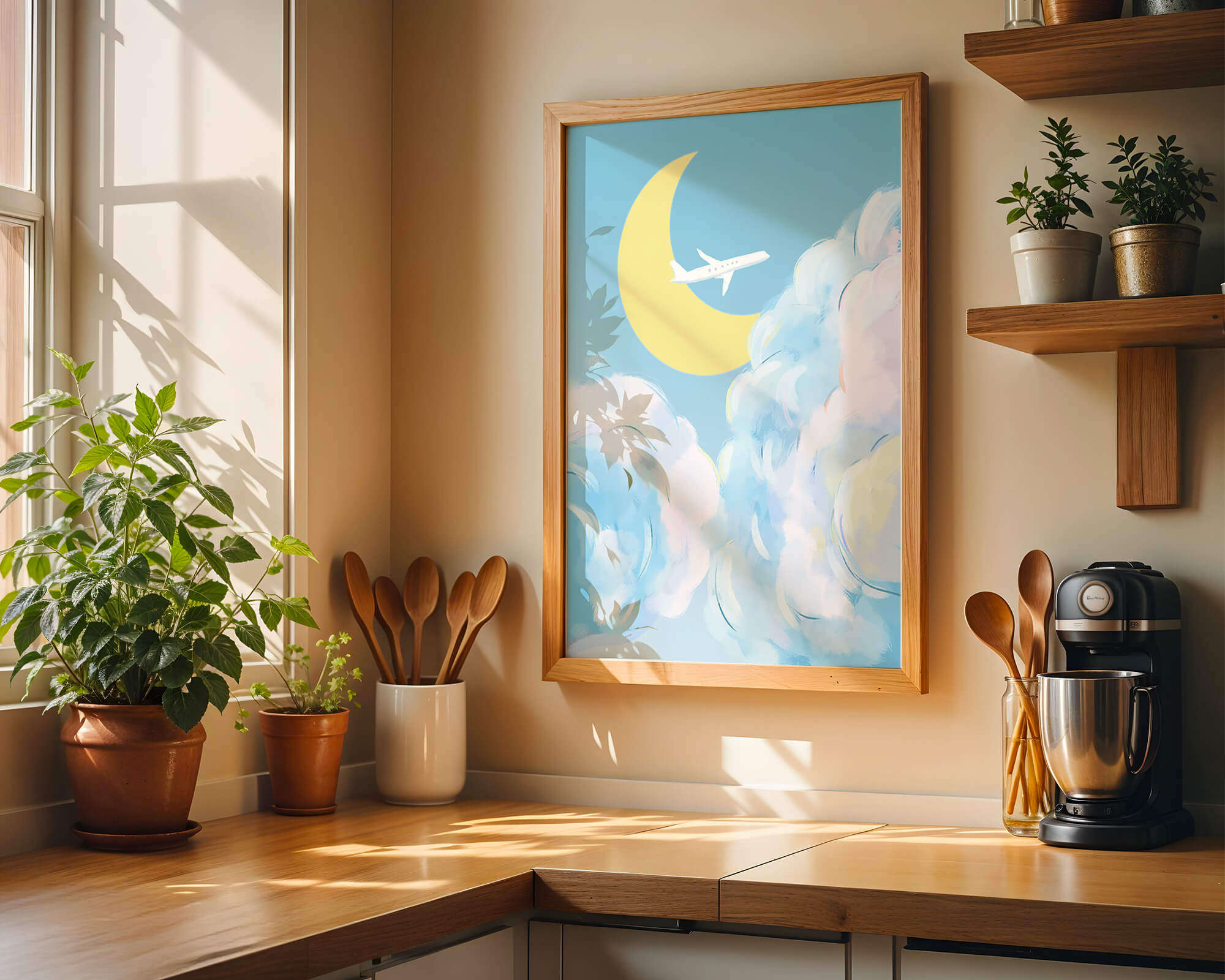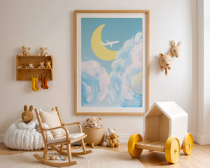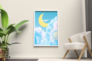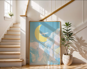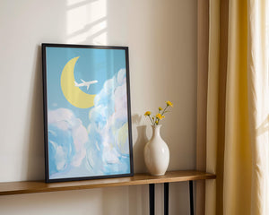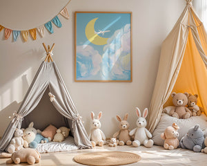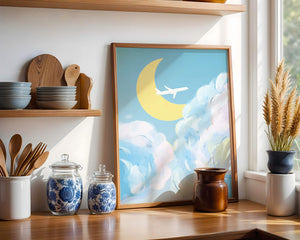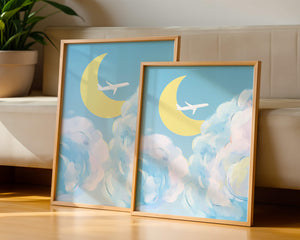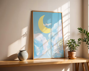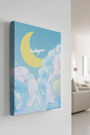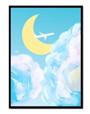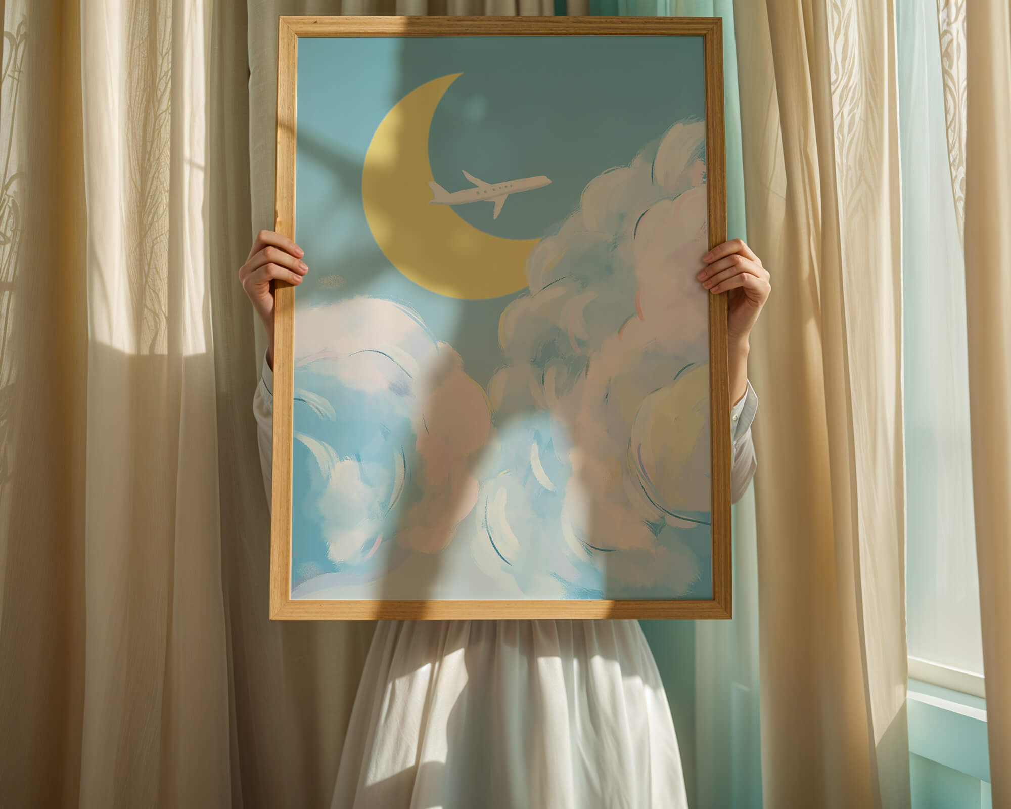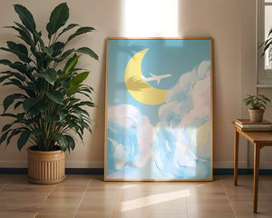 Esta cautivadora ilustración representa un cielo onírico donde la imaginación despega. Un avión blanco se desliza sin esfuerzo por los pálidos cielos azules, flanqueado por suaves nubes parecidas al algodón que parecen susurrar historias de viajes y exploración. La luna creciente emite un suave resplandor amarillo, añadiendo al ambiente mágico de la escena. Perfecto para una habitación infantil o una guardería, esta obra de arte transmite calma e inspiración. La paleta de colores pastel y los elementos caprichosos crean una atmósfera encantadora, convirtiéndola en una pieza ideal para aquellos que aprecian la belleza del cielo y el atractivo de la aventura.| Tipo |