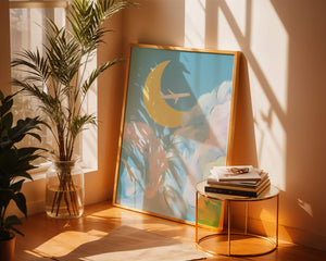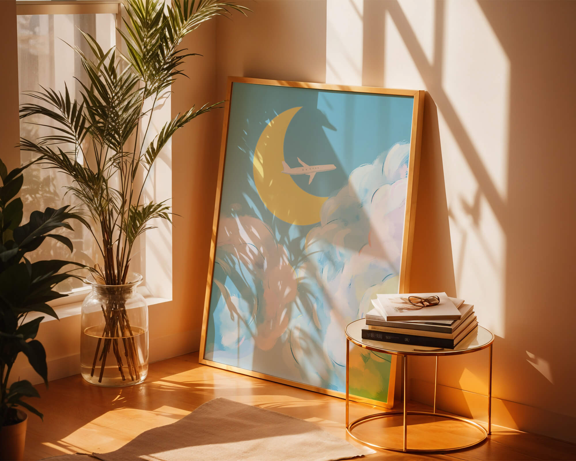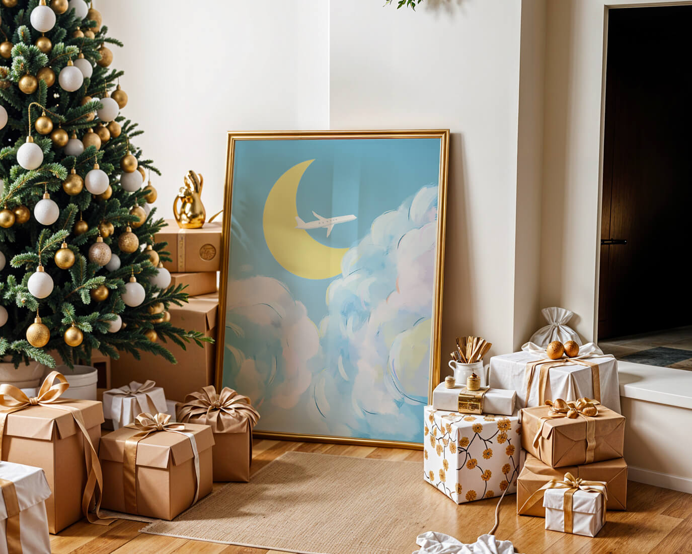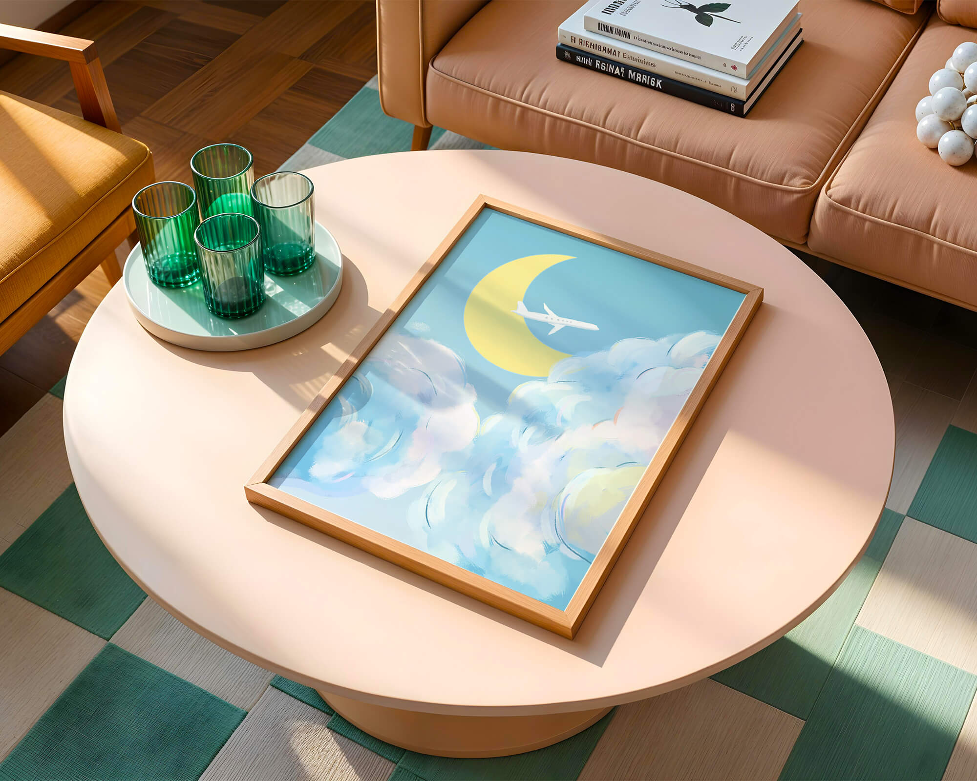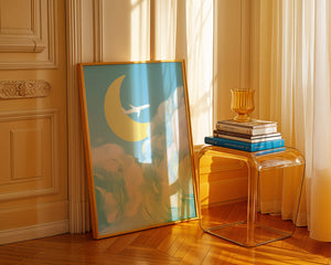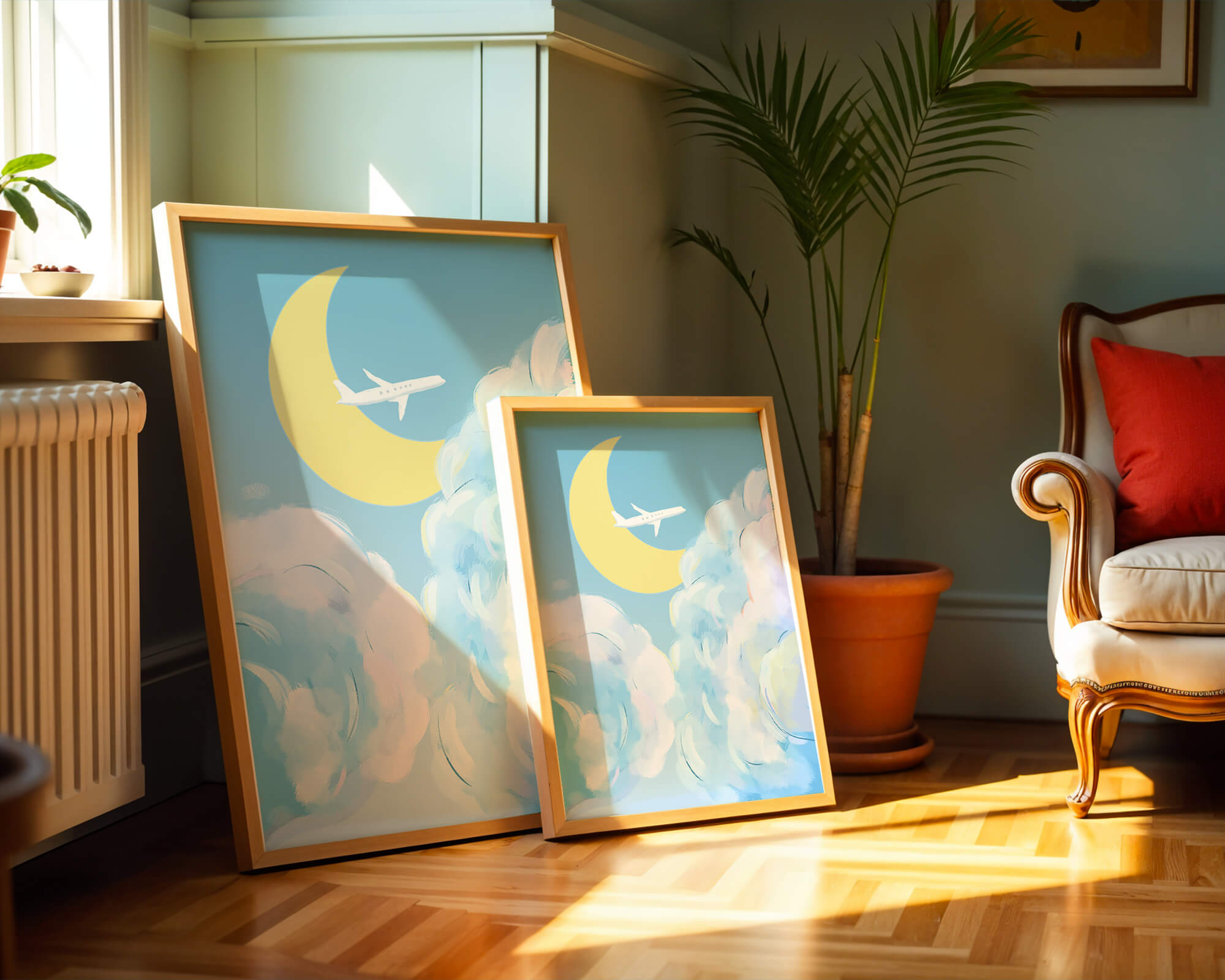 Esta cautivadora ilustración representa un cielo onírico donde la imaginación despega. Un avión blanco se desliza sin esfuerzo por los pálidos cielos azules, flanqueado por suaves nubes parecidas al algodón que parecen susurrar historias de viajes y exploración. La luna creciente emite un suave resplandor amarillo, añadiendo al ambiente mágico de la escena. Perfecto para una habitación infantil o una guardería, esta obra de arte transmite calma e inspiración. La paleta de colores pastel y los elementos caprichosos crean una atmósfera encantadora, convirtiéndola en una pieza ideal para aquellos que aprecian la belleza del cielo y el atractivo de la aventura.| Tipo |
