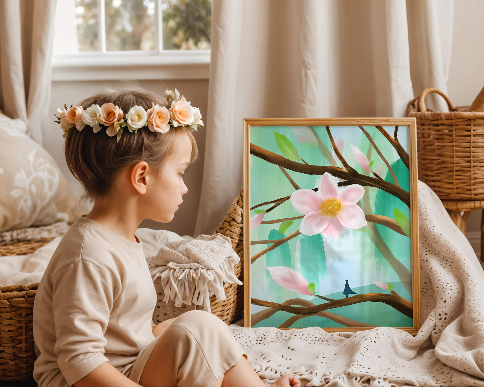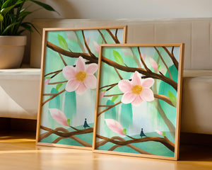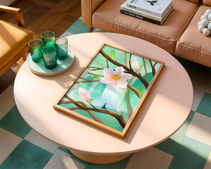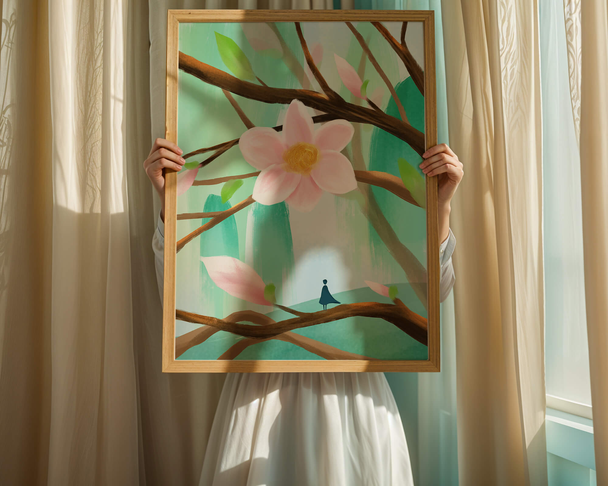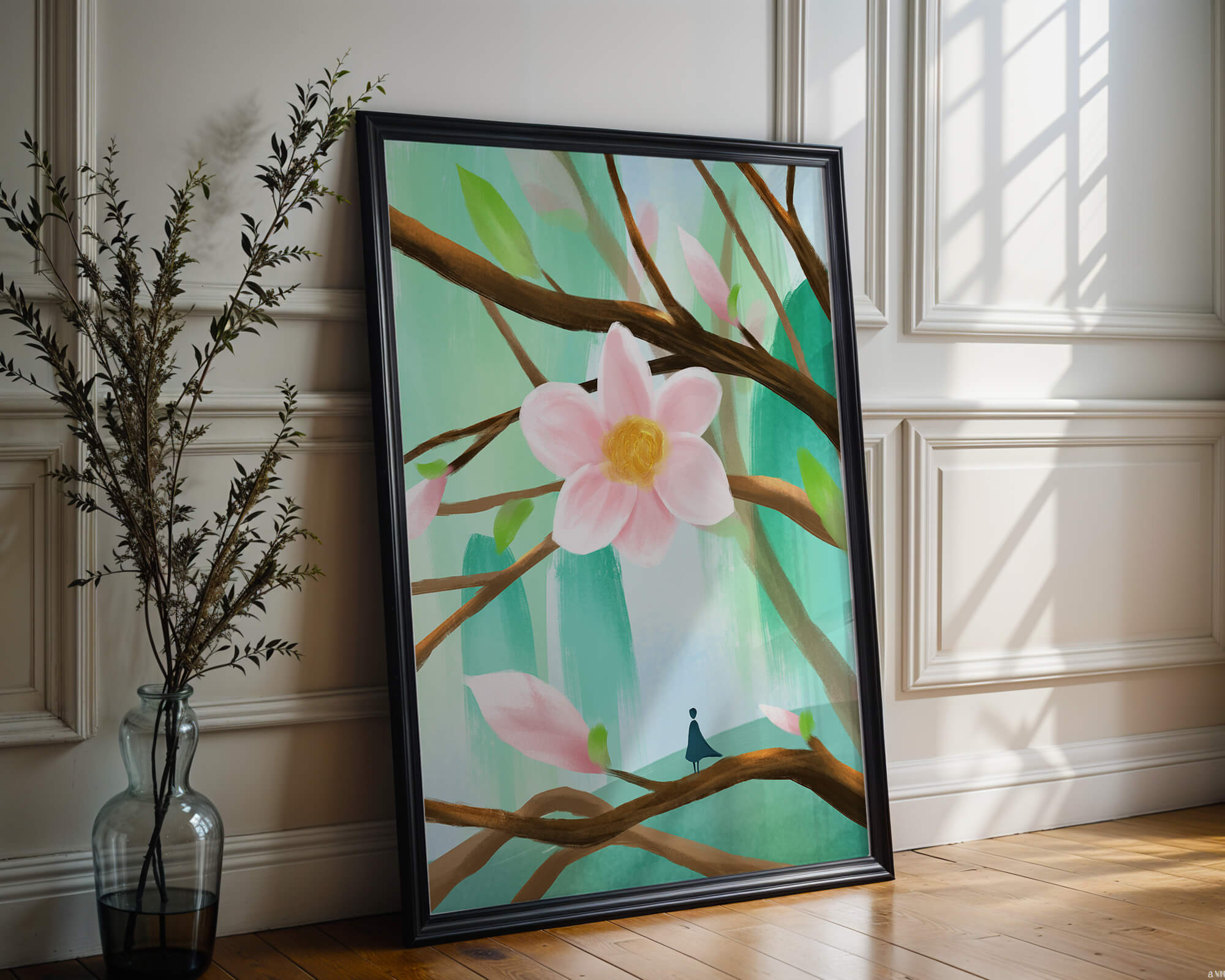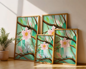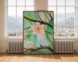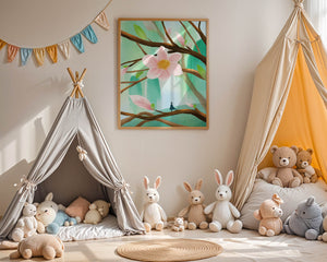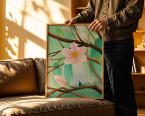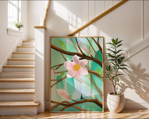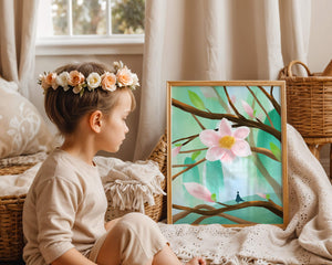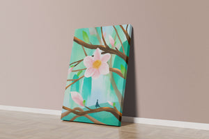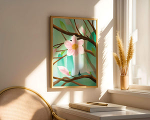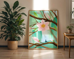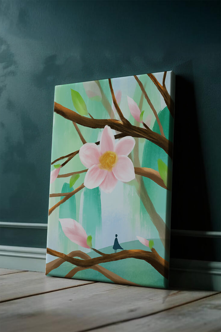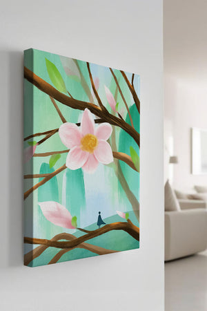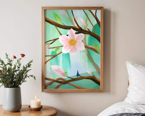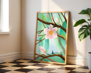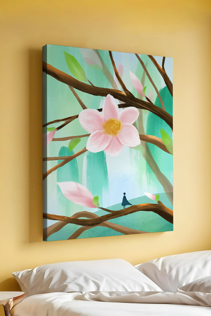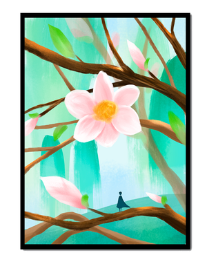 La obra captura la esencia de la tranquilidad con su paleta de colores pasteles y formas orgánicas. El foco central es una gran flor rosa suave con un centro de amarillo dorado, atrayendo la atención del espectador con su suave encanto. Rodeada de flores en capullo y hojas verdes frescas, la composición crea una escena al aire libre refrescante y pacífica, evocando una sensación de renovación y belleza natural. Esta pieza es ideal para aquellos que buscan añadir un toque de elegancia natural a sus espacios habitables. La representación de la figura parada sobre una rama sugiere una relación pequeña e íntima con la naturaleza, mejorando la calidad general de ensueño. Ya sea exhibida en una sala de estar o dormitorio, esta ilustración trae la apacible calma de la naturaleza al interior, convirtiéndola en una adición perfecta para crear una atmósfera serena.| Tipo |