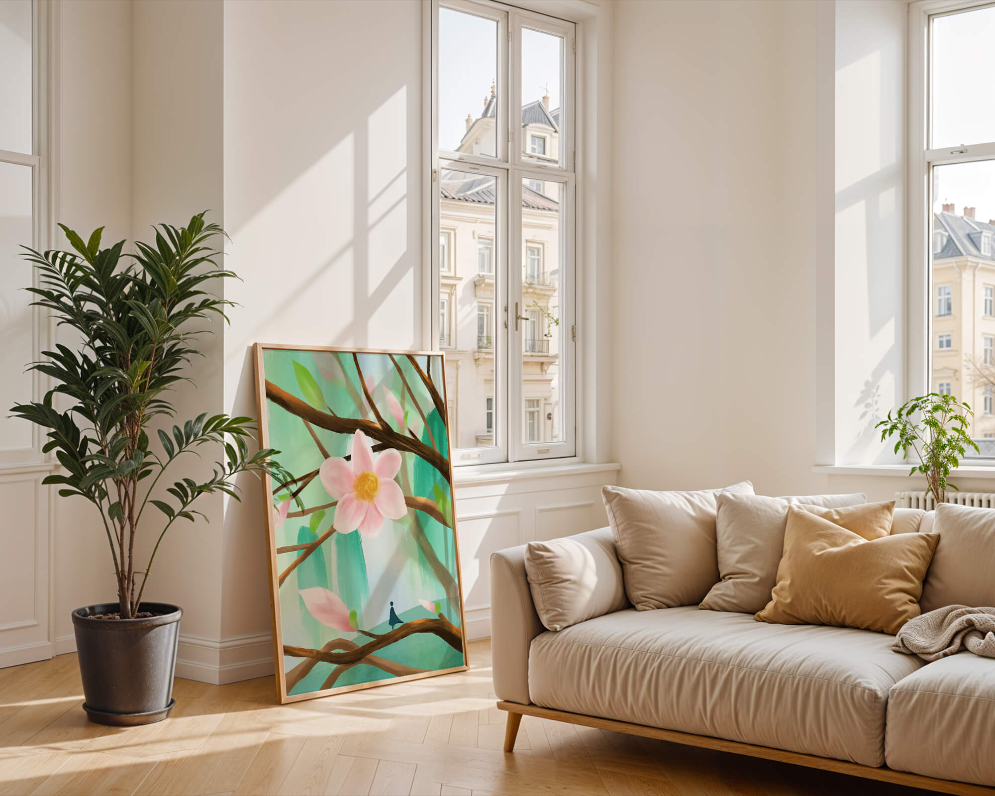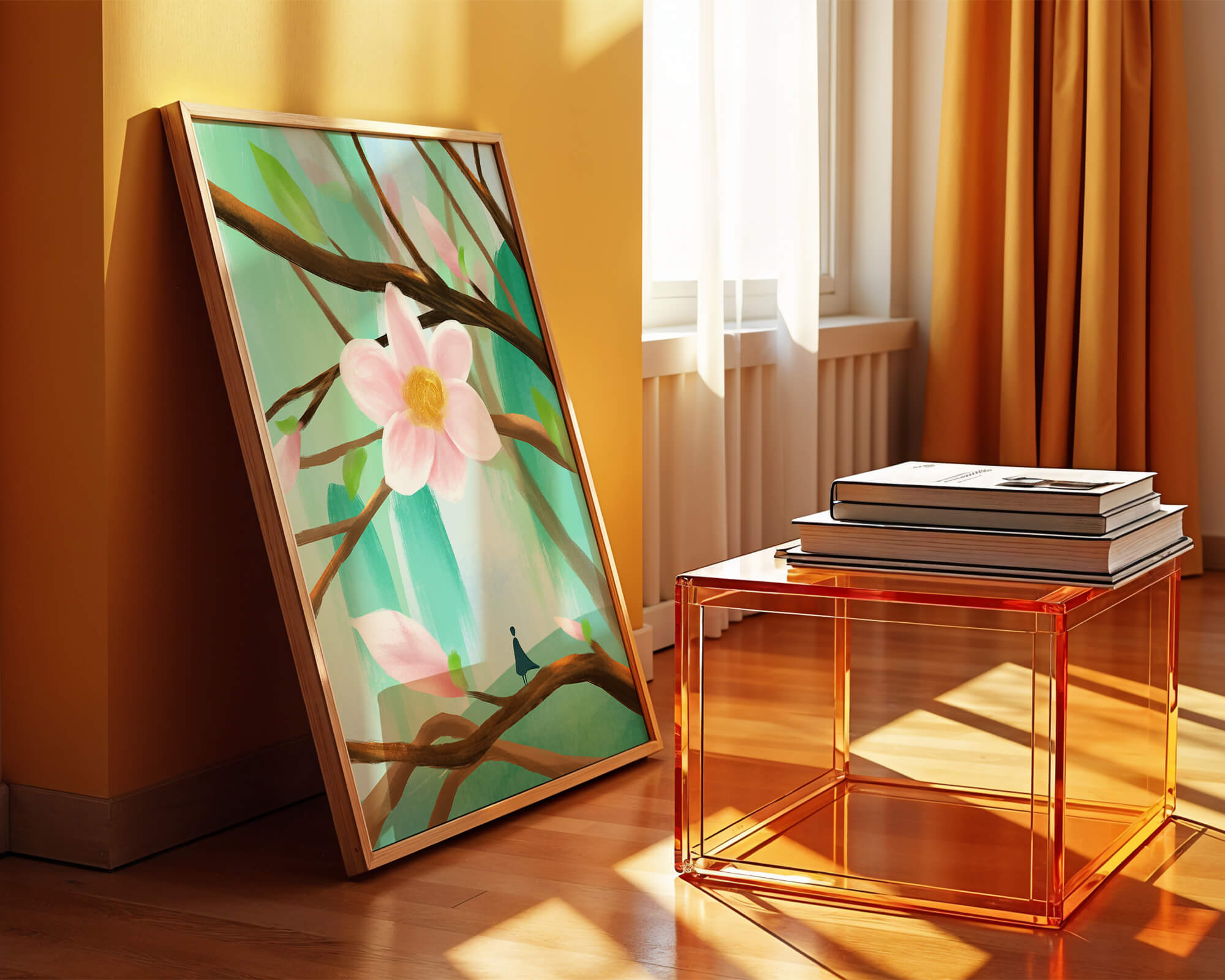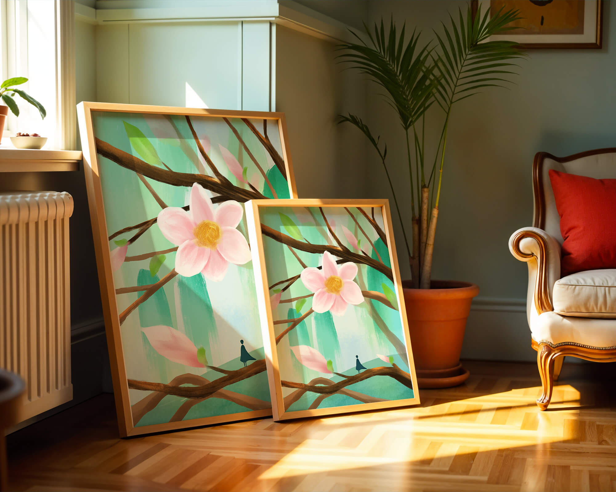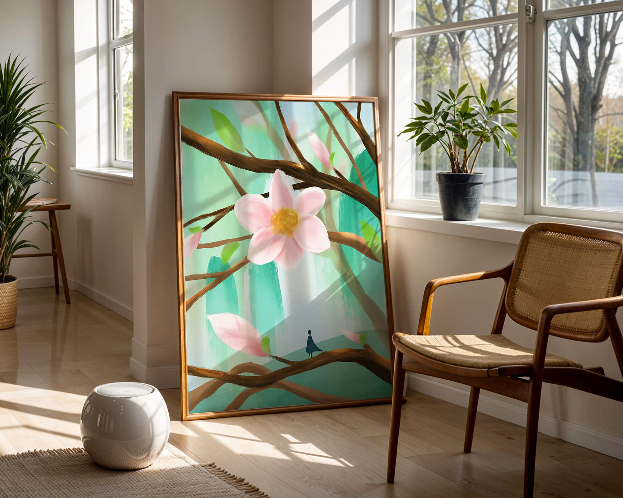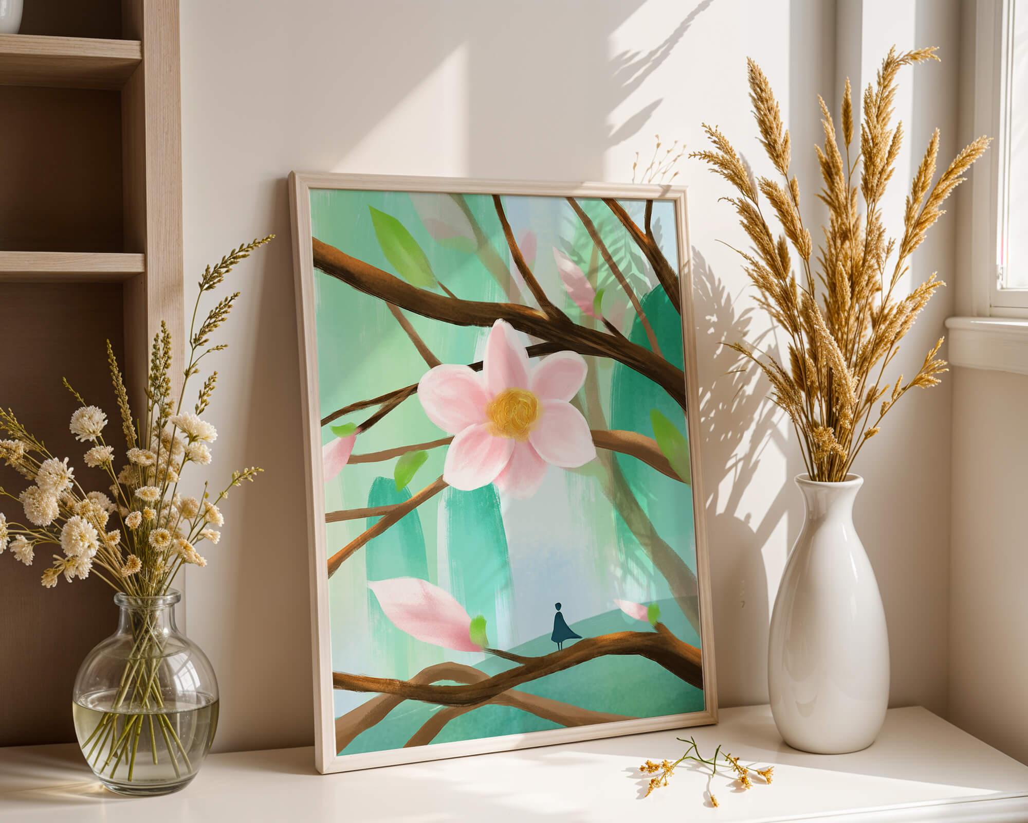 La obra captura la esencia de la tranquilidad con su paleta de colores pasteles y formas orgánicas. El foco central es una gran flor rosa suave con un centro de amarillo dorado, atrayendo la atención del espectador con su suave encanto. Rodeada de flores en capullo y hojas verdes frescas, la composición crea una escena al aire libre refrescante y pacífica, evocando una sensación de renovación y belleza natural. Esta pieza es ideal para aquellos que buscan añadir un toque de elegancia natural a sus espacios habitables. La representación de la figura parada sobre una rama sugiere una relación pequeña e íntima con la naturaleza, mejorando la calidad general de ensueño. Ya sea exhibida en una sala de estar o dormitorio, esta ilustración trae la apacible calma de la naturaleza al interior, convirtiéndola en una adición perfecta para crear una atmósfera serena.| Tipo |